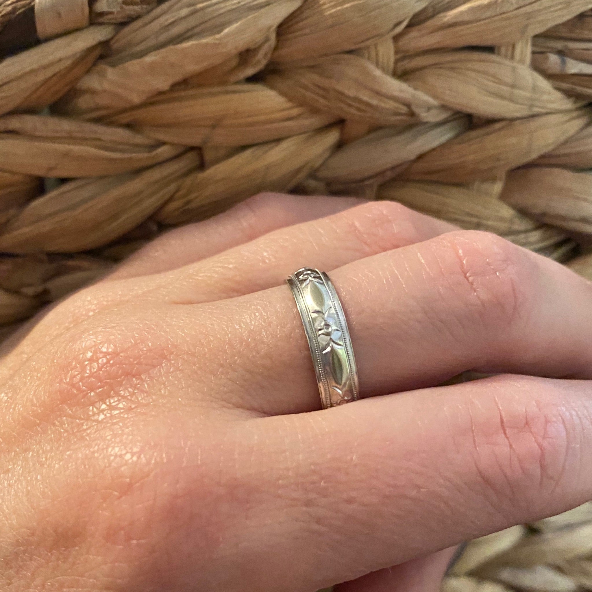 This elegant Mid Century 14k white gold wedding band has lovely details. The ring is encircled with flowers engraved between rows of milgrain.  The half round band is beveled at the flat edges giving the ring a slightly masculine look. This band is a rare larger size making it a handsome men's option. Circa 1940-1950.