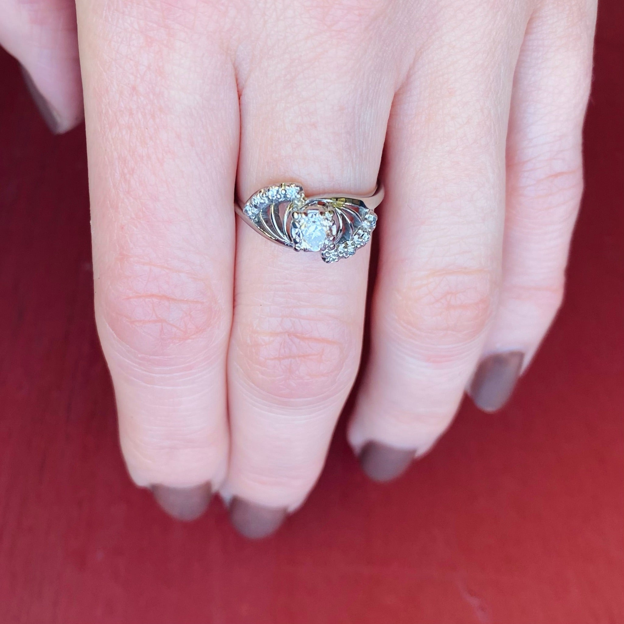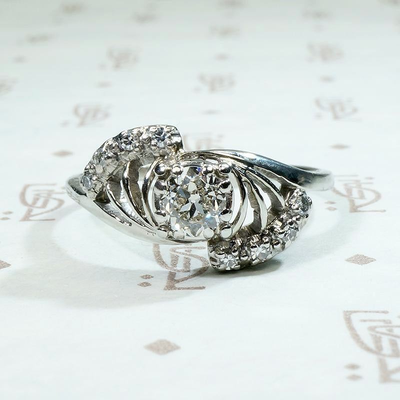 This is such an interesting Mid Century diamond engagement ring. A sparkling 0.40ct old European cut diamond is prong-set at the center of a spray of stylized 18k white gold flowers. The white gold swirl has an unusual, almost industrial feel and each stem is set with a pretty little diamond. Circa 1950.