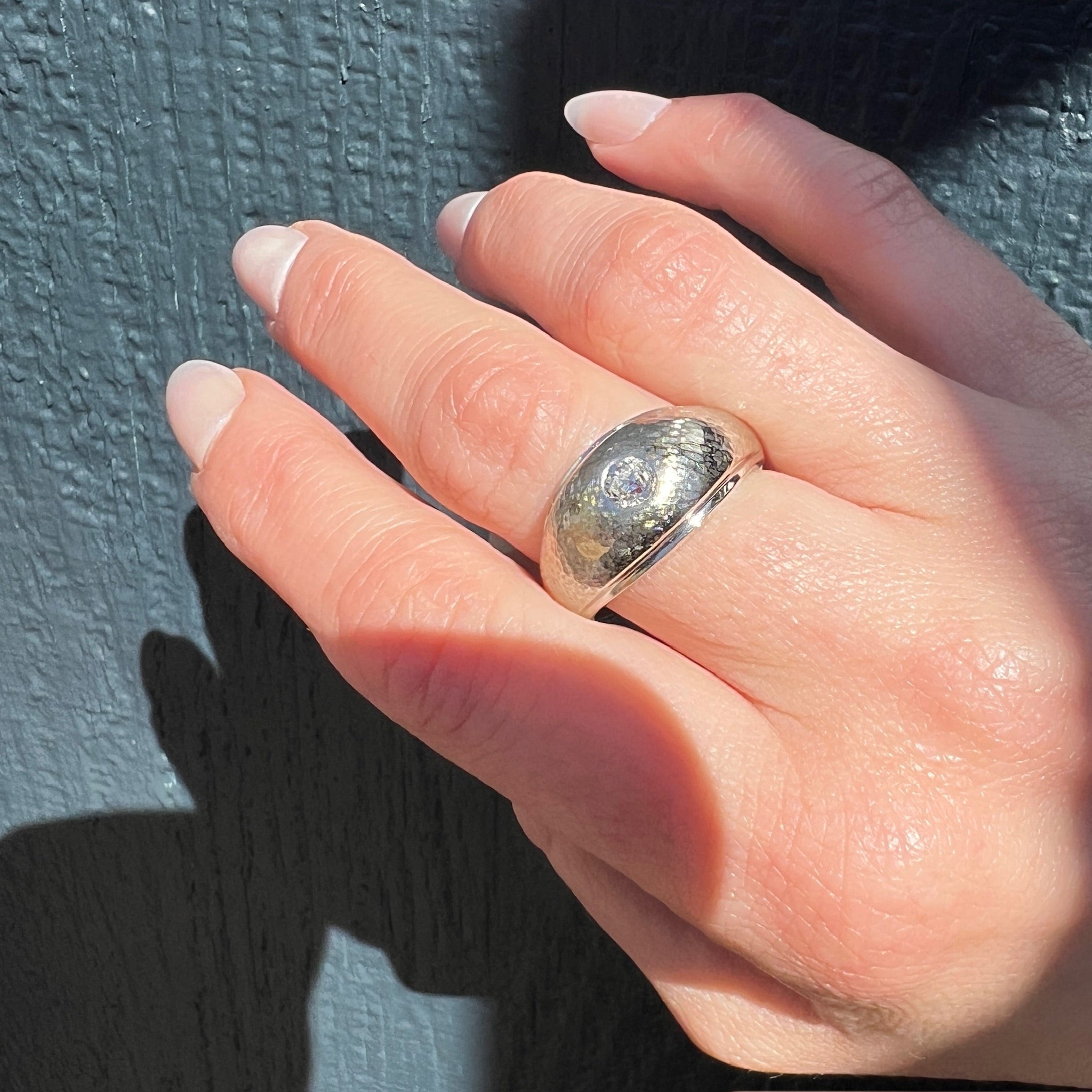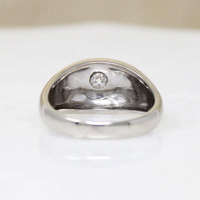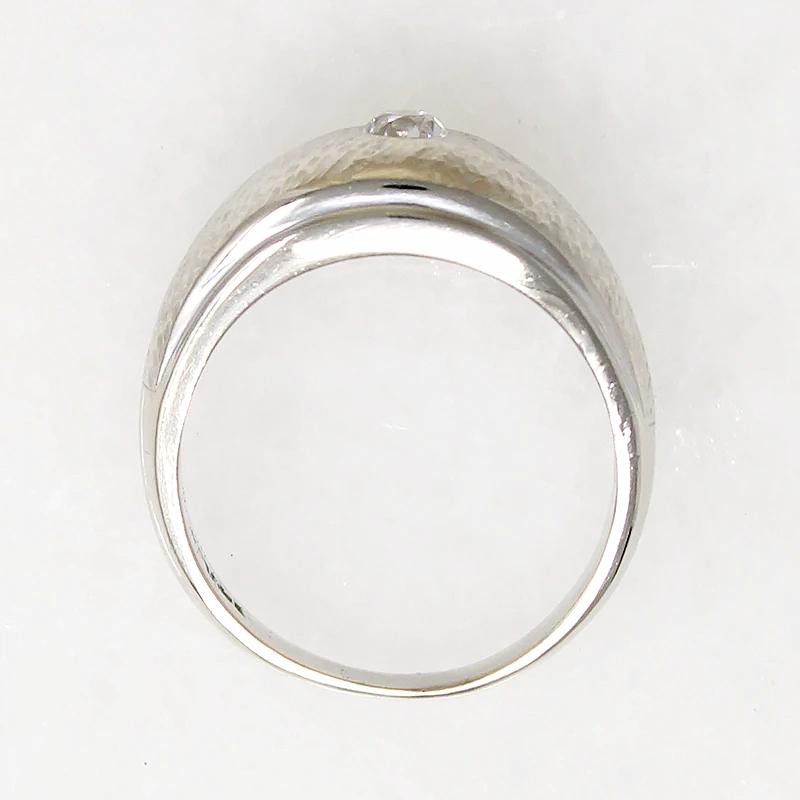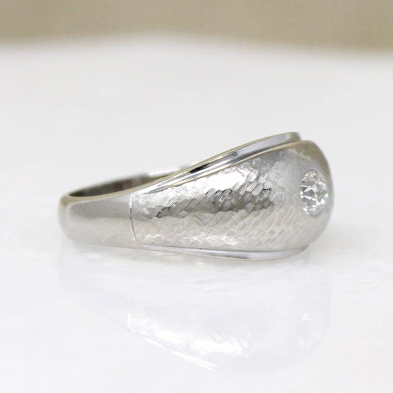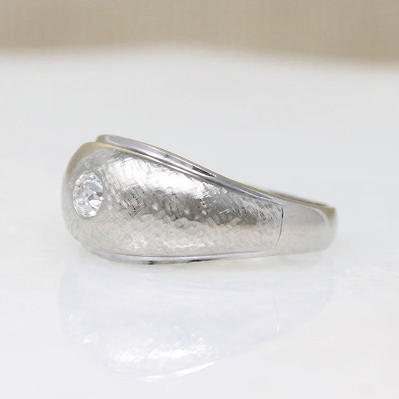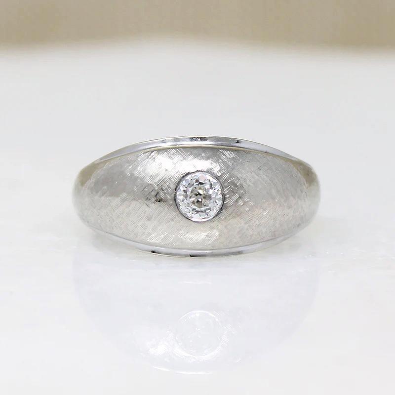 We always love a gypsy ring, and this Mid-Century gypsy band is a Victorian Revival stunner. A chunky 0.35ct old mine-cut diamond is inset in a domed 14k white gold band, and the stone's chunky crown peeks out from its bezel. A crosshatched Florentine finish gives the ring a modern glitter. The band has stepped and flattened edges and a tapered shank. Bold. Beautiful. This ring is a nice large size. It would make a great commitment ring and is also perfect for a variety of occasions. Circa 1950.