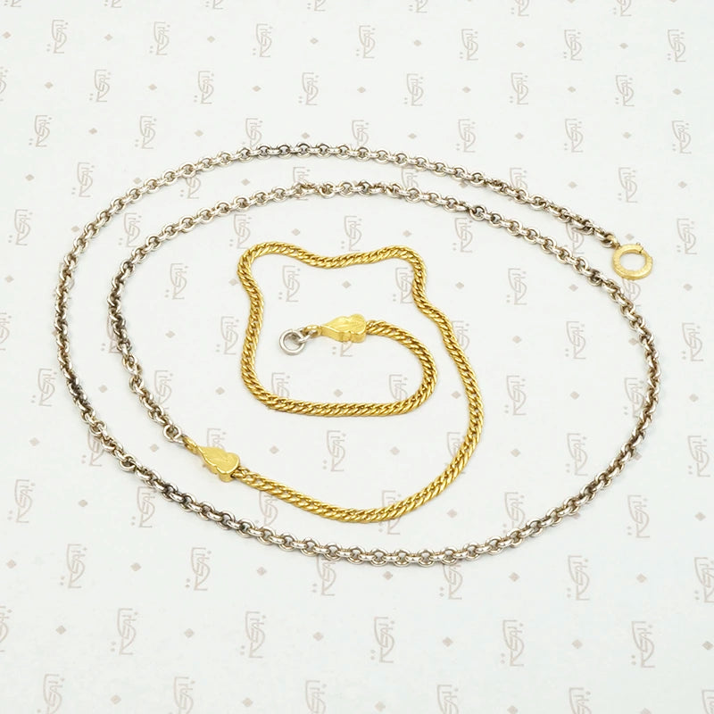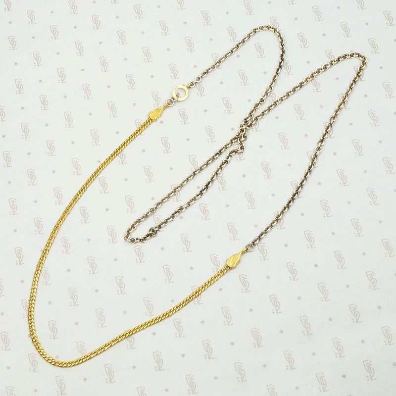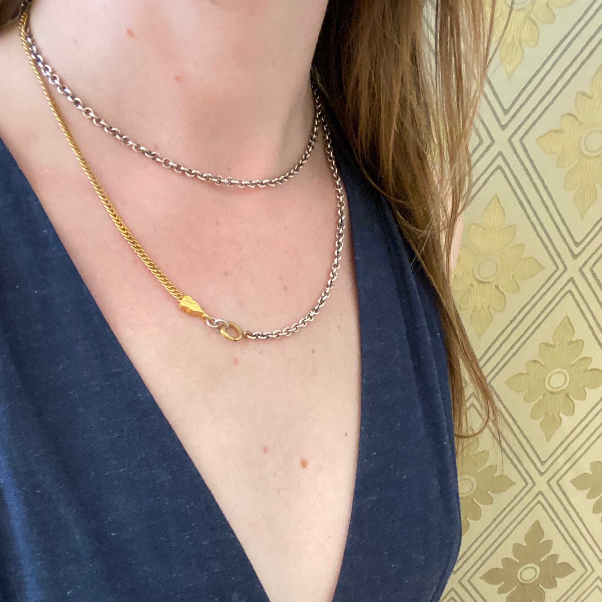 Sterling silver rolo chain is paired with flat gold filled snake chain; the cool silver and buttery yellow gold filled complimenting each other perfectly. Ornamental gold filled details, engraved connecting links and C-clasp closure, elevate the design interest of this chain. The mixed metals make this necklace versatile, you can wear it with everything.