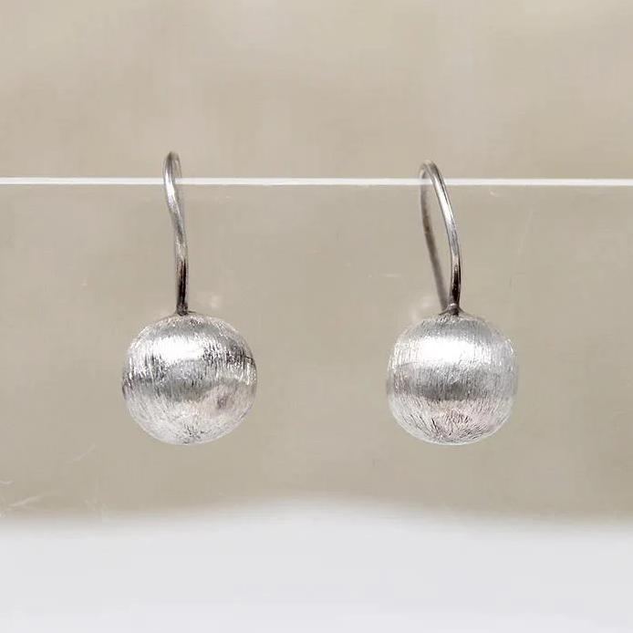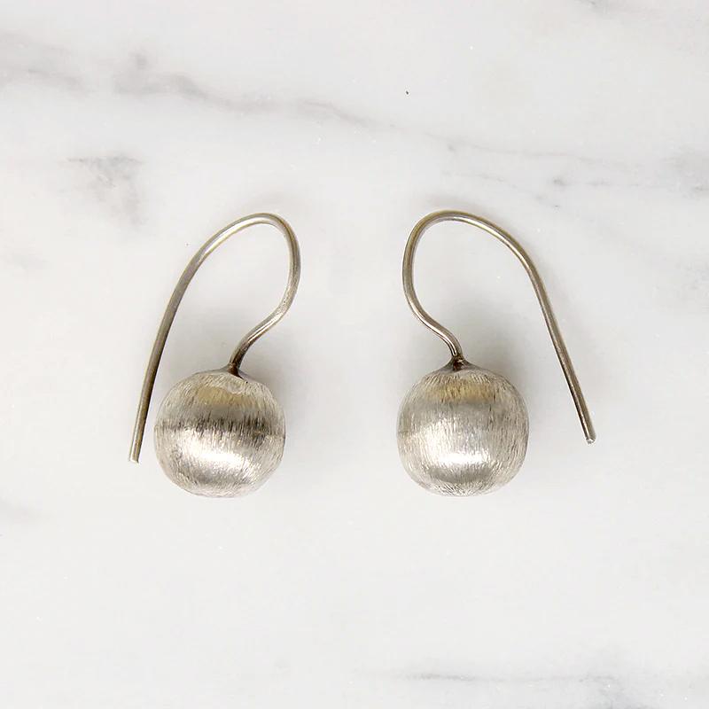 Sterling silver ball earrings that have a hip Mod vibe. Silver spheres with a frosty Florentine finish descend from stationary French ear wires. These earrings are versatile; they look great with anything, but just picture them worn with a mini dress and some go-go boots.