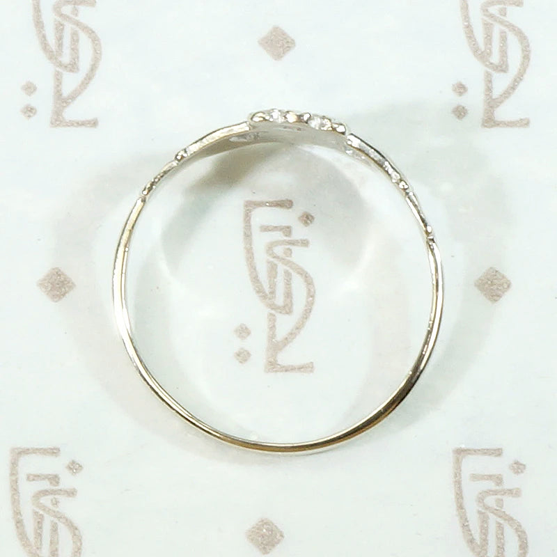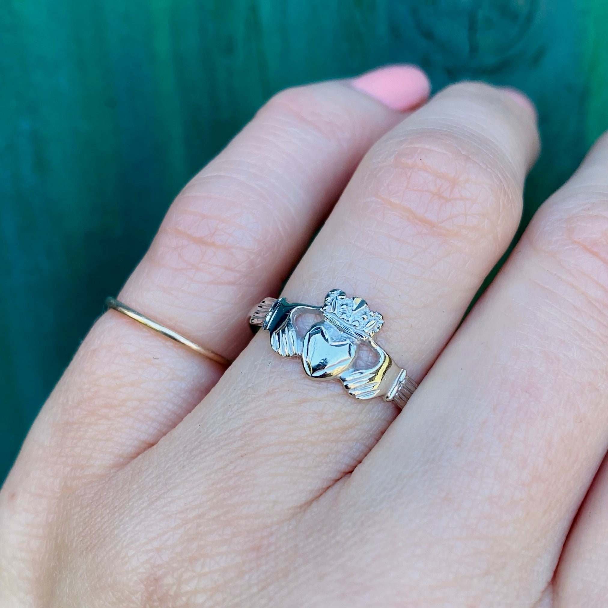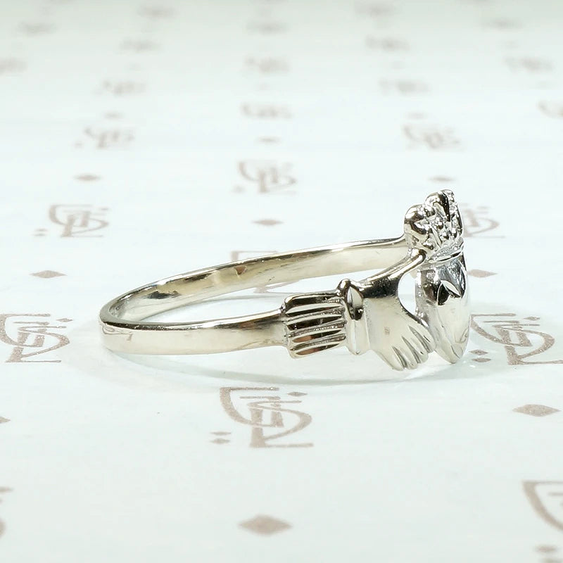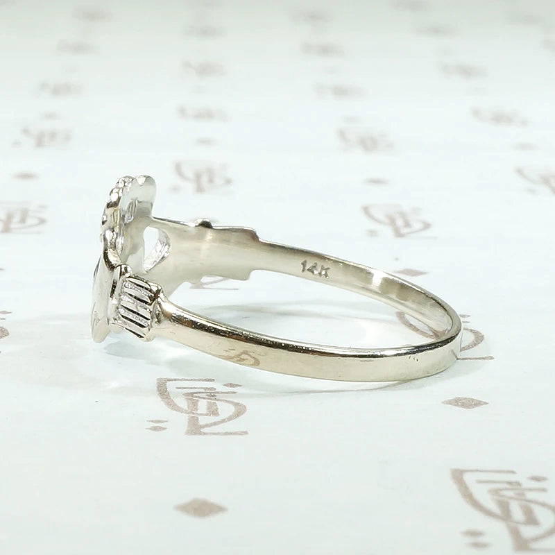 A classic Claddagh ring modeled in 14k white gold. The motif of a crowned heart held in two hands has lovely symbolism. Circa 2000.
