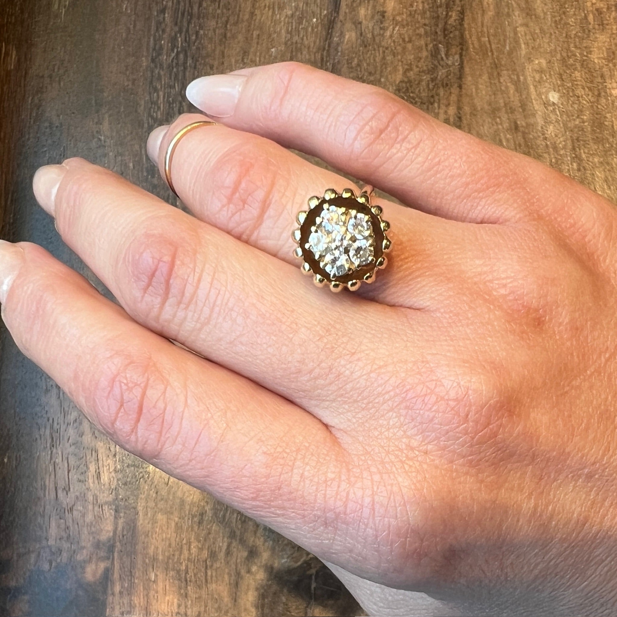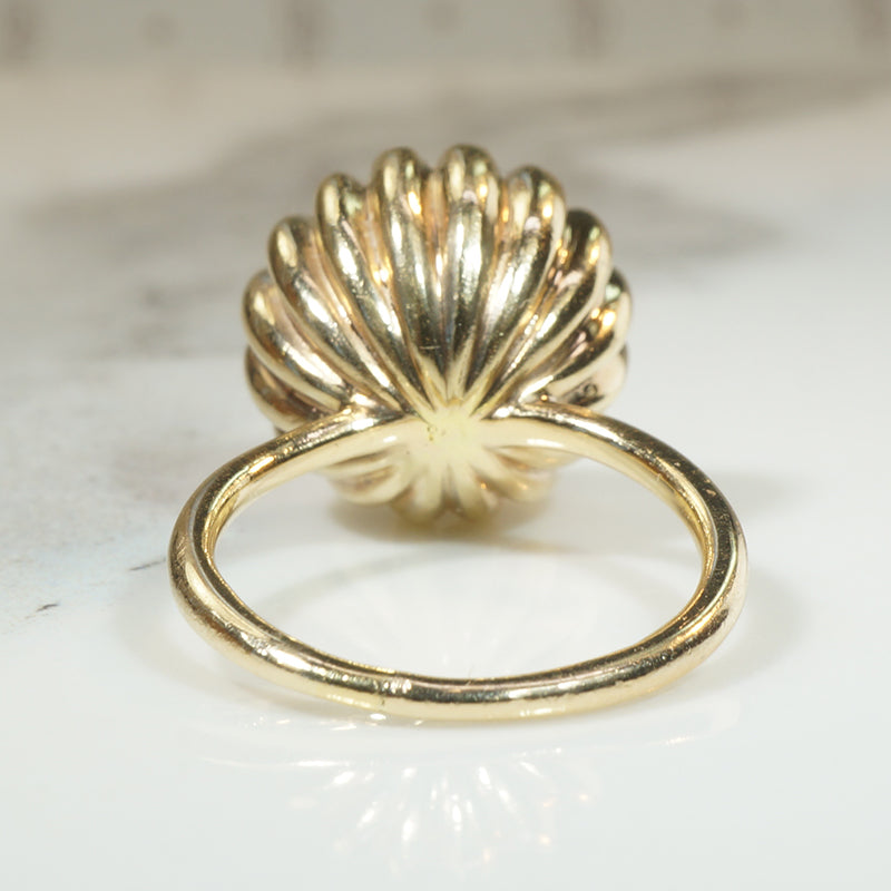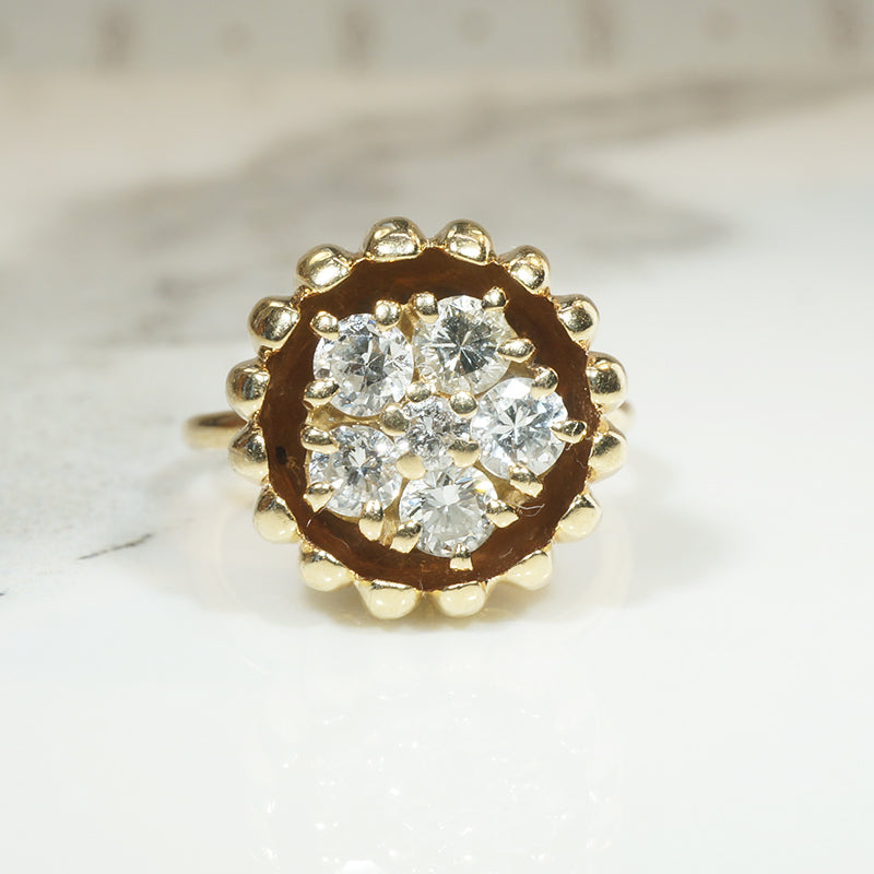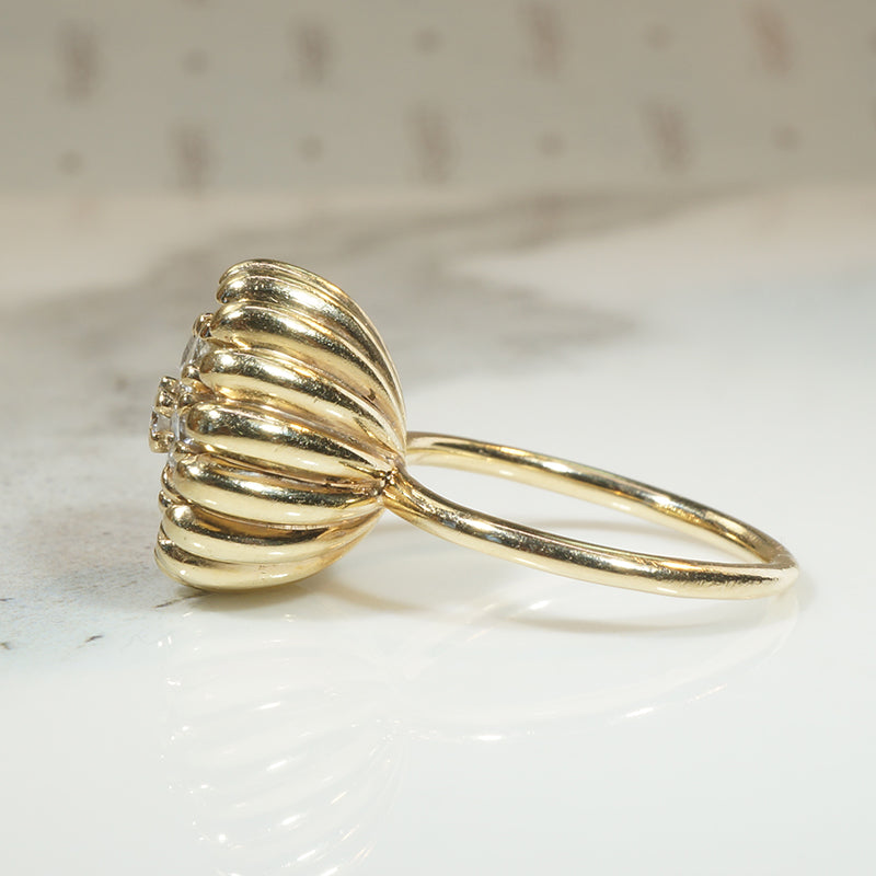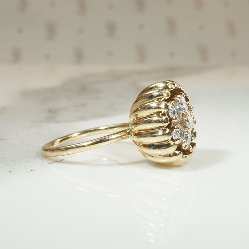 This wonderful Modernist statement ring recalls a lotus flower pod. A sparkling cluster of six bright white diamonds is recessed within a deep ribbed bowl of 14k gold. The 1.60tcw of prong-set diamonds look like seeds within the three-dimensional pod. The decorative top of the ring sits over a simple band. A fun statement ring that proudly commands attention. Circa 1980.