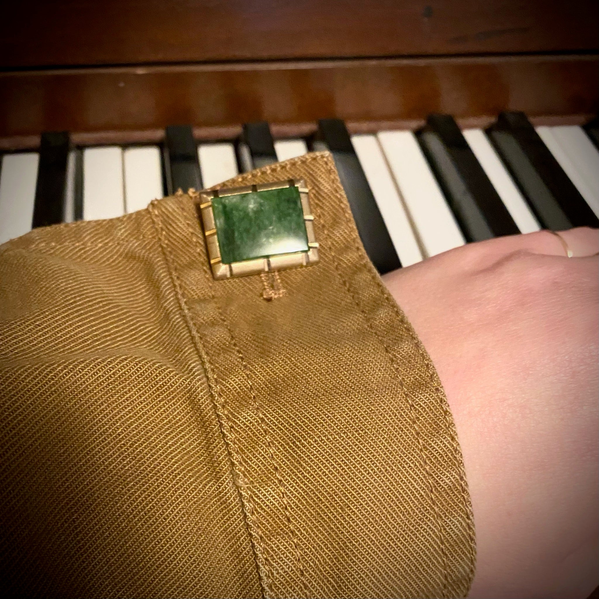 Big and bold cufflinks that made a dramatic statement. Rectangle slabs of mossy nephrite jade are set in textured gold tone costume metal frames. These post and toggle style cufflinks are a great example of dramatic mid 20th Century men's jewelry. Circa 1960.