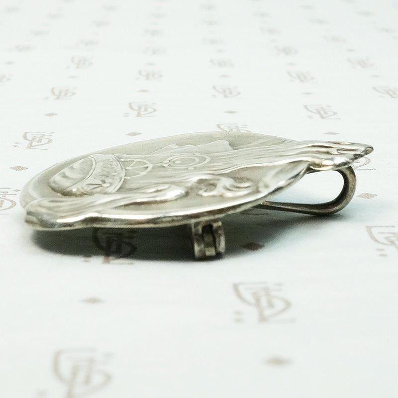 This Unger Bros brooch reproduces Alphonse Mucha's 1897 work: Tête Byzantine - Brunette. The portrait closely resembles the renown French actress Sarah Bernhardt who Mucha often painted. The woman's gorgeous profile is rendered in sterling silver. The subject, her flowing locks and the elaborate Egyptian Revival headdress are all ideal examples of the Art Nouveau aesthetic. The brooch is a chatelette, with a hook for a watch that also allows the piece to be worn as a pendant. The back is signed for Unger Bros. What a wonderful piece, beautiful in its own right and historically fascinating. Circa 1910.