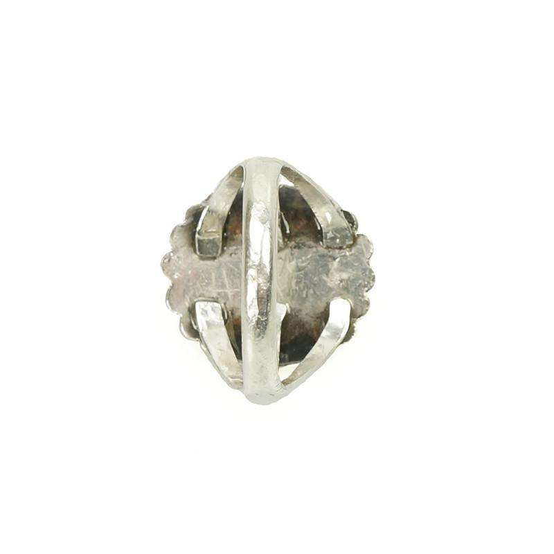 A pretty bright blue gem of natural turquoise is the focal point of this ring. The turquoise is set in a traditional sawtooth bezel which has been embellished with a twisted rope design. The dot and bar design gives this ring a timeless look.