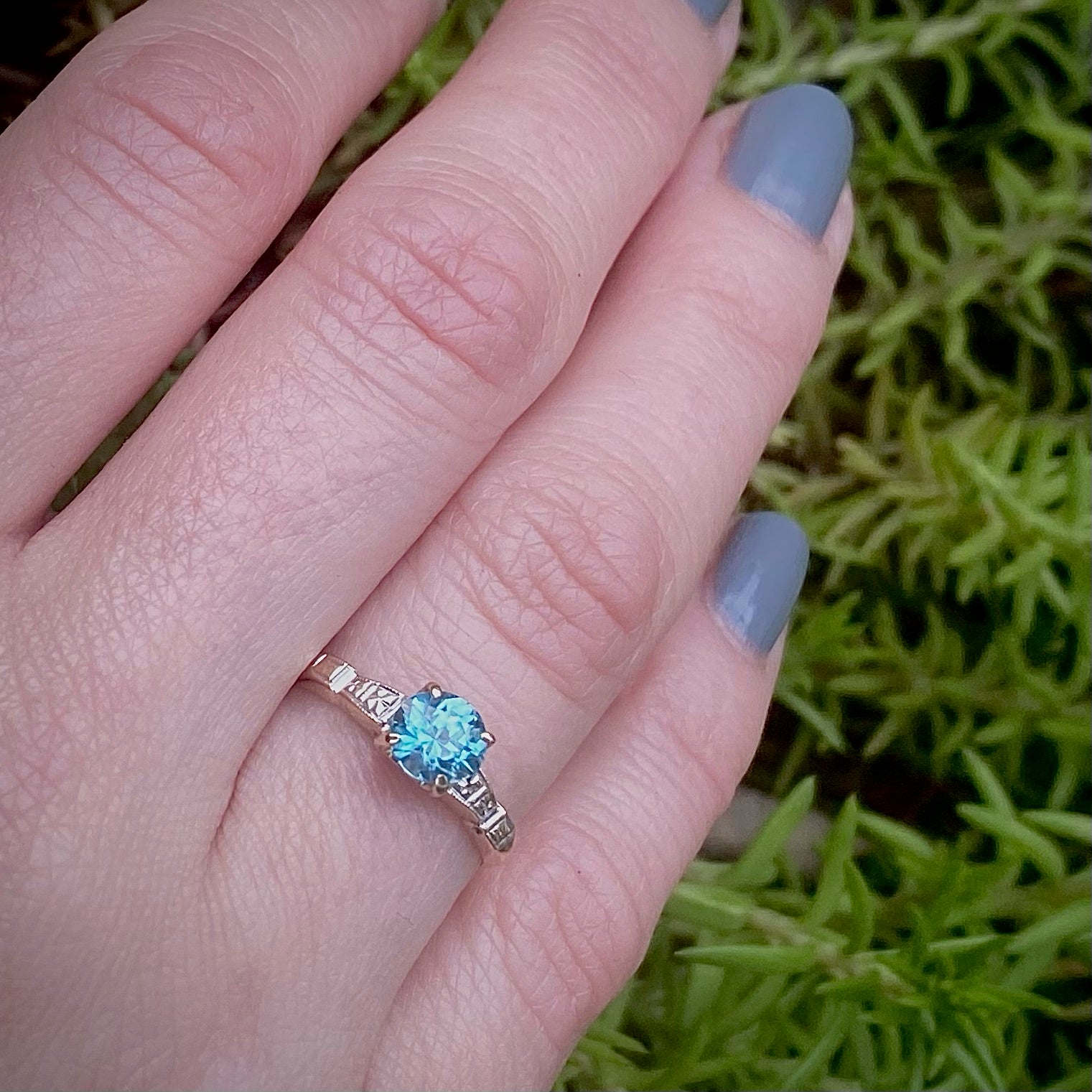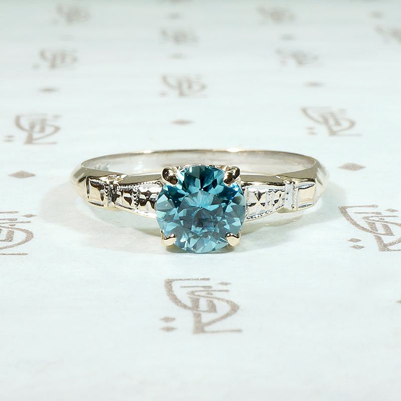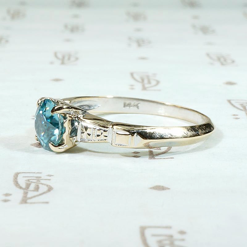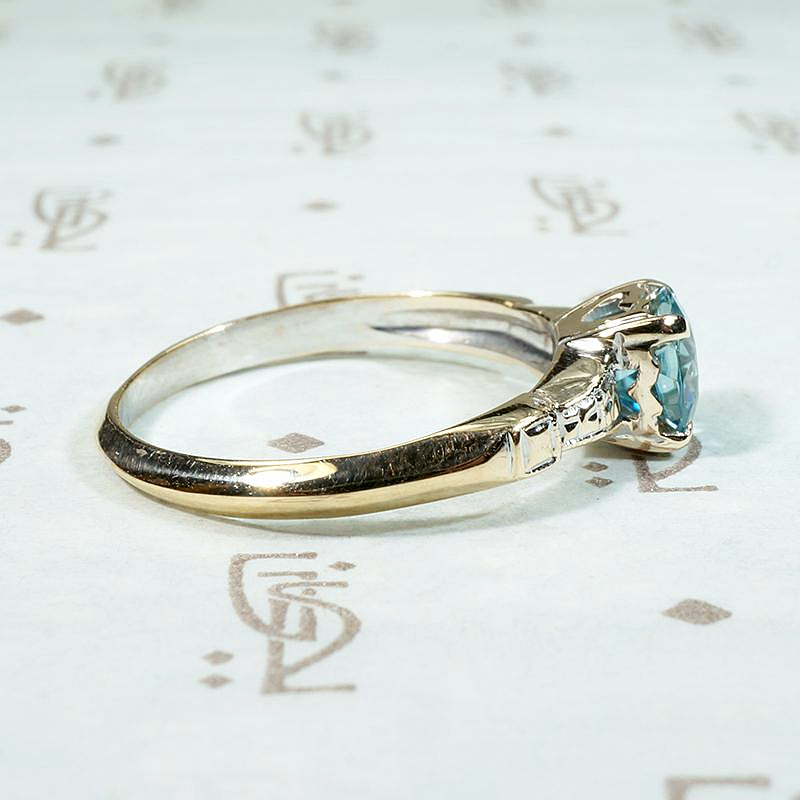 A brilliant natural blue zircon two-tone solitaire ring. Natural blue zircons have a high refractive index, giving them maximum sparkle. The gem sits in a four-prong yellow gold head, in profile the head displays an open heart. Flanking the zircon are white gold shoulders engraved with stylized flowers. The body of the ring is 14k yellow gold with a subtle knife edge band. Very pretty. Circa 1940.