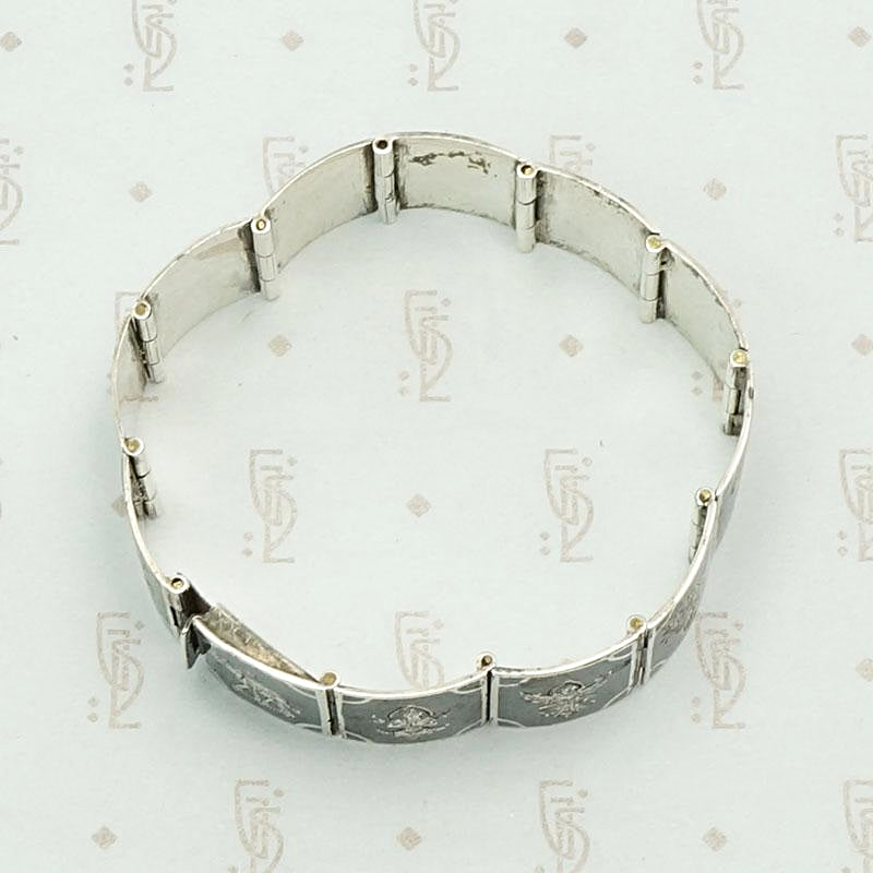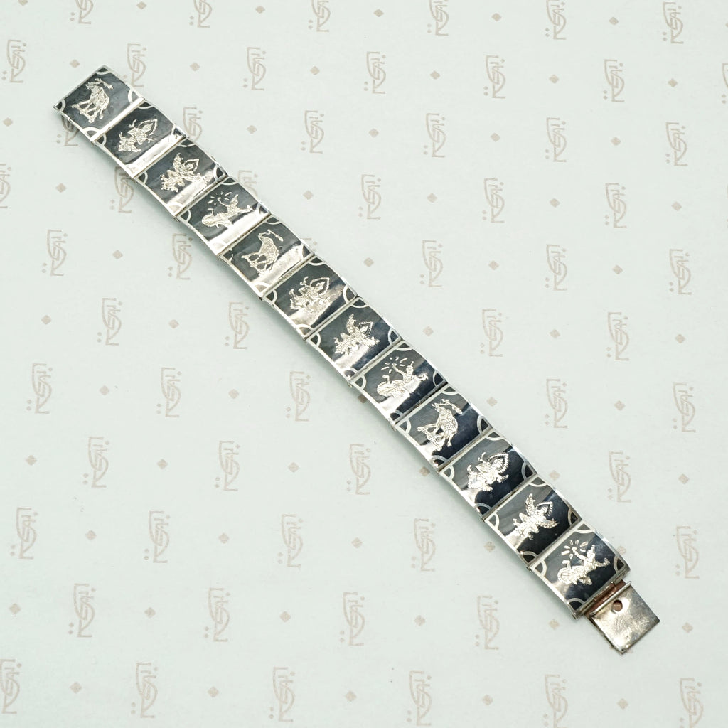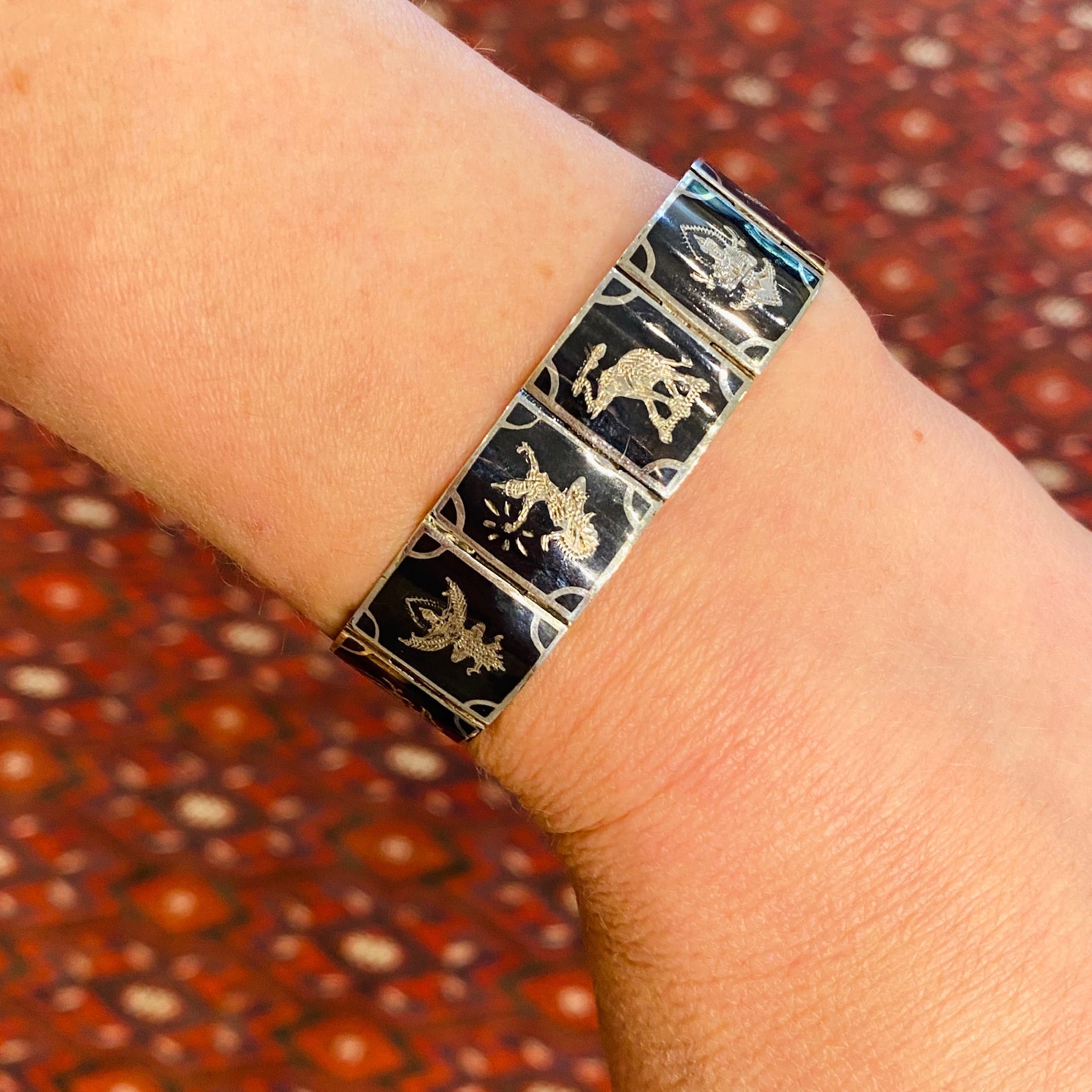 A gorgeous Siam silver panel bracelet. Sterling silver panels with niello enameling are engraved with dancers and other figures. This style of black enameled and engraved jewelry is referred to as Siam silver. The bracelet has that beautiful bohemian feel we love, wear it with your favorite summer dresses. Circa 1950.
