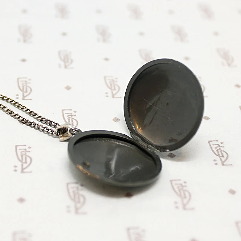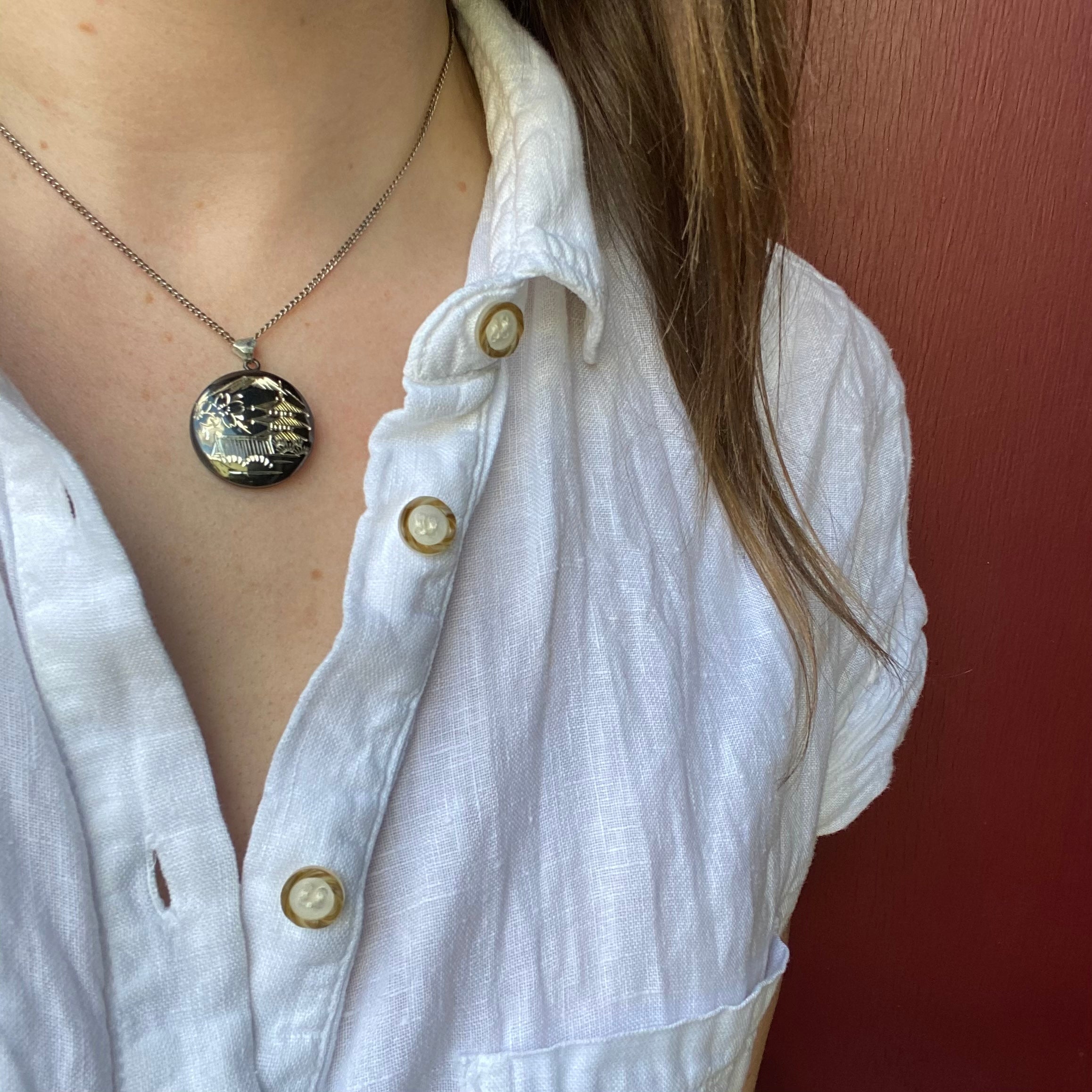 Details.....The locket measures 0.94" in diameter, 1.2" long with bale. The chain is 16" long. In Excellent Vintage Condition. Small imperfections are to be expected and considered part of the charm.