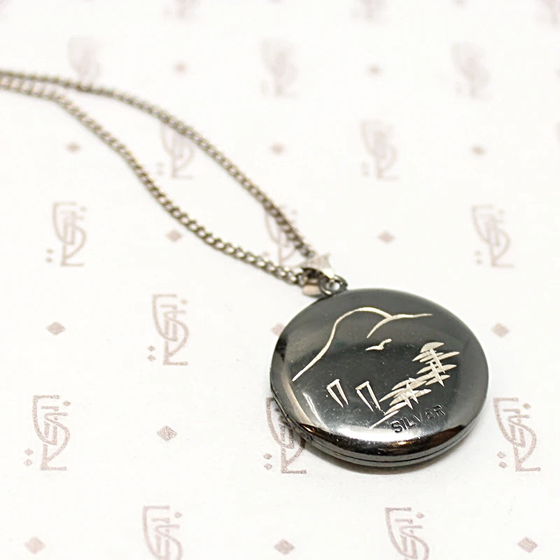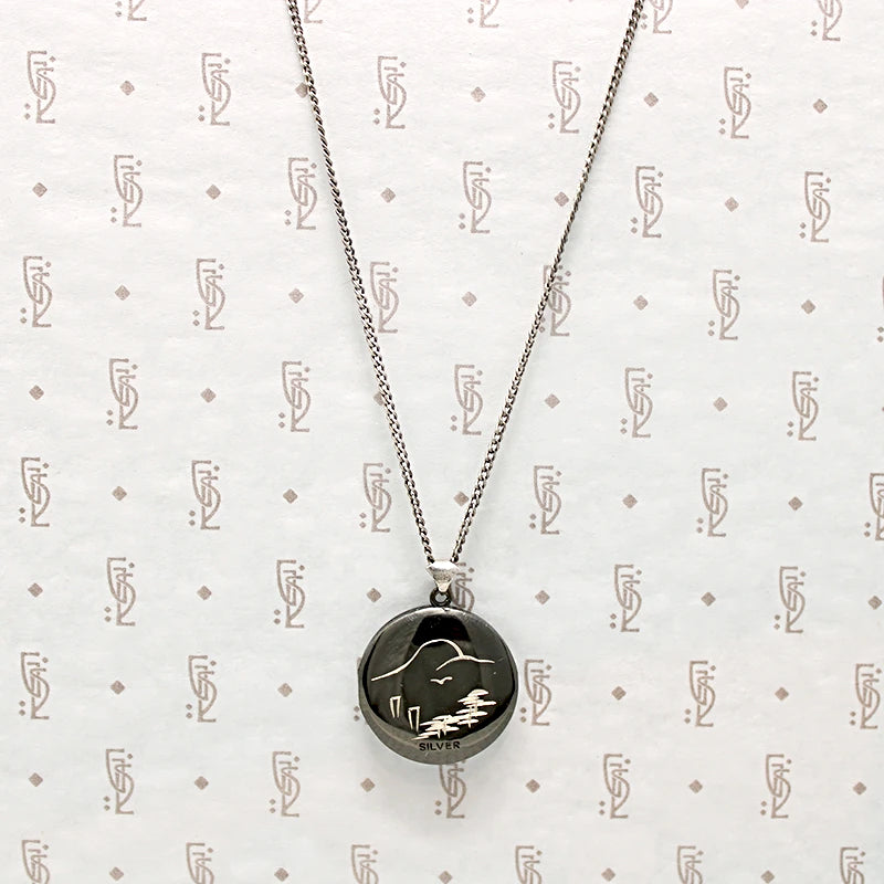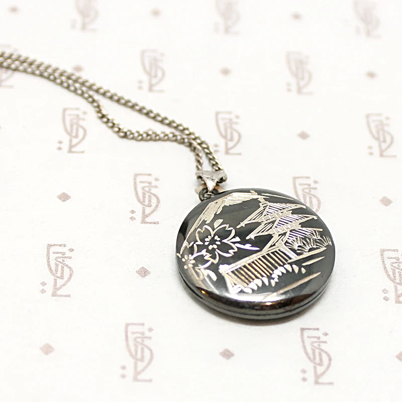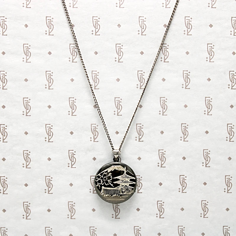 Absolutely beautiful niello enamel locket engraved with a view of Mount Fuji and Chureito Pagoda. The round sterling silver locket has been covered in gunmetal-colored niello enamel, then engraved on the front with the renown mountain, pagoda and cherry blossoms. The back is engraved with rolling hills, trees and a single bird. The engraving is bright, shiny and crisp. The locket closes securely and the interior is in good, clean condition with no frames. The locket hangs from a decorative silver bale on a vintage sterling curb chain with a pretty engraved clasp. Circa 1940.