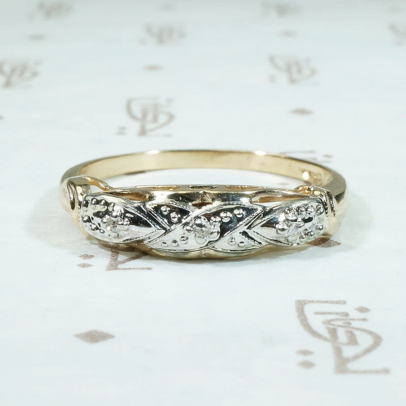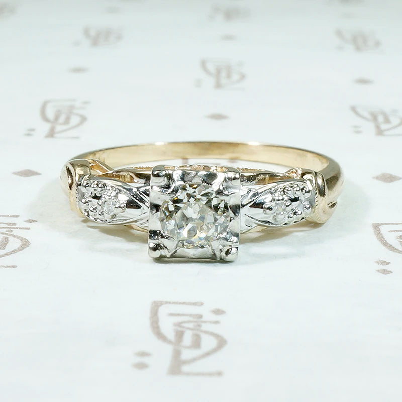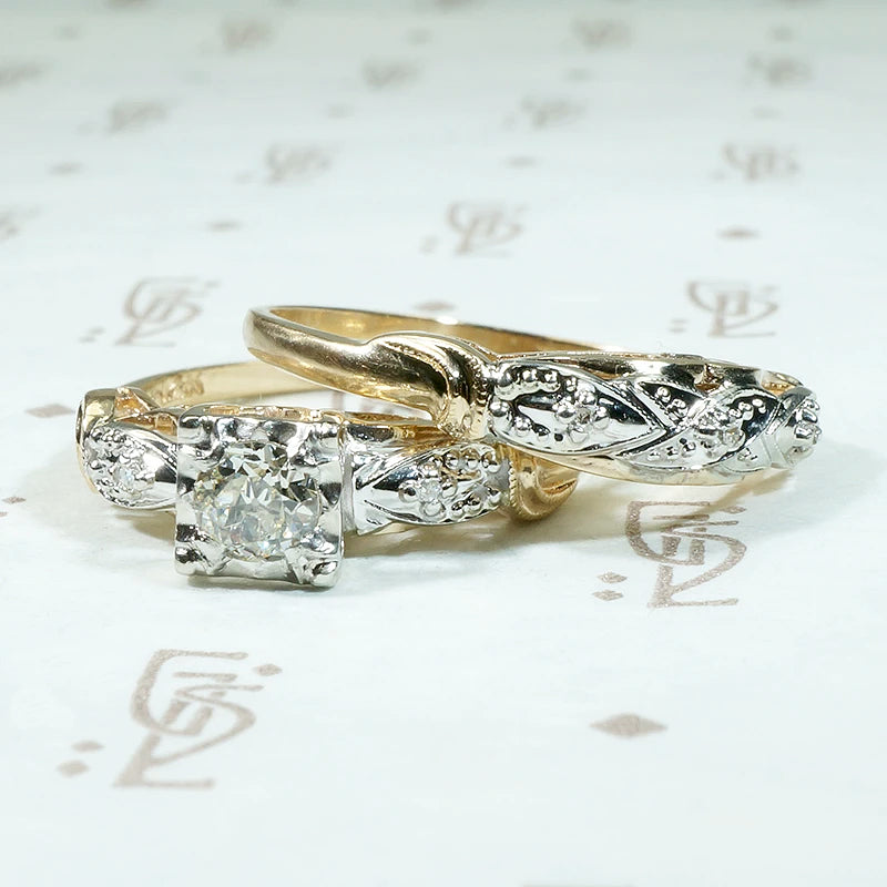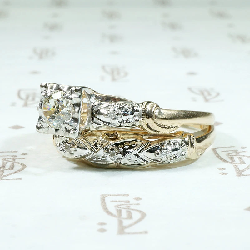 It is always exciting to find vintage wedding sets with both the engagement ring and matching band intact. This set is New Old Stock, true vintage that has never before been worn, so you can be the first person to enjoy these lovely rings. This two-tone 14k gold set has a classic design with pretty sculpted details. The engagement ring's center diamond is a 0.33ct old European cut, prong set in a square white gold head and flanked with accent diamonds set in white gold teardrop shapes. The matching wedding band is set with tiny diamonds in engraved white gold. The rings' decorative tops are set over yellow gold tapered bands. This set is in unworn condition. Perfect for a vintage-loving bride. Circa 1940.