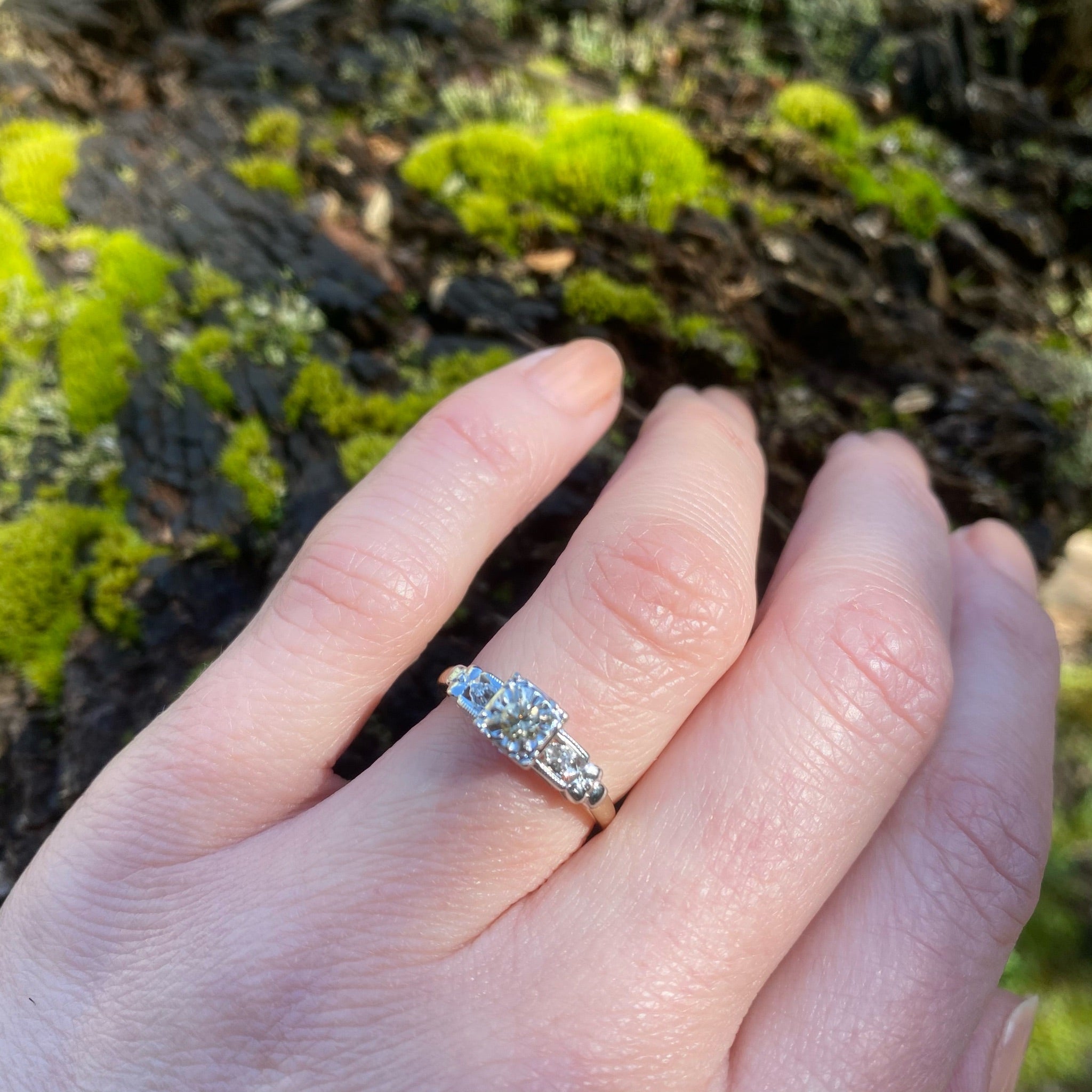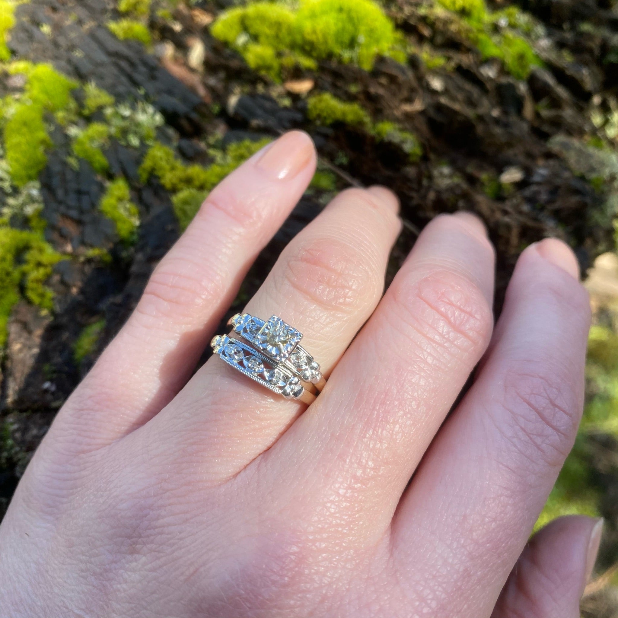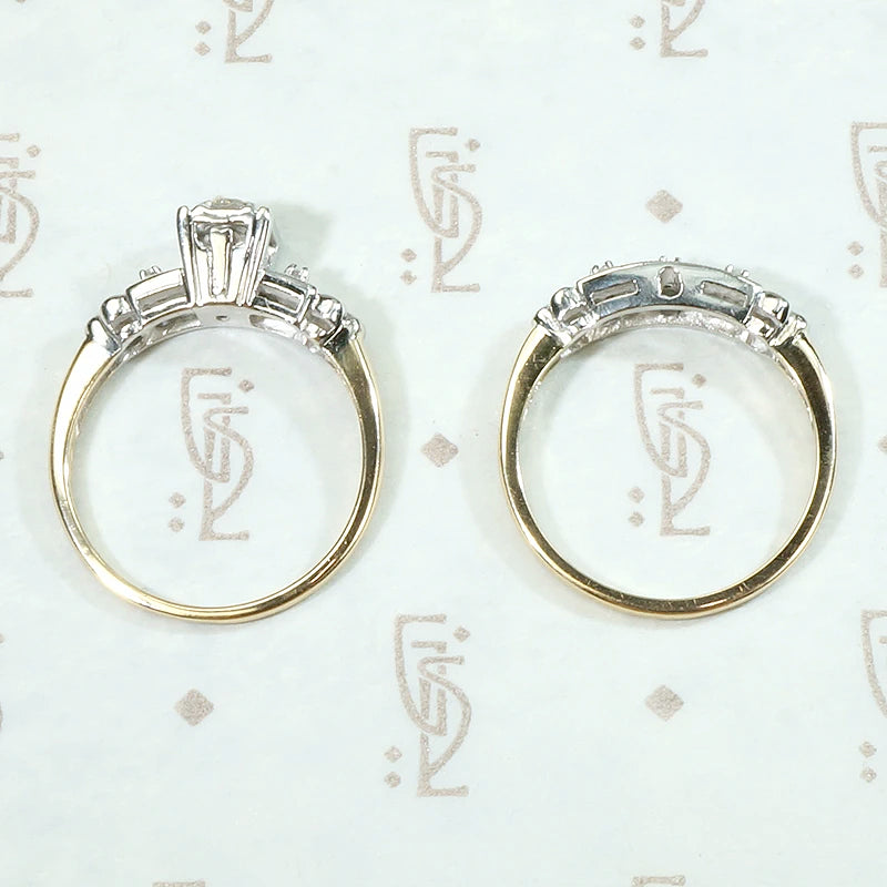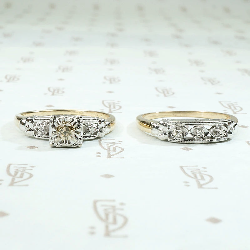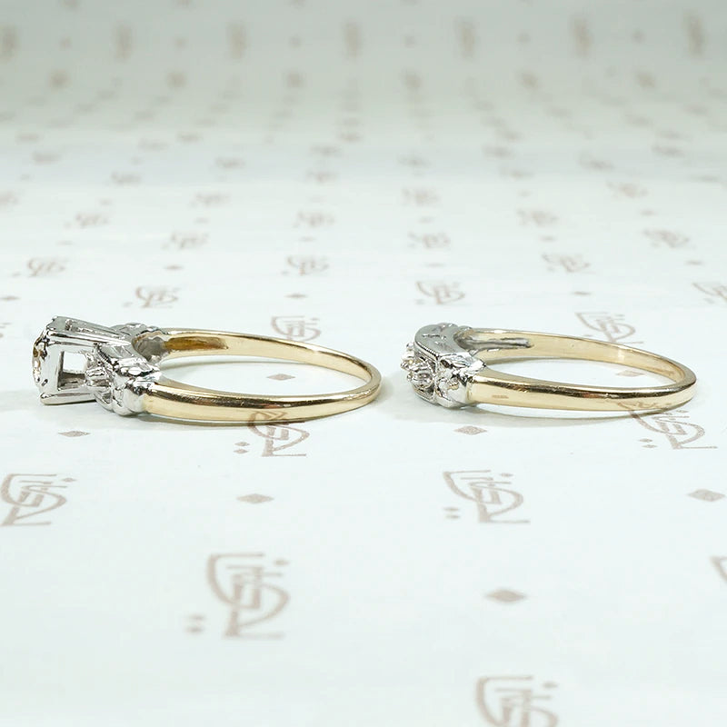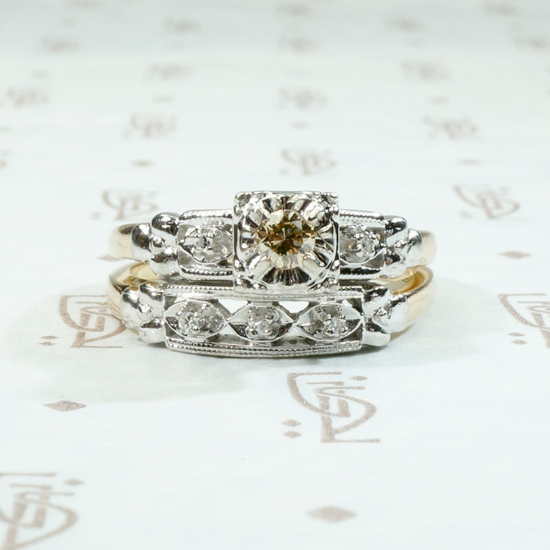 We rarely get wedding sets with both the engagement ring and matching band intact. The set is New Old Stock, true vintage that has never before been sold to the public. You can be the first person to enjoy this lovely vintage wedding set. This beautiful two-tone 14k gold set is particularly special because the engagement ring features a dreamy 0.10ct champagne diamond center stone. The diamonds are set in decorative white gold tops. The center diamond is prong set in a fancy square floral head. The pierced shoulders have two accent diamonds set in fluted navettes and milgrain edges. The decorative tops terminate in sculpted forget me not flowers, set over 14k yellow gold with deeply tapered bands. The matching wedding band is set with three tiny diamonds. This set is in unworn condition. Perfect for a vintage-loving bride.