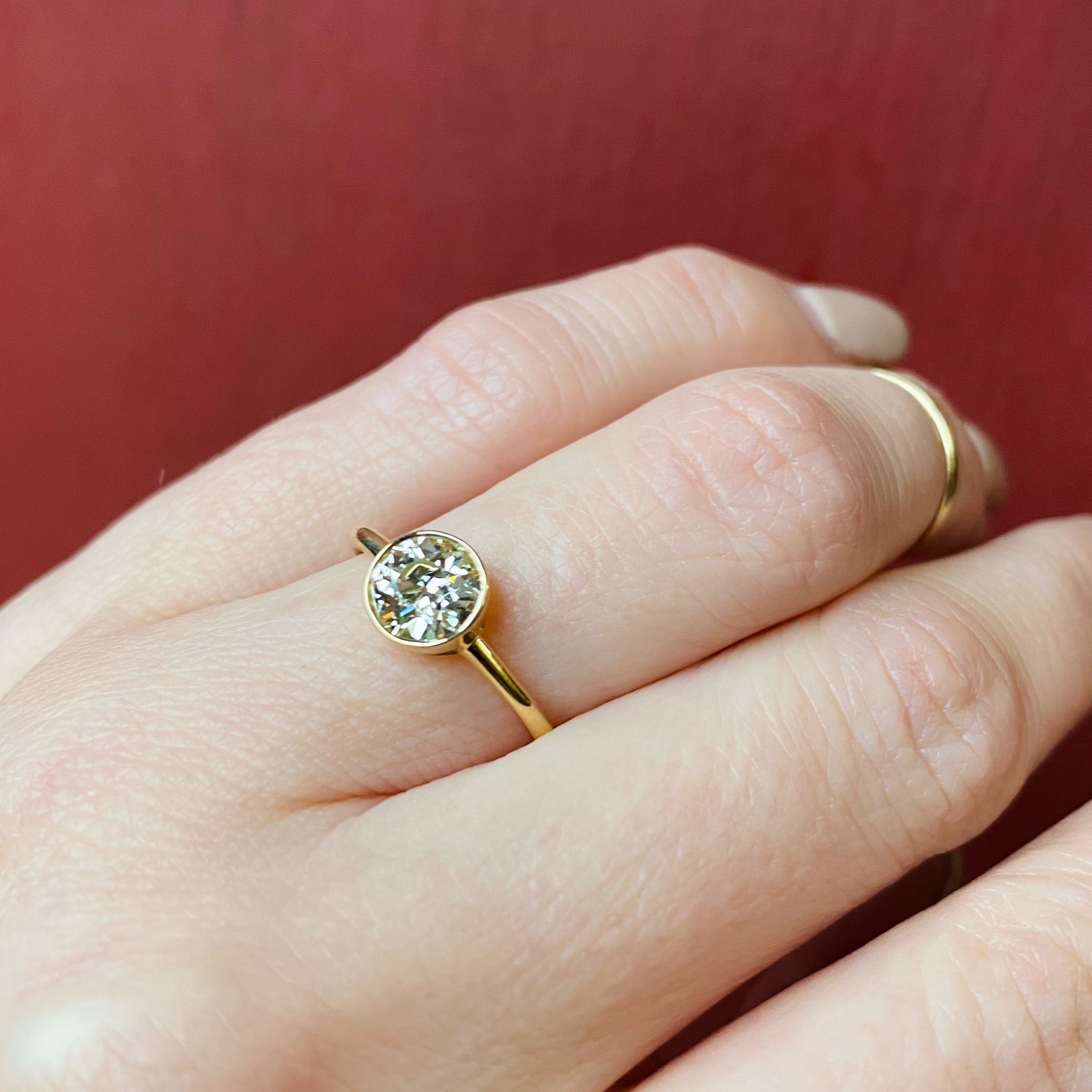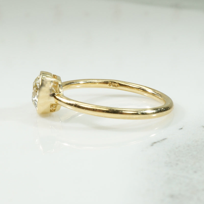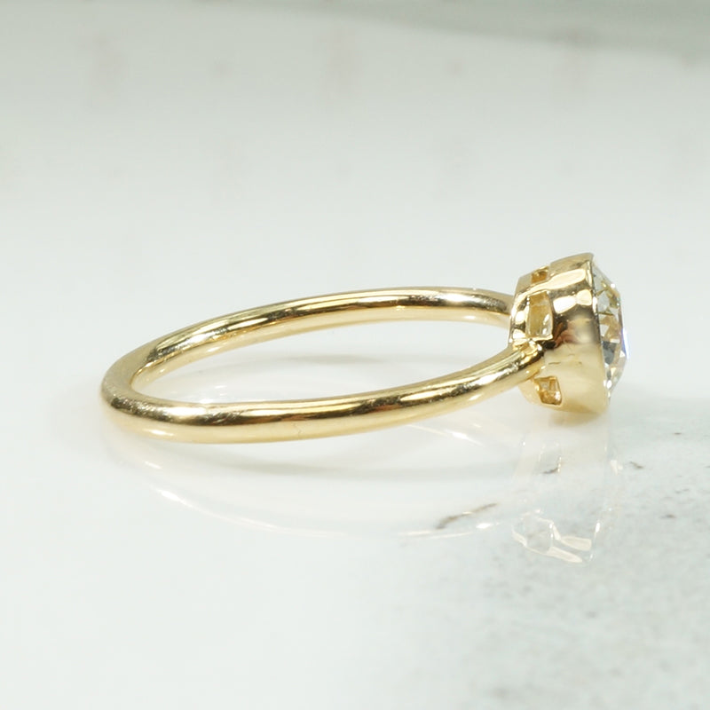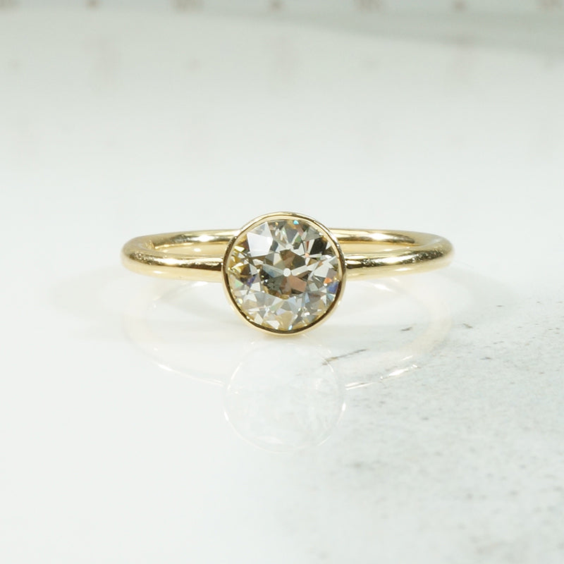 Classic and timeless beauty, a bezel set oec diamond solitaire with clean lines, and a brilliant sparkling diamond. This ring is not only gorgeous, it is sturdy and comfortable to wear. The natural Diamond is a .94ct Old European Cut, SI - K/L, the gold is recycled 18k.