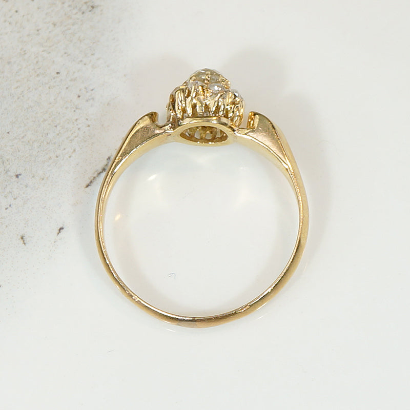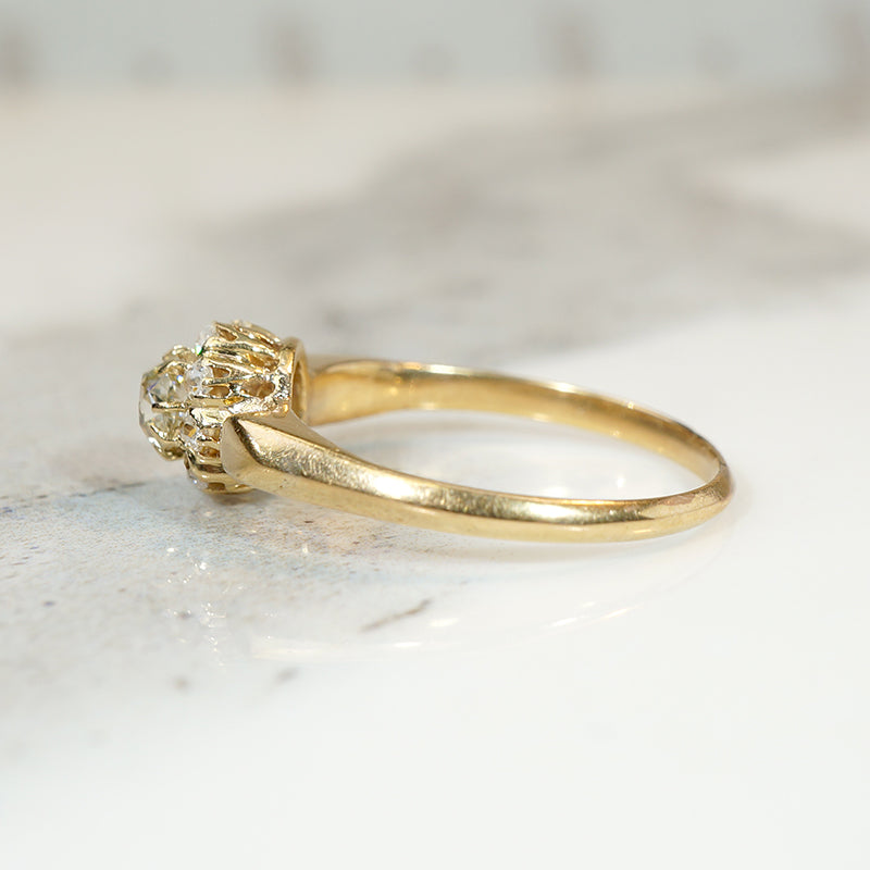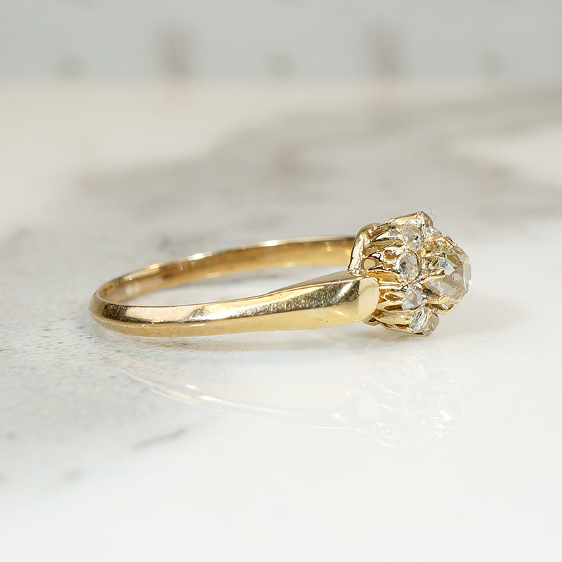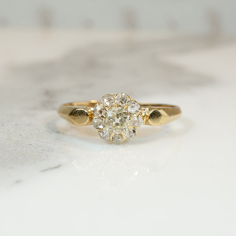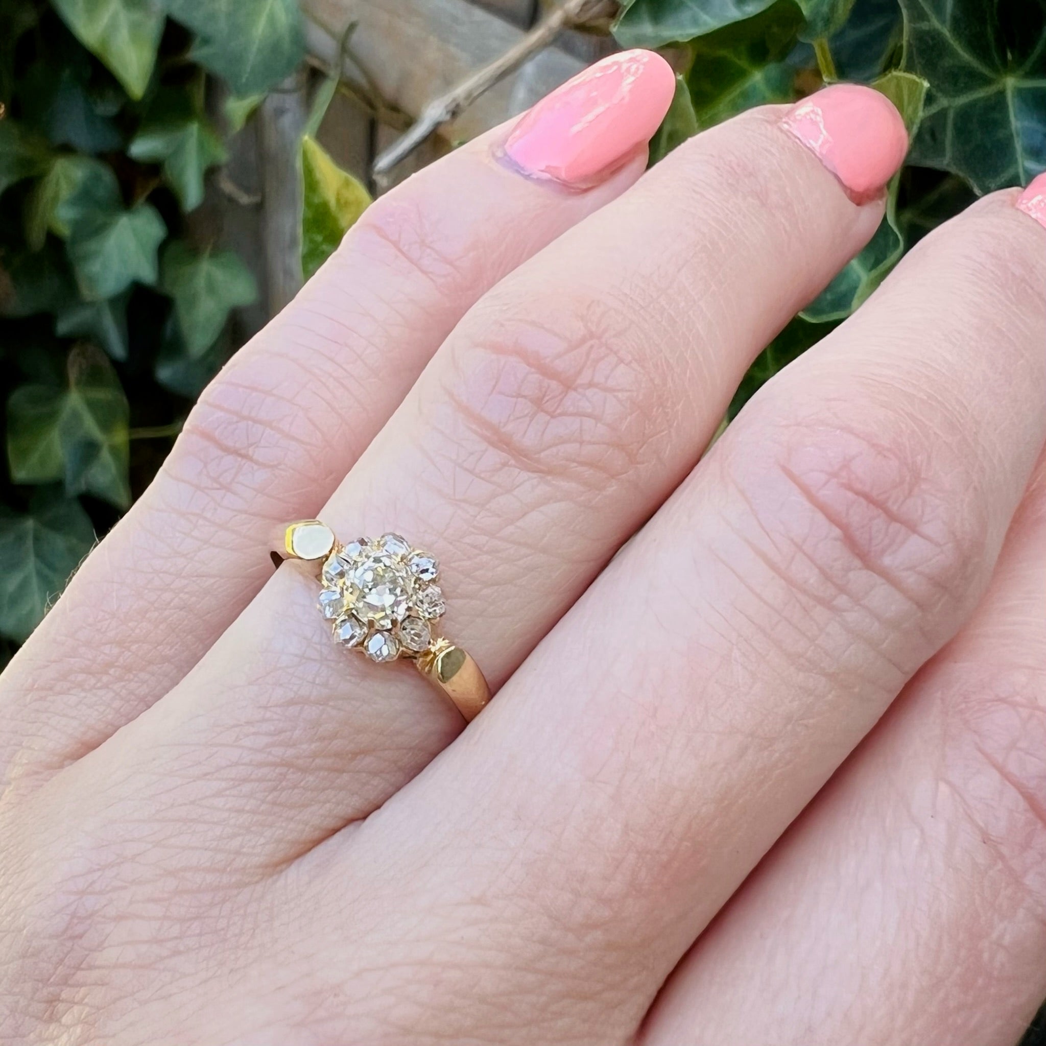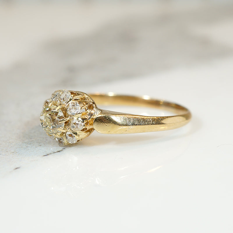 The diamonds in this cluster are my favourite kind! The center diamond is a chunky cupcake shaped old mine cut and the surrounding diamonds are even older cuts some with square shaped tables. The total weight is approximately .75cts. This ring is 18k yellow gold, circa 1860. An incredibly lovely and unusual choice for an engagement ring.
