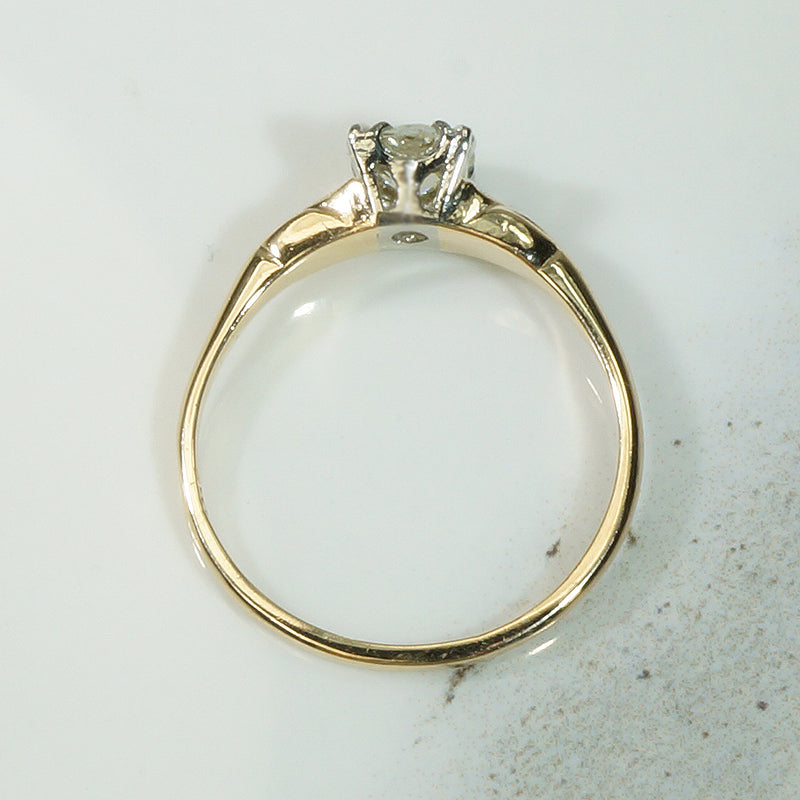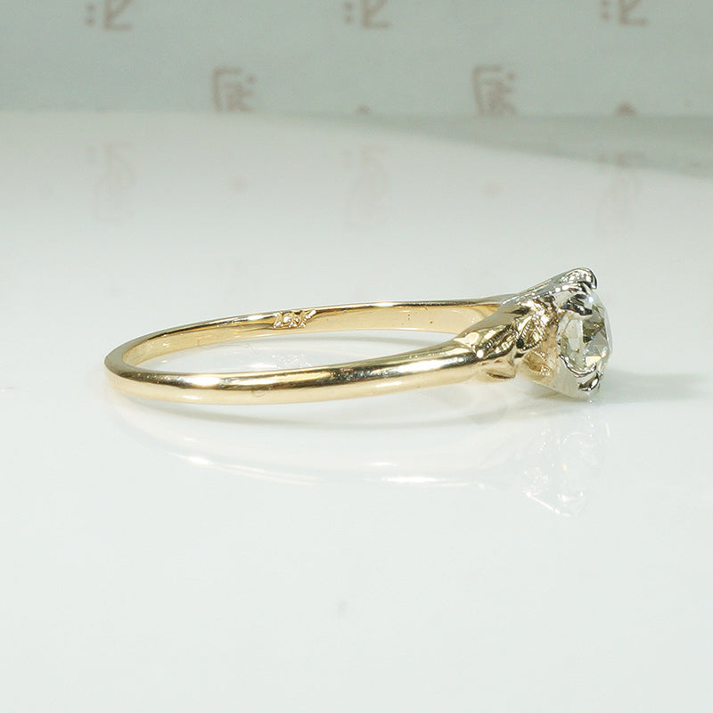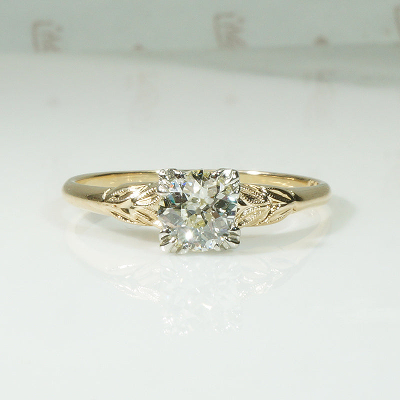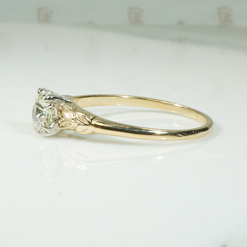 The old mine cut diamond in this engagement ring is so lovely. Set in white gold with a yellow gold band and sculpted leaves on the shoulders, the two tone gold makes this beauty really versatile. The diamond is late 1800's and the setting 1940's.