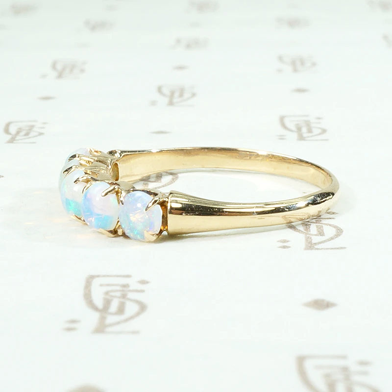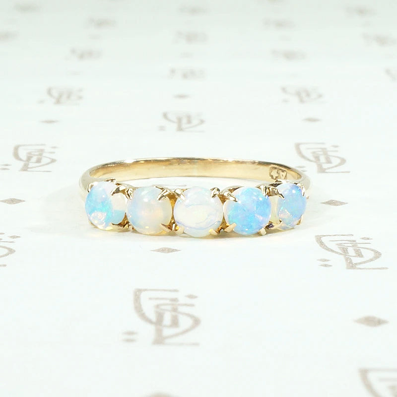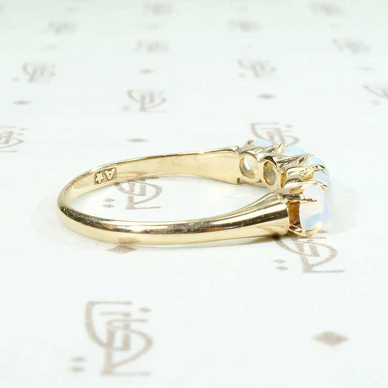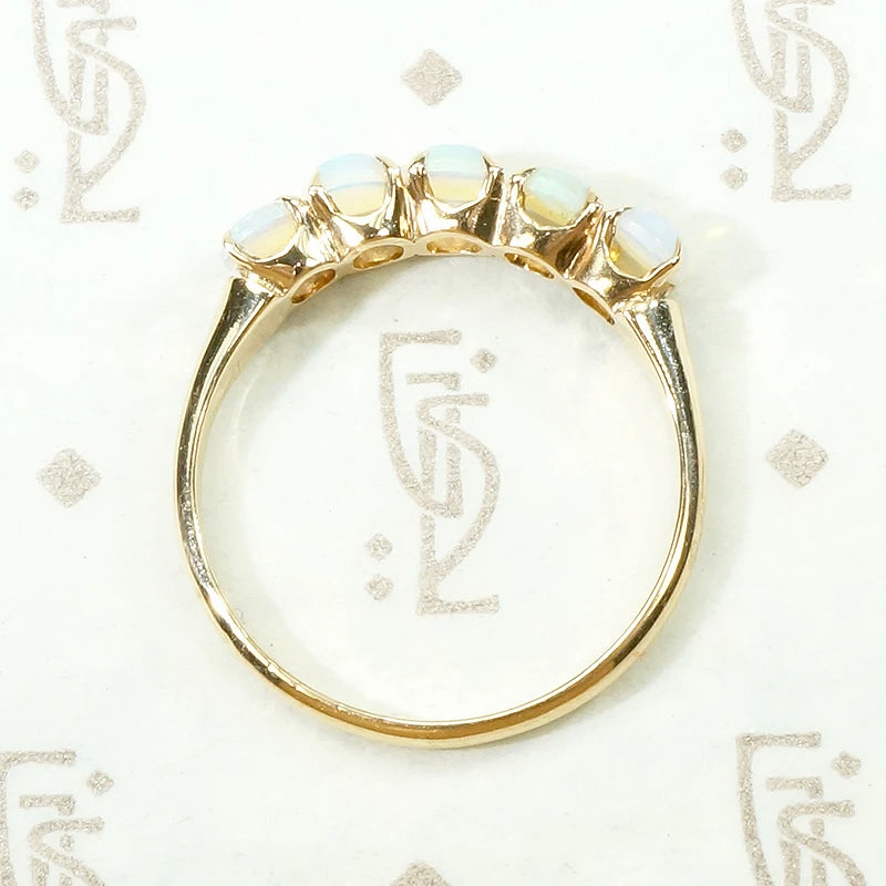 This Edwardian opal band is so elegantly simple, perfect for showcasing the natural beauty of the iridescent gems. Five fiery round opals are claw set in a 10k yellow gold ring. A shapely half round band tapers gently into the shank. It's really just perfect. The interior of the band is stamped with an "A" and a five pointed star, the maker's mark for Allsop Brothers. Circa 1900.