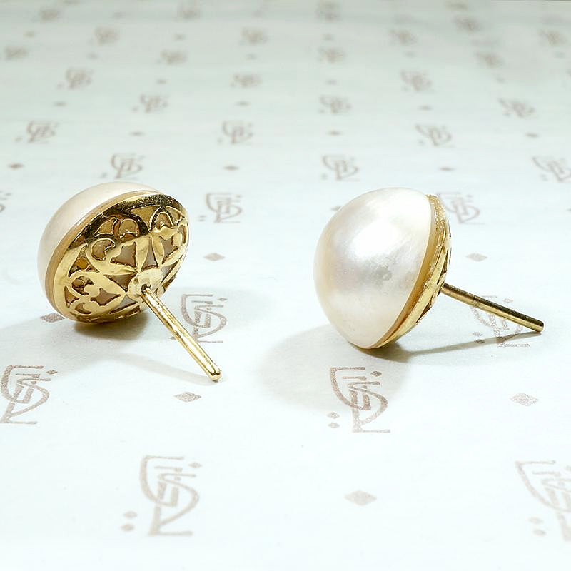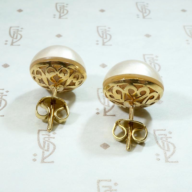 Dreamy vintage white mabé pearl stud earrings in luxurious 18k gold settings. The lovely, luminous pearls nestle in yellow gold cups; wreathes of curvy hearts form the cup settings. Every element of these stud earrings is lush and opulent.