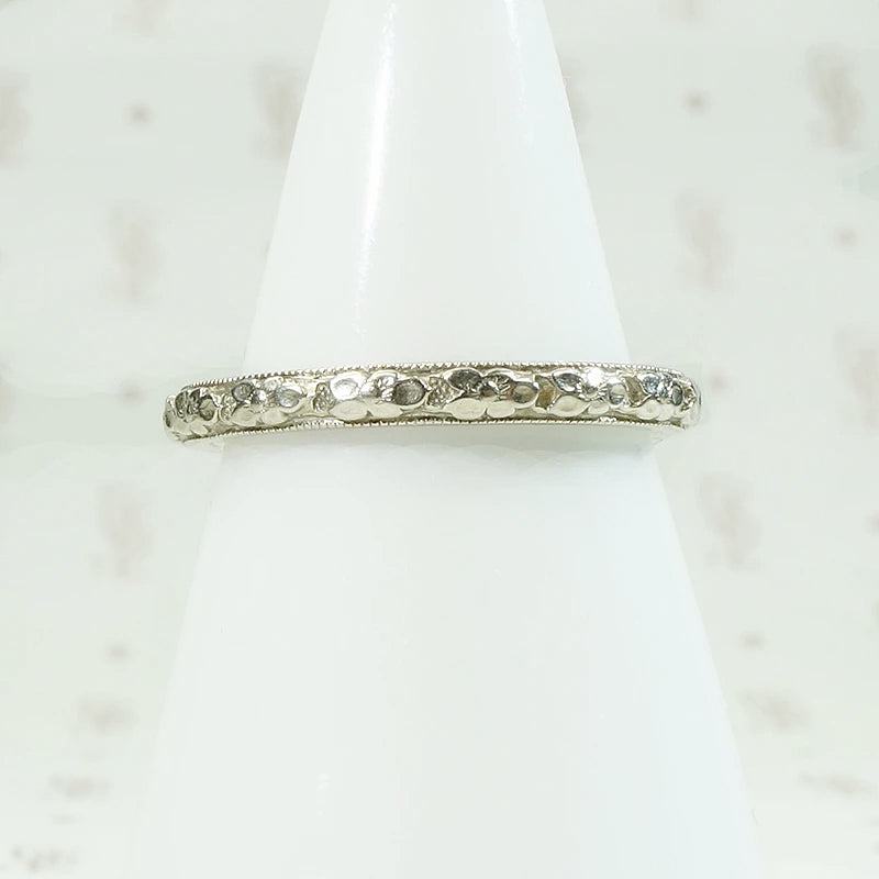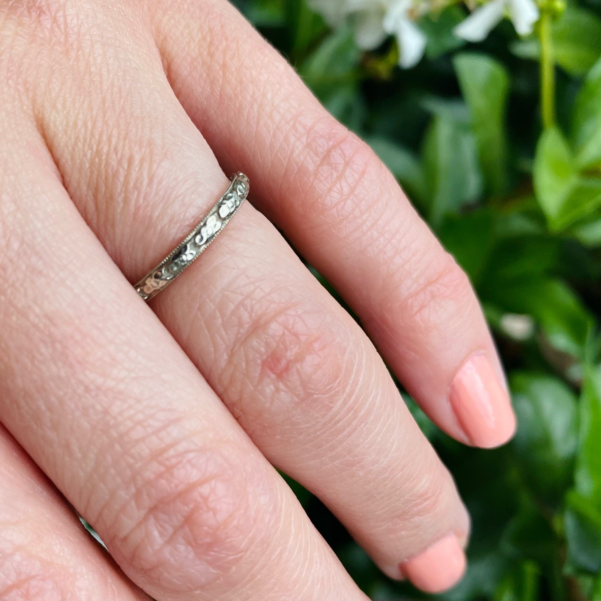 Details.....Currently a size 4.75. This ring may be sized down one size or up two sizes free of charge. Please contact us if you need this ring sized outside of this parameter, it may be possible and will have a small fee. The band measures 2mm wide. In Very Good Vintage Condition. You should expect all vintage and antique jewels to show some wear, we consider it part of their charm.