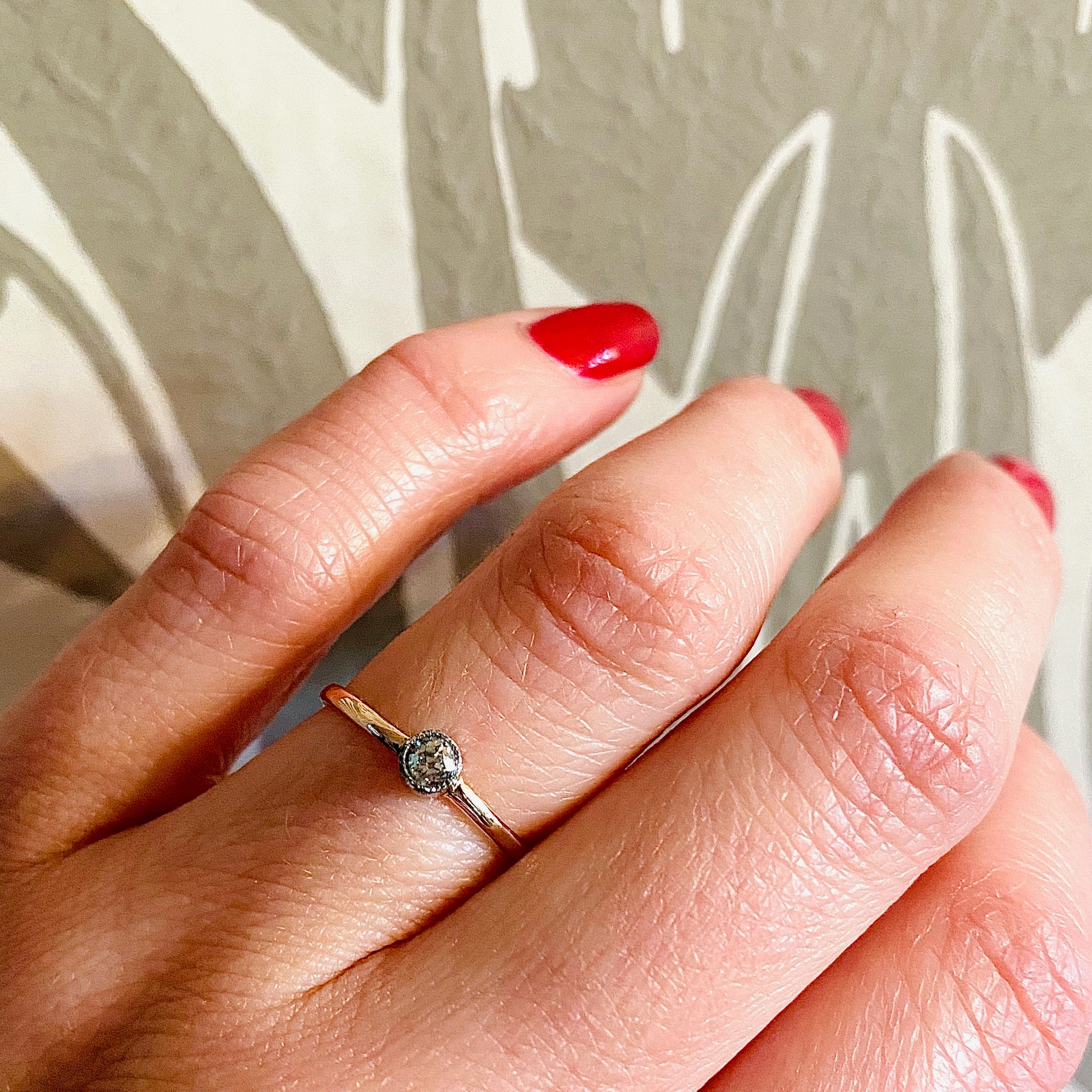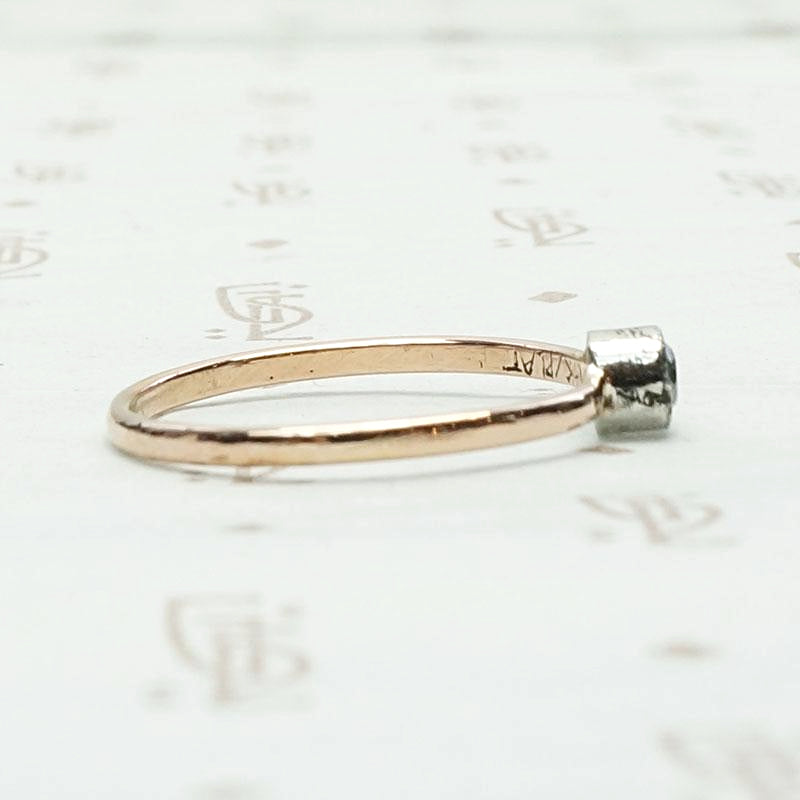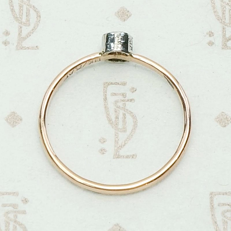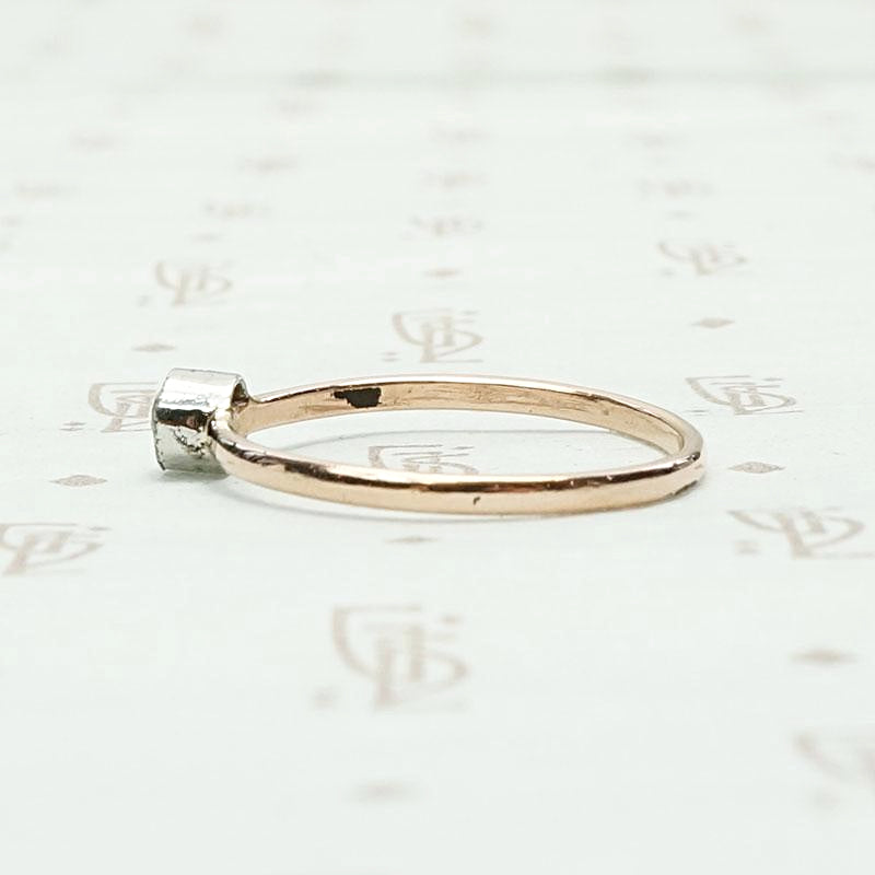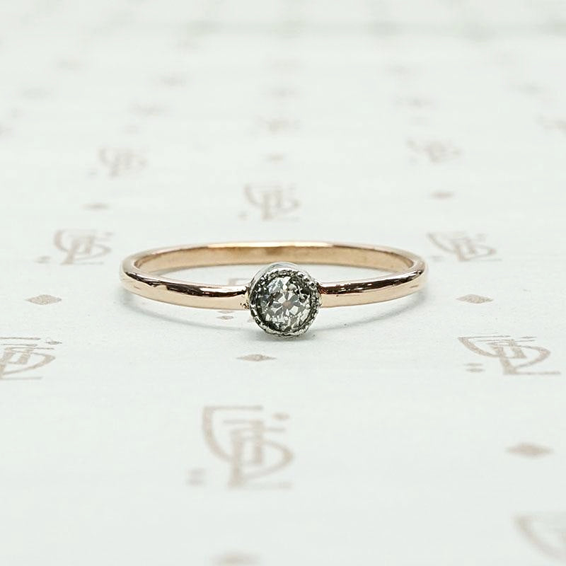 This sweet and petite solitaire ring features a 0.16 carat old european cut diamond. The diamond is set its original antique platinum milgrain bezel that dates to the 1890s. Our jewelers have added the modern recycled 14k rose gold band.