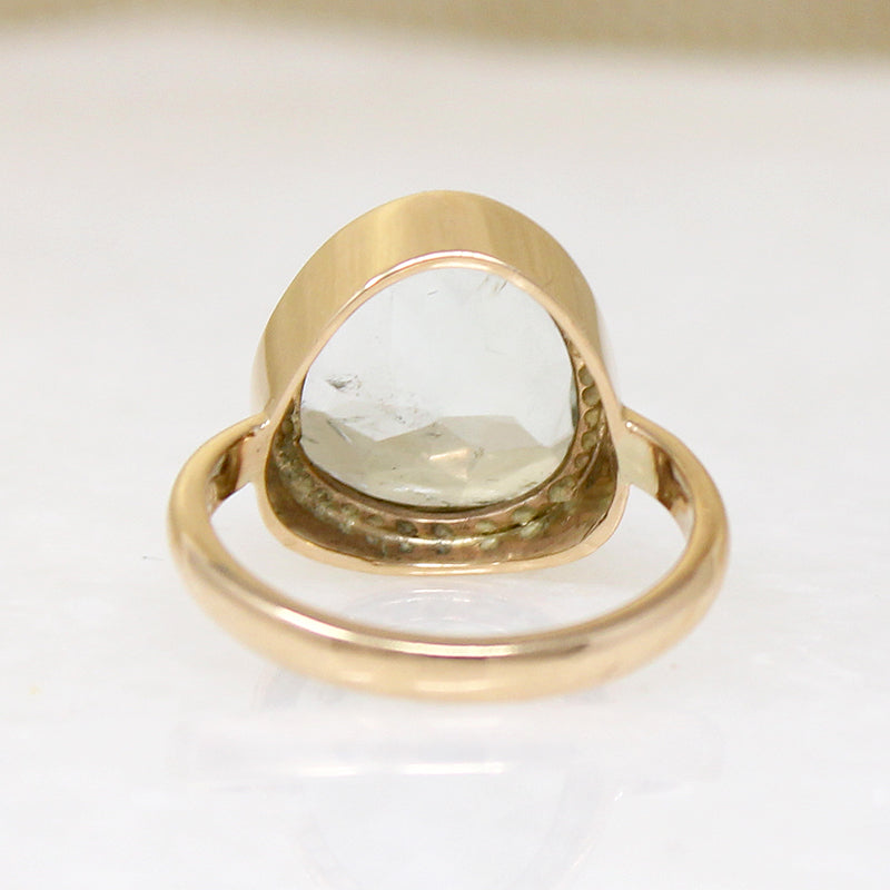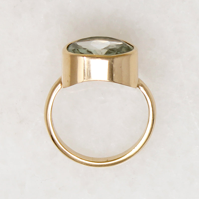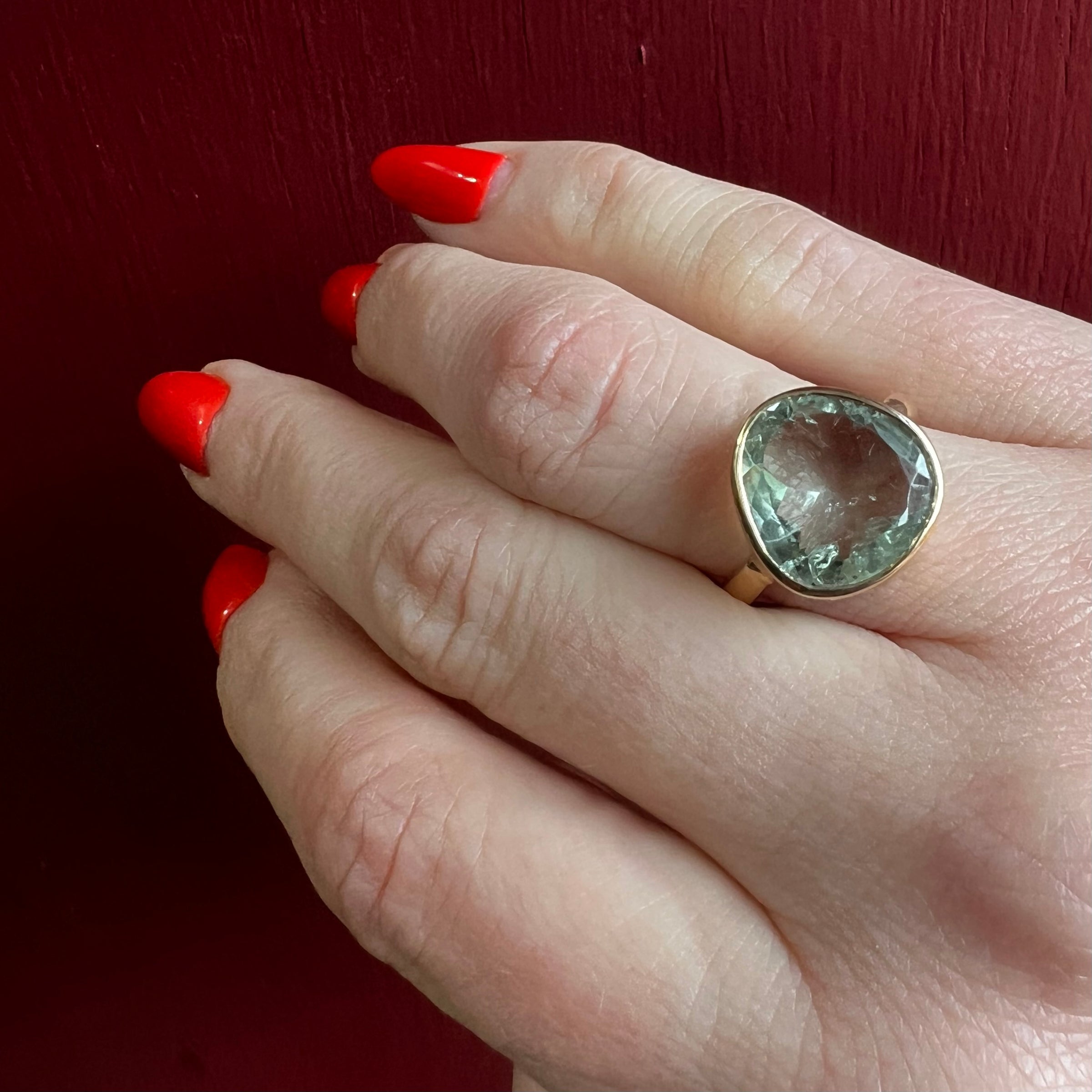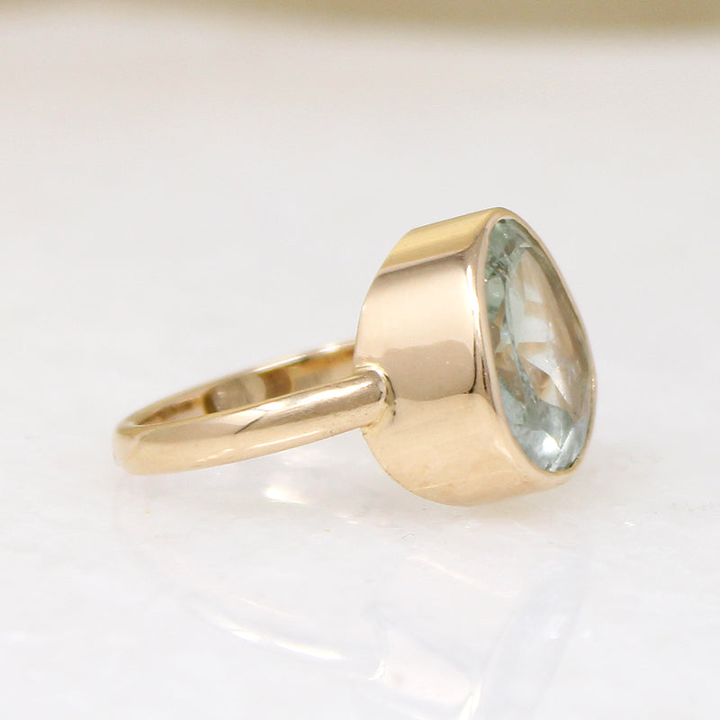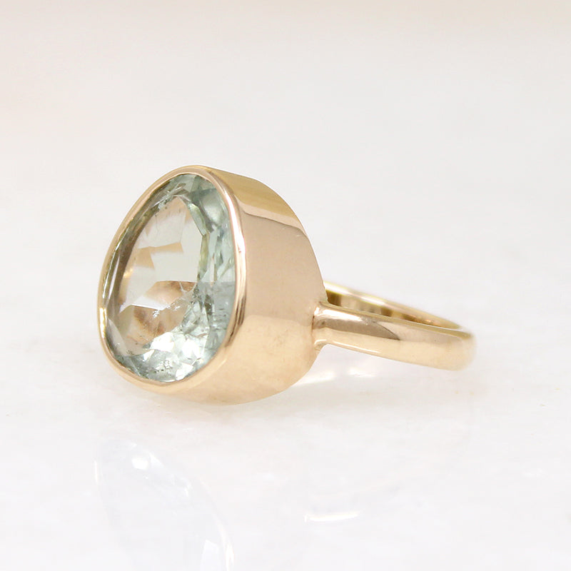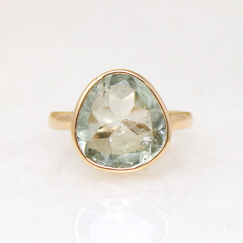 This Organics ring showcases a wonderful aquamarine gemstone. The irresistible gem has a fresh, icy pale-teal color, with a flat table and faceted back and edges. The aquamarine is set in a sleek, elegant gold bezel, perfectly contoured for this uniquely shaped stone. The 14k gold ring's gallery is curved to fit the finger comfortably, and the band has a pleasing half-round weight.