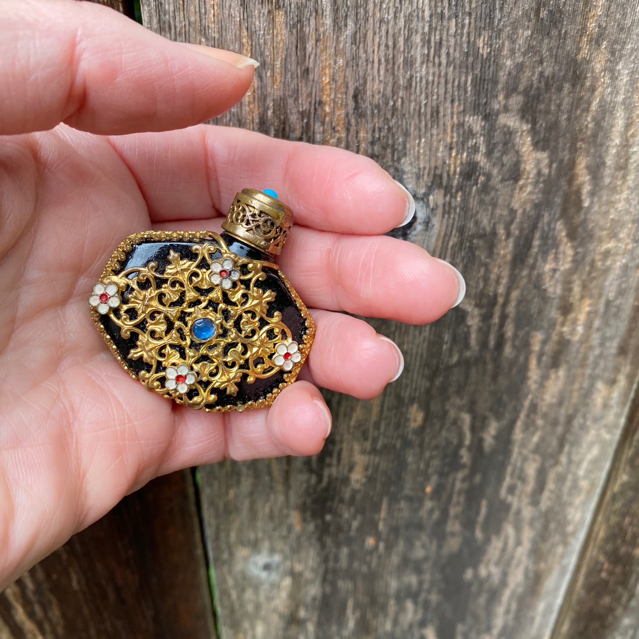 Details.....The bottle measures 1.70" by 1.60". In Very Good Vintage Condition. You should always expect some wear on vintage and antique jewels, we consider it part of their charm.