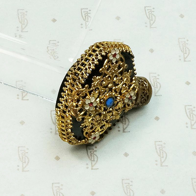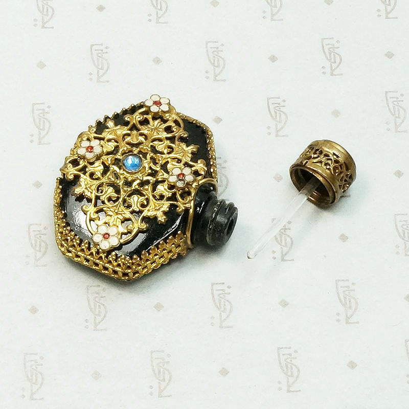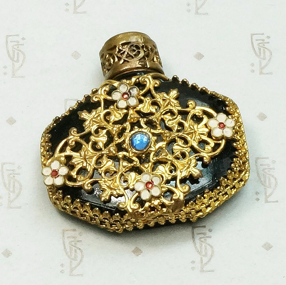 This elaborate perfume bottle has all of the fantastic detail Czech jewels are known and loved for. A black glass perfume bottle is wrapped in ornate brass filigree. The jeweler's brass is decorated with pretty enamel flowers and blue glass gems. The bottle is in very good condition with no chips. This piece is absolutely in usable condition. The stopper unscrews and a perfume applicator is integrated into the stopper. A decadent addition to your boudoir's decor. Circa 1920.
