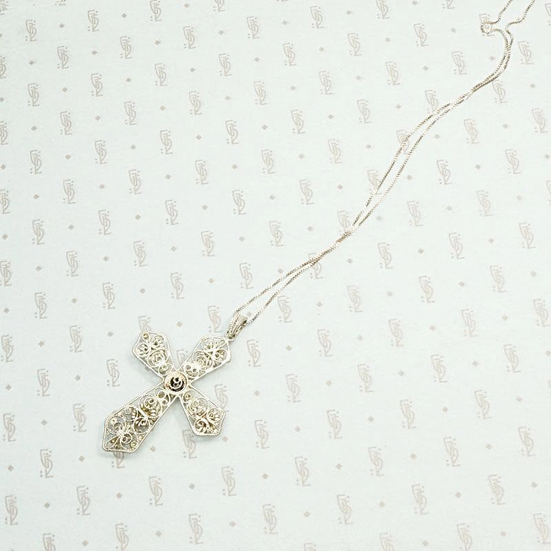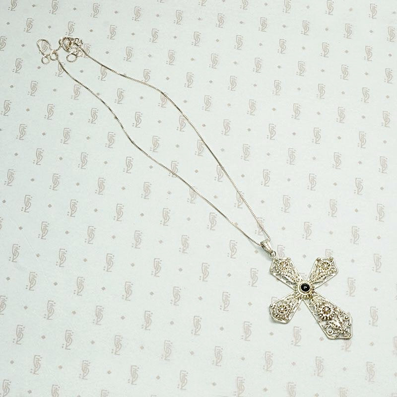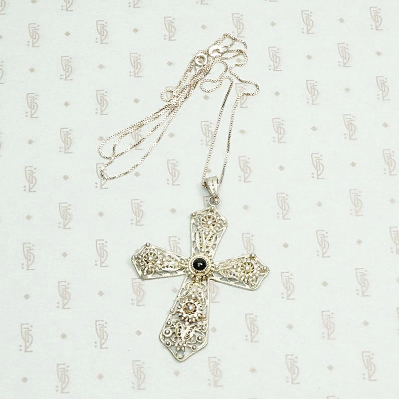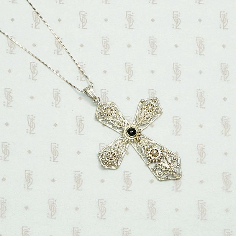 An ornate silver cross necklace set with onyx. The sterling silver cross is filigreed with leaves and daisies. The decorative bale is engraved. Beautiful metalwork, such a pretty piece. Circa 1950.