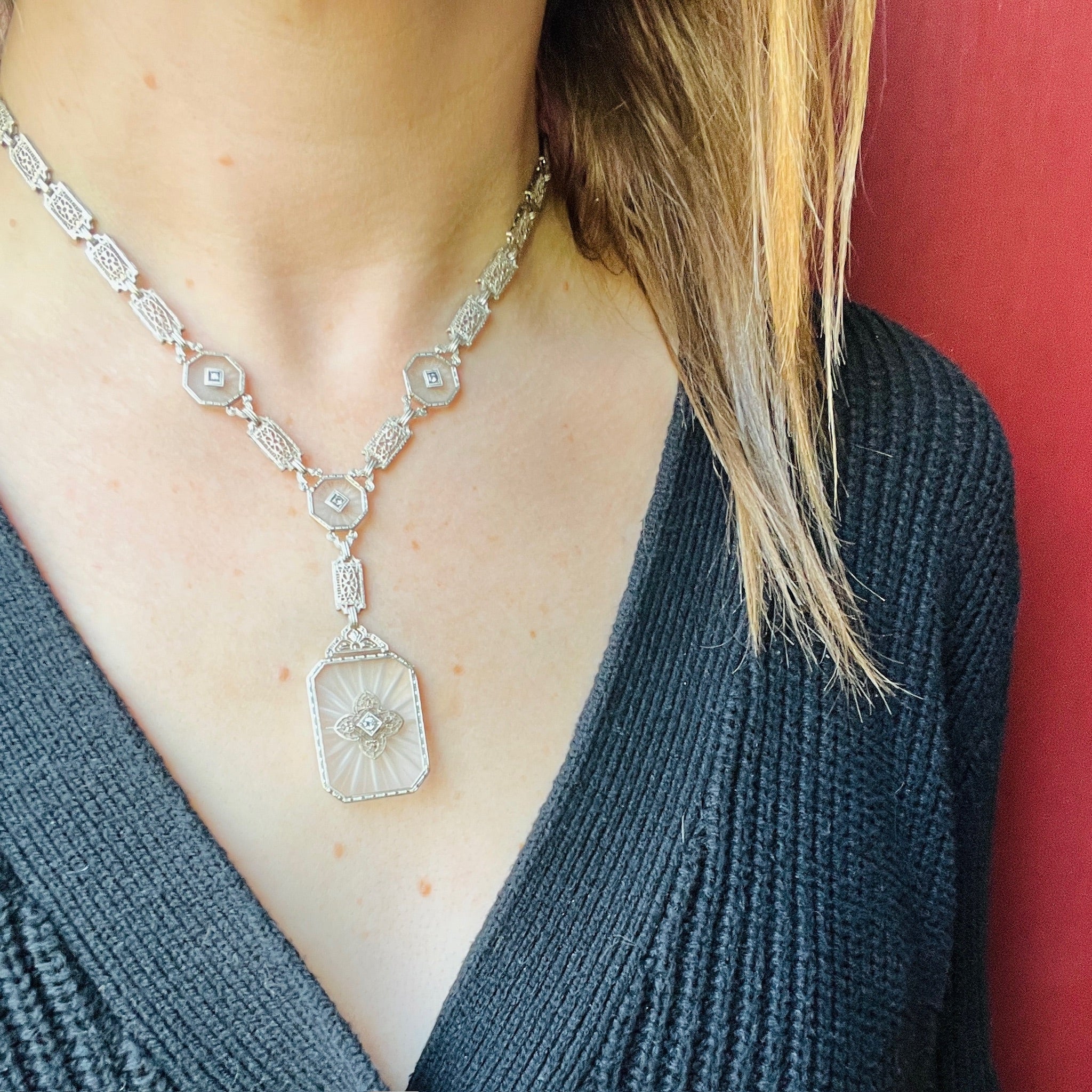 This camphor glass necklace has everything ... a chain of exquisitely filigreed white gold links ... three hexagonal camphor glass accent links ... a large etched and frosted camphor glass pendant with a decorative bale, and a bright diamond set in its filigreed quatrefoil heart. Each plaque of sun-rayed glass is set in a frame of engraved 14k white gold and set with a wee diamond. Every detail is perfect; even the spring ring clasp is elevated with delicate engraving. Circa 1920.
