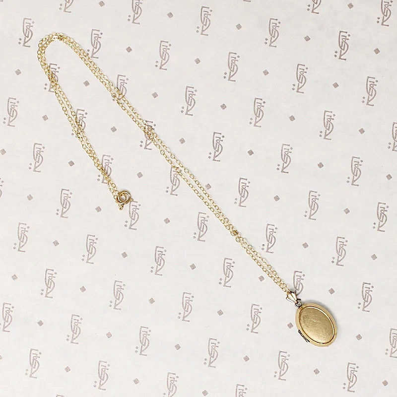 A pretty Edwardian gold filled locket. The oval locket is ridged around the front and pinstriped on the back. The interior is in clean condition, with both frames intact. This locket has a fan-shaped decorative bale and it hangs from a modern gold filled chain. Circa 1910.