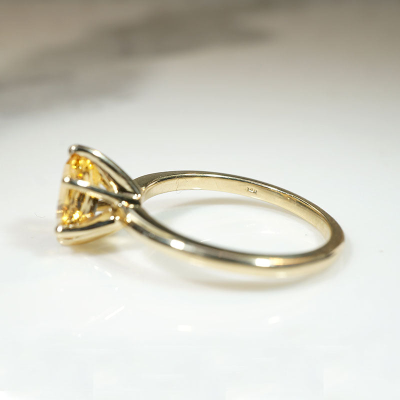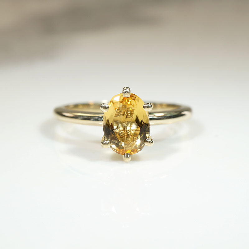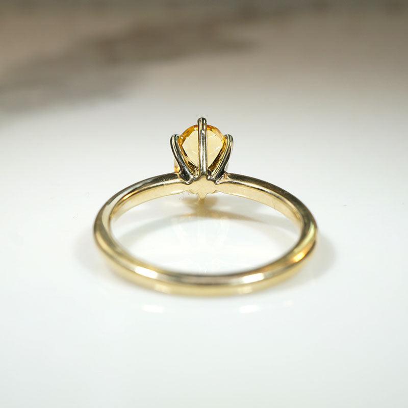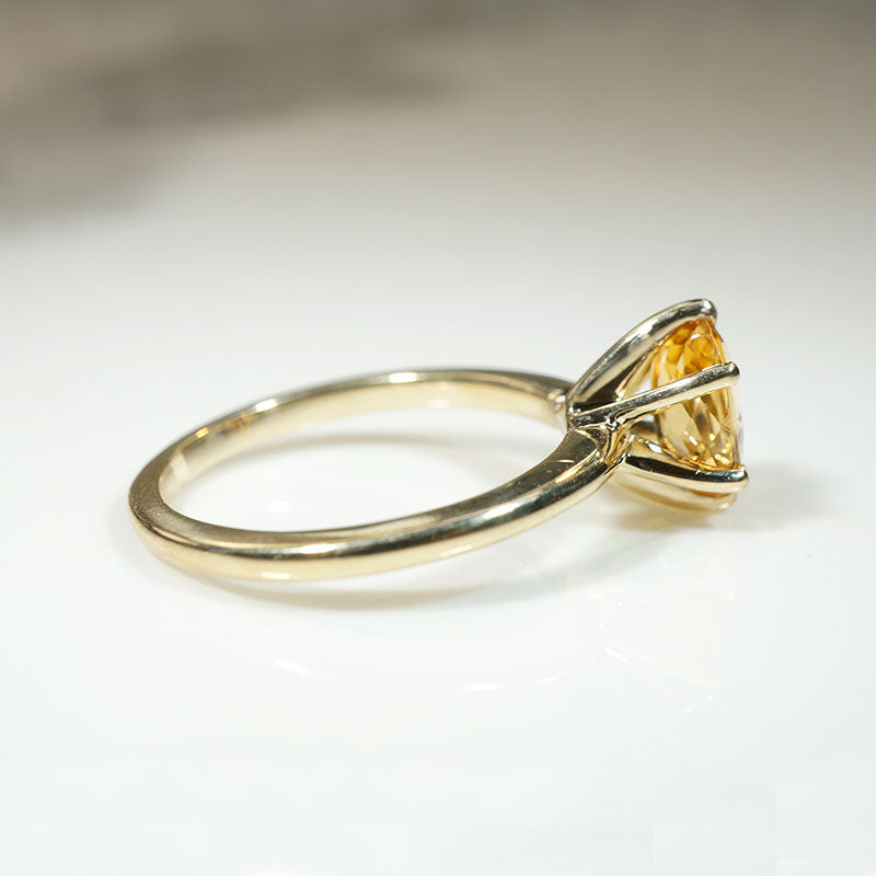 This artisan solitaire ring showcases an oval-cut imperial topaz, glowing like a warm drop of honey in the sun. The 1.52ct antique topaz is set simply in recycled 14k yellow gold. A raised six-prong head allows lots of light to pass through and illuminate this stunning stone.