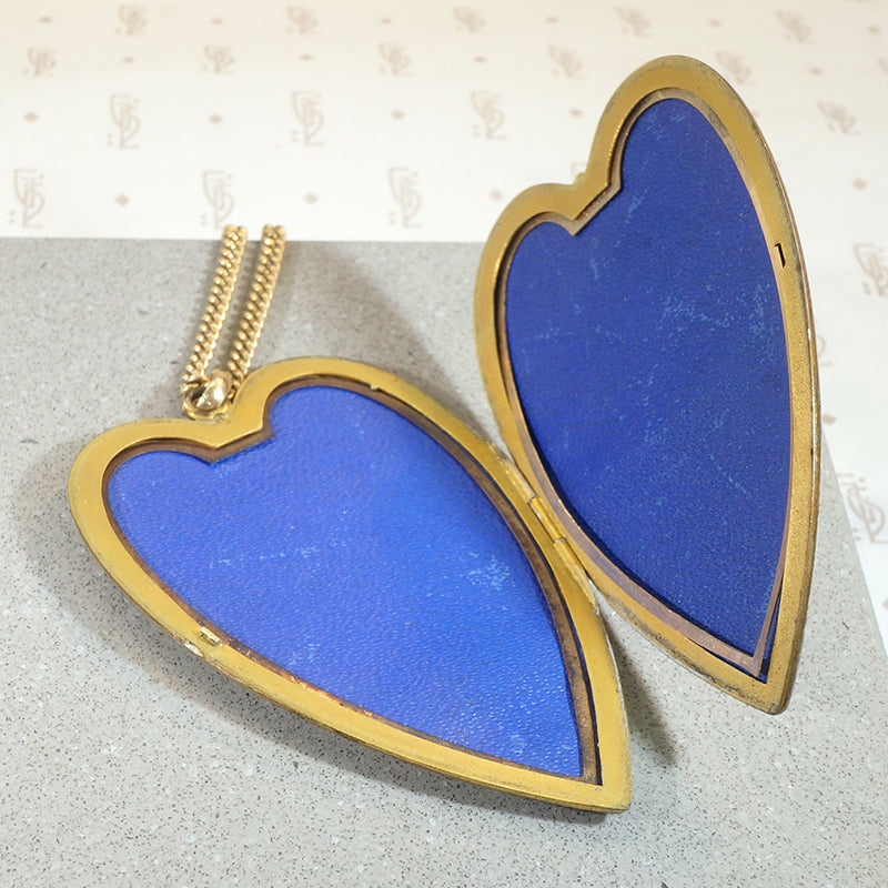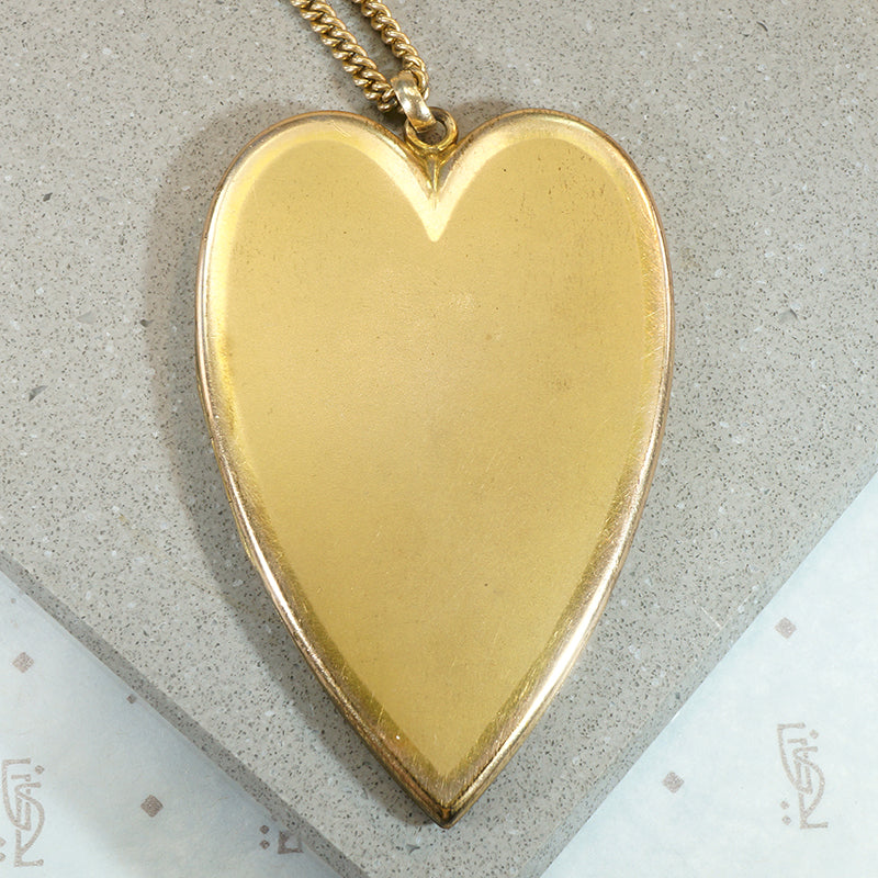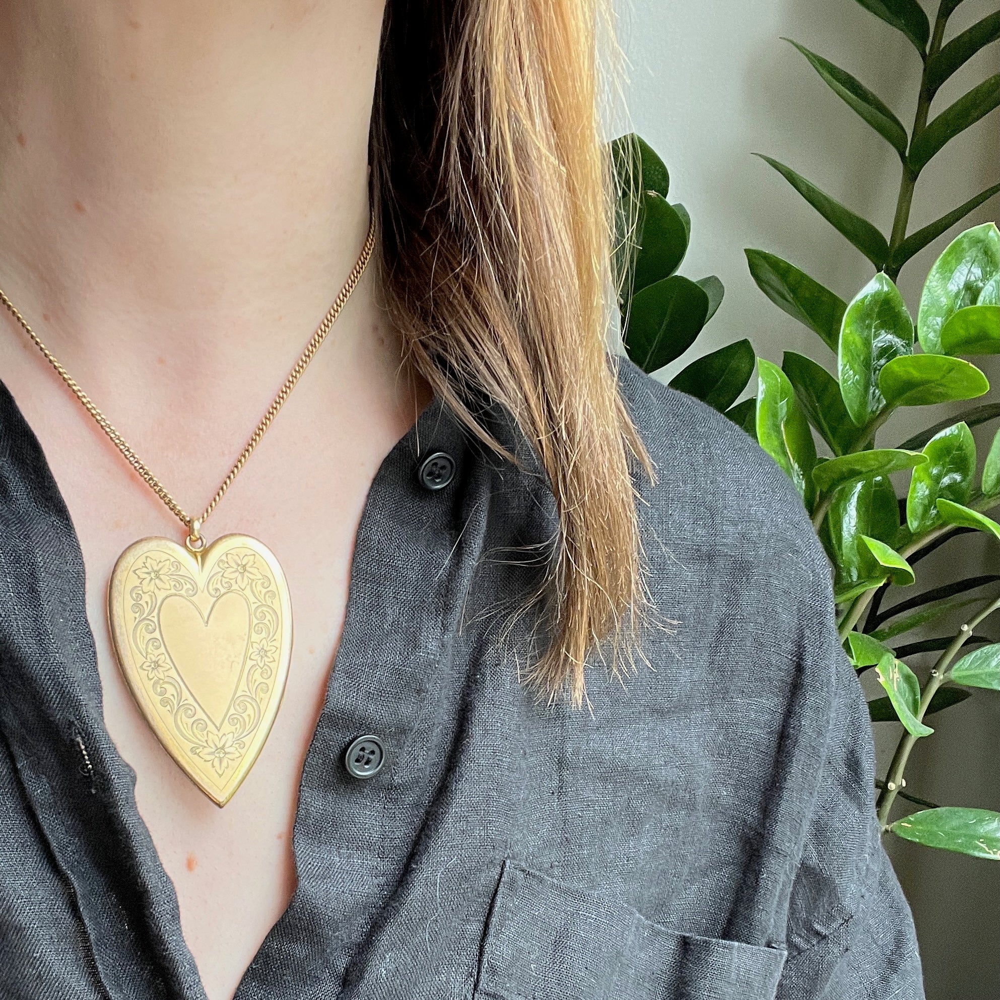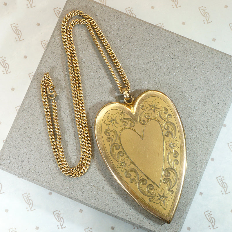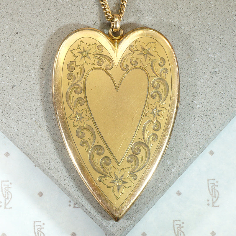 An oversized heart-shaped locket engraved with a delicate floral pattern. The gold-filled heart is subtly elongated, with a polished edge and matte back. The interior is in clean condition, papered in purple with no frames or glass. This locket has a jump ring bale and hangs from a vintage gold-filled cable chain. So very pretty and romantic, a perfect Mother's Day gift. Circa 1950.