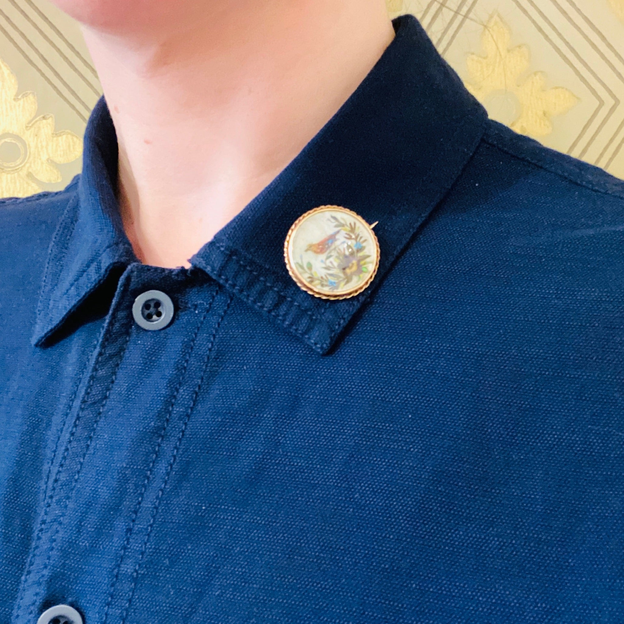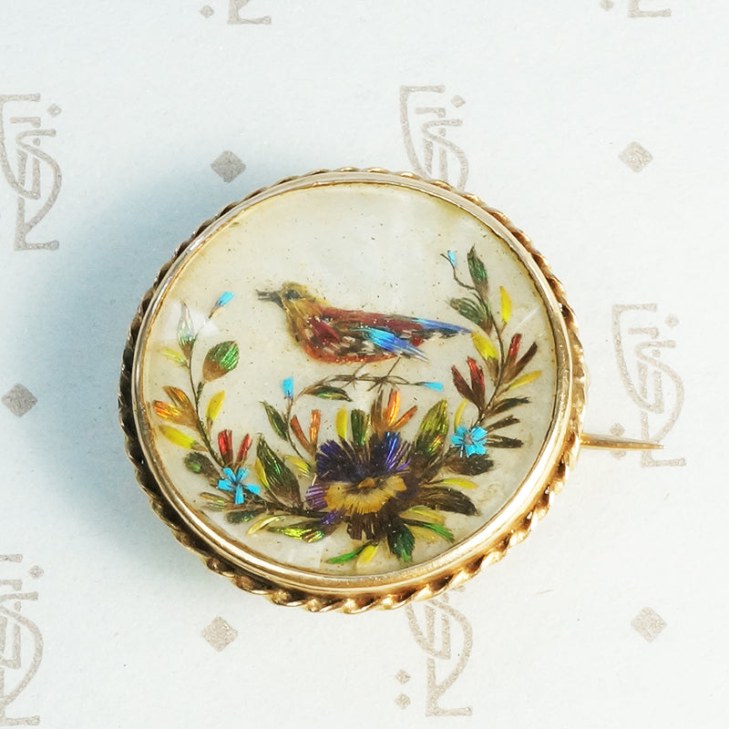 This wonderful 19th century unique little work of art is created completely of feathers! The scene of a colorful songbird on a garland of flowers is so realistic. The ground the picture is created on is a curved bowl of mother of pearl, the sheen and the shape of the mother of pearl adds to the 3 dimensional quality of the picture. The garland of flowers is comprised of little blue forget me nots and at the bottom a mesmerizing pansy in deep purple and brilliant yellow. circa 1880, 14k yellow gold.