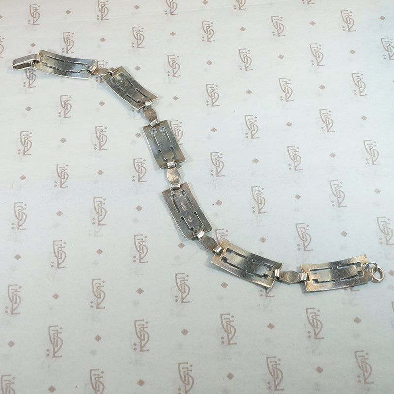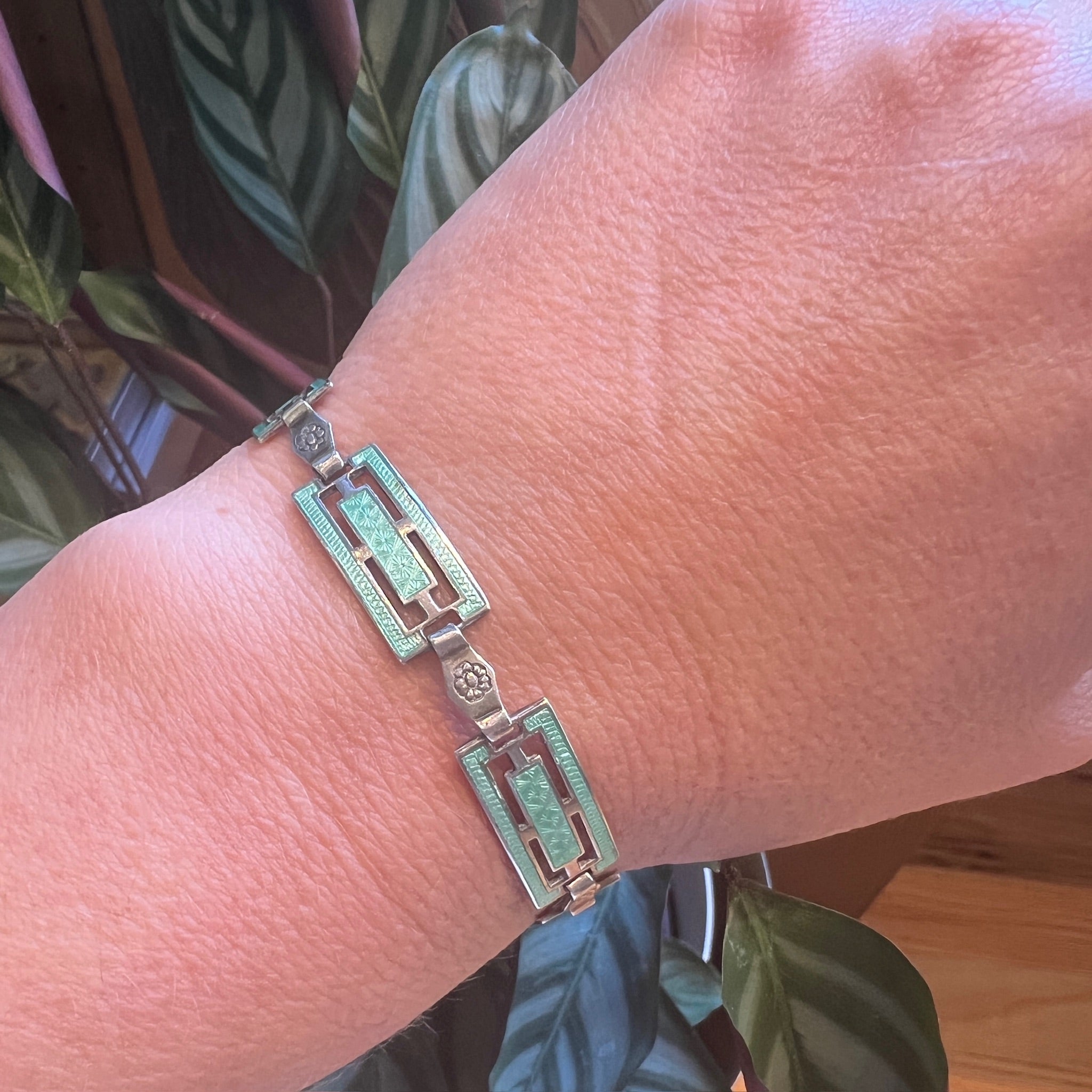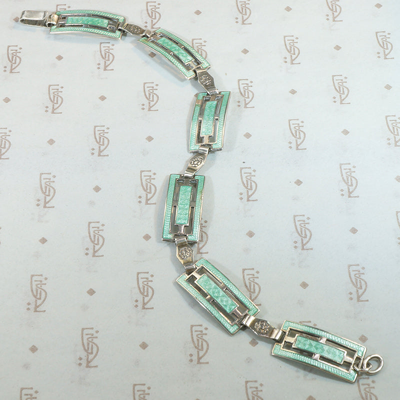 Pale green guilloché enamel beautifies this fresh and lovely Art Deco bracelet. Rectangular sterling silver links are pierced and engraved, then enameled in minty green. Silver connecting links are engraved with small flowers. The piece fastens with a jump ring and folding clasp. The back of this lightweight bracelet is marked "935s OXO." Circa 1930.