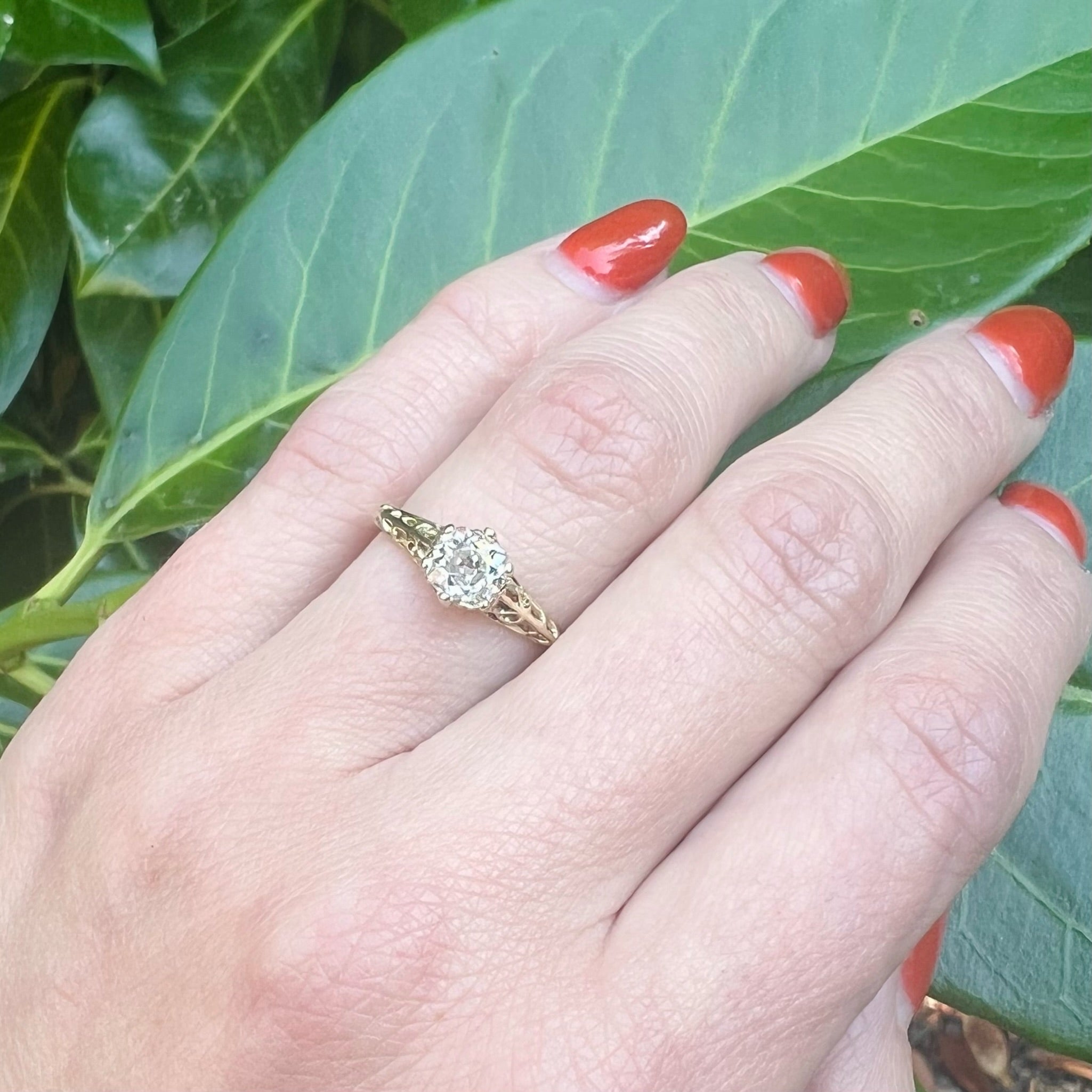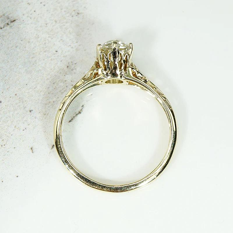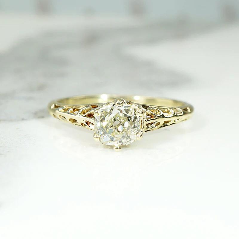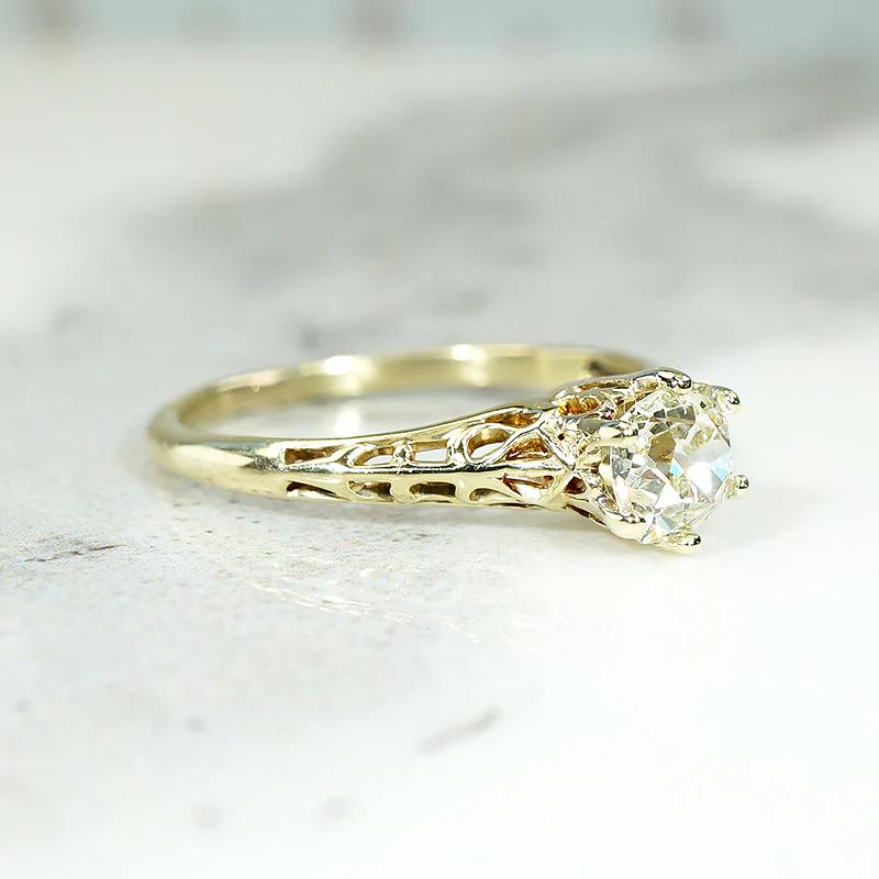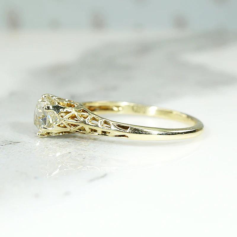 Pale Yellow Old Mine Diamond in Lacy Gold Solitaire