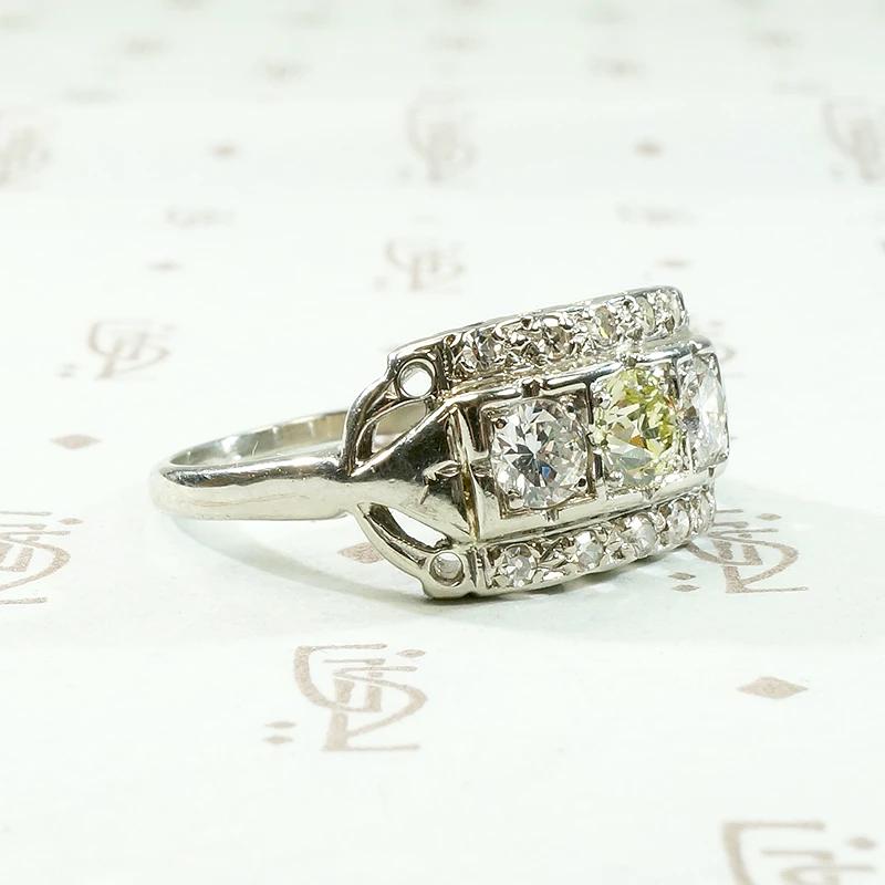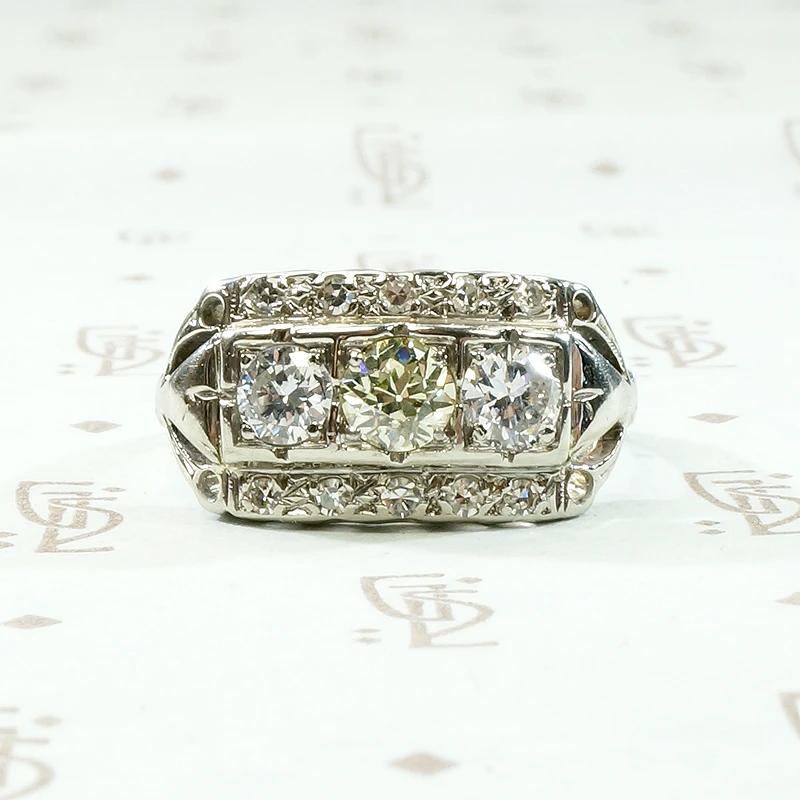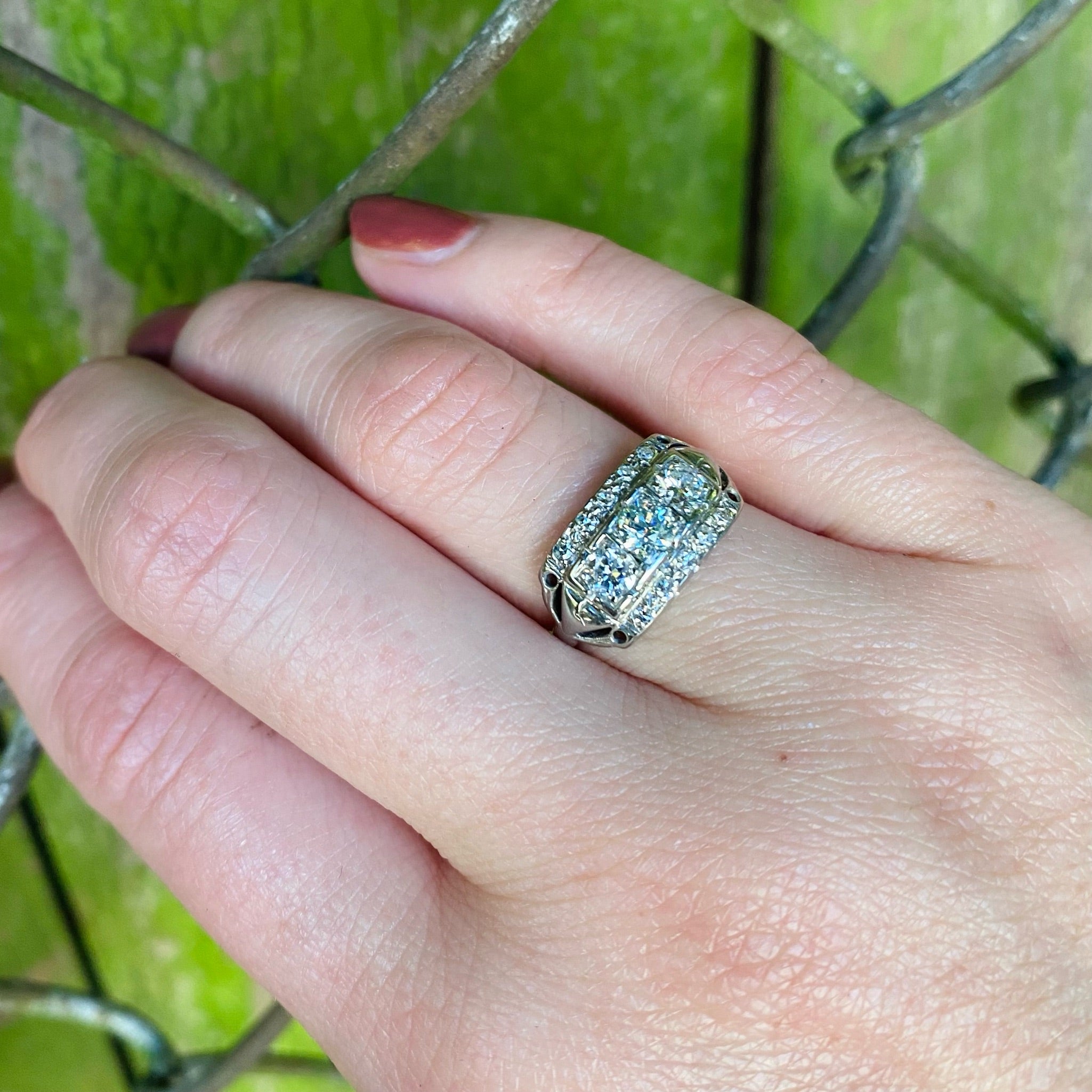 A vintage panel ring with delightful sparkle and presence. 0.75ct of glittering diamonds are set east/west over the top of this 14k white gold ring. Three round stones are set in boxes horizontally across the middle; the central diamond is largest, with a fresh pale yellow color. The two flanking diamonds compliment it with their bright white color. Ten smaller accent diamonds are set along the top and bottom edges. Openwork shoulders of a geometric design taper into a slim band. A wonderful engagement ring, wedding band or anniversary gift. Circa 1940.