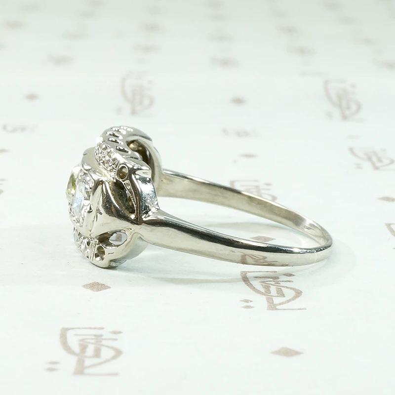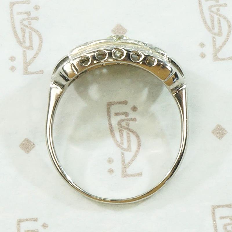 Details.....Currently a size 6.75. This ring may be sized up or down two sizes free of charge. Please contact us if you need this ring sized more than two sizes, it may be possible and will have a small fee. The ring measures 17.5mm by 9mm at the top and 1mm wide at the band. In Very Good Vintage Condition. You should always expect some wear on vintage and antique jewels, we consider it part of the charm.