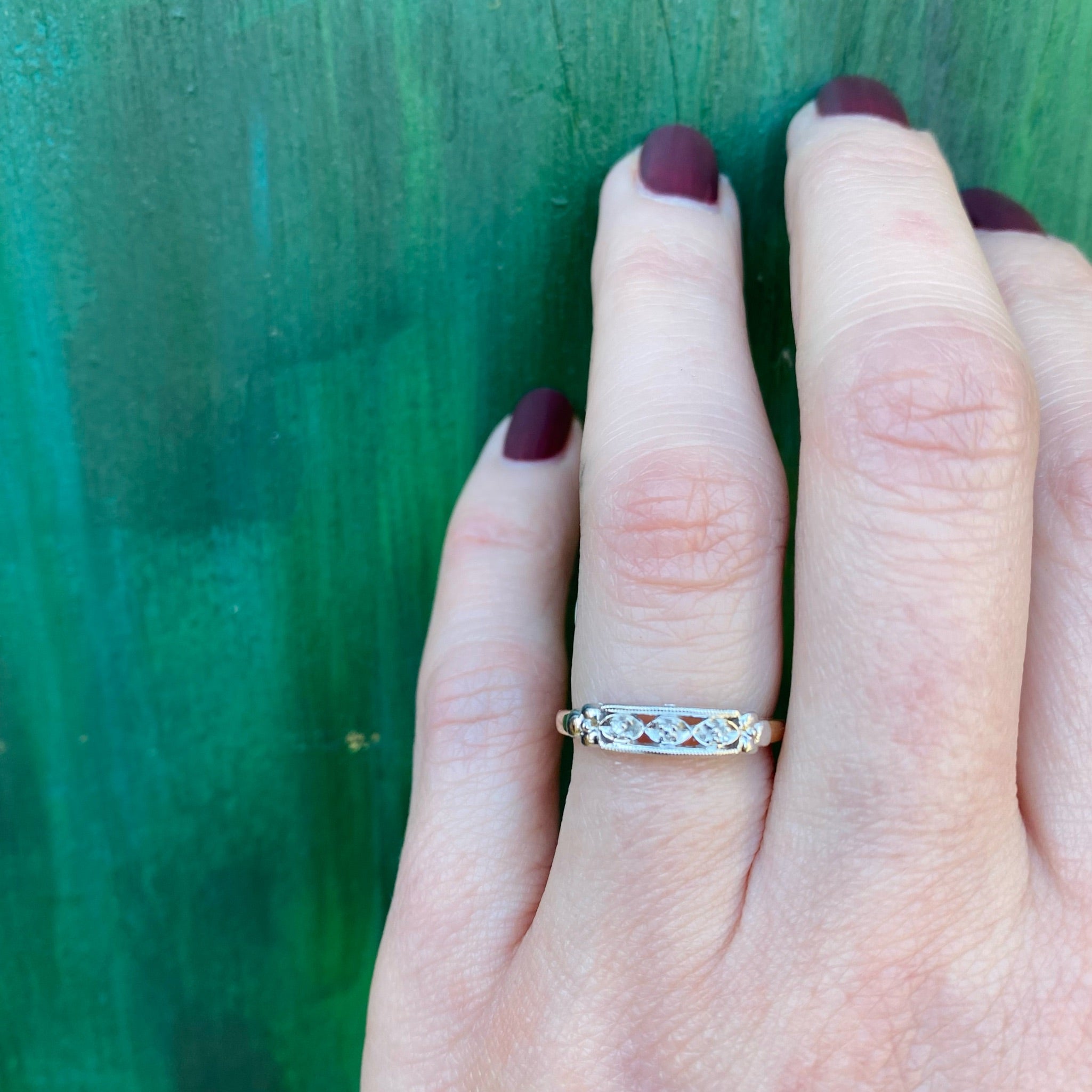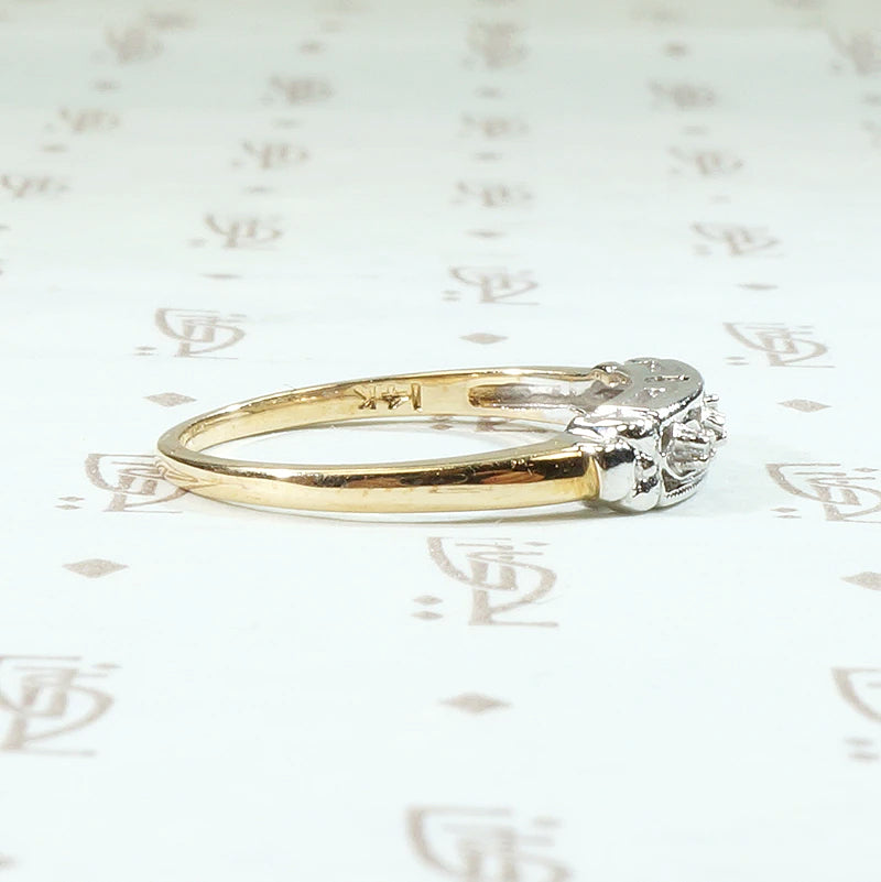 This lovely vintage 14k two tone gold wedding band has the prettiest details in fresh, crisp condition. Three tiny diamonds are set across the white gold top of the ring. The diamonds sit in tiny, fluted ovals that are framed in milgrained bars. Sweet sculpted pansies sit at each shoulder. The body of the ring is tapered yellow gold. This band is New Old Stock, true vintage that has never before been sold to the public. You can be the first person to enjoy this wonderful vintage ring. Circa 1940.