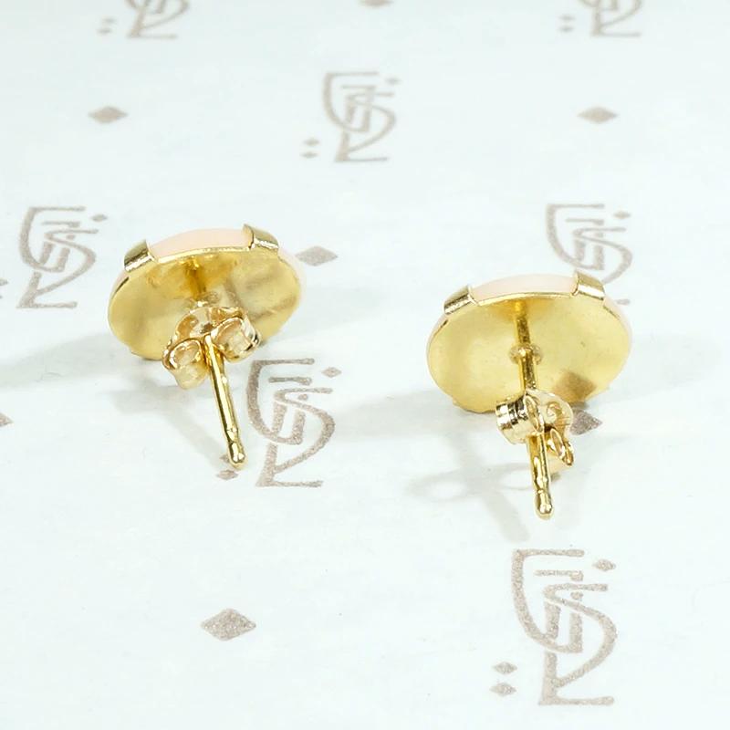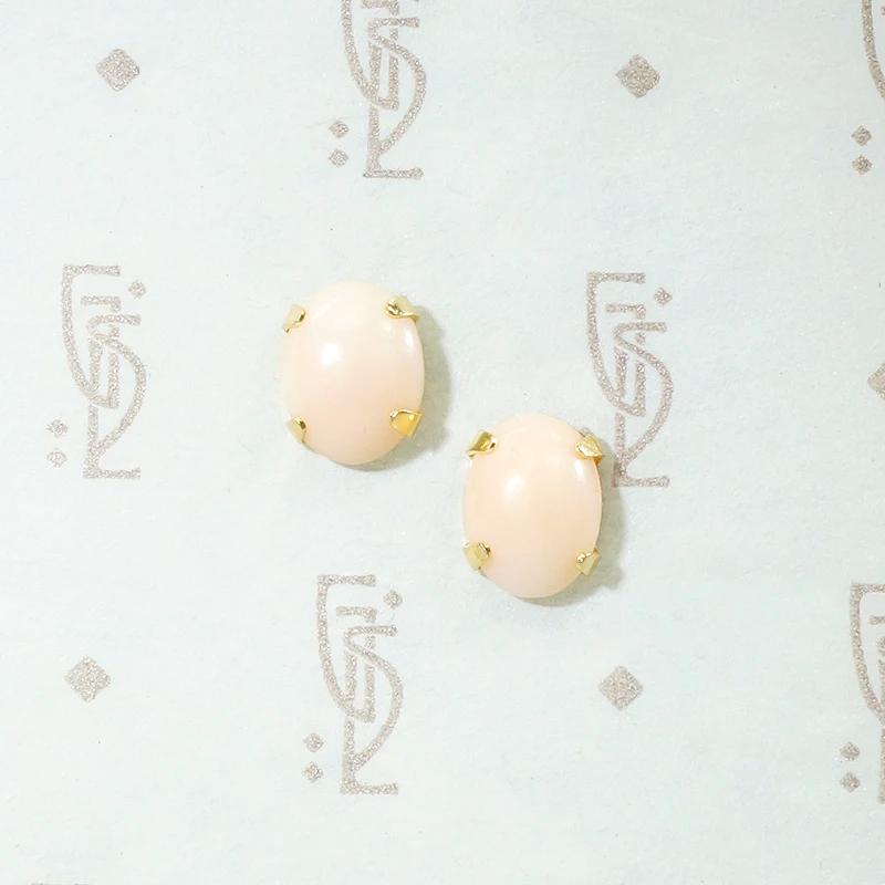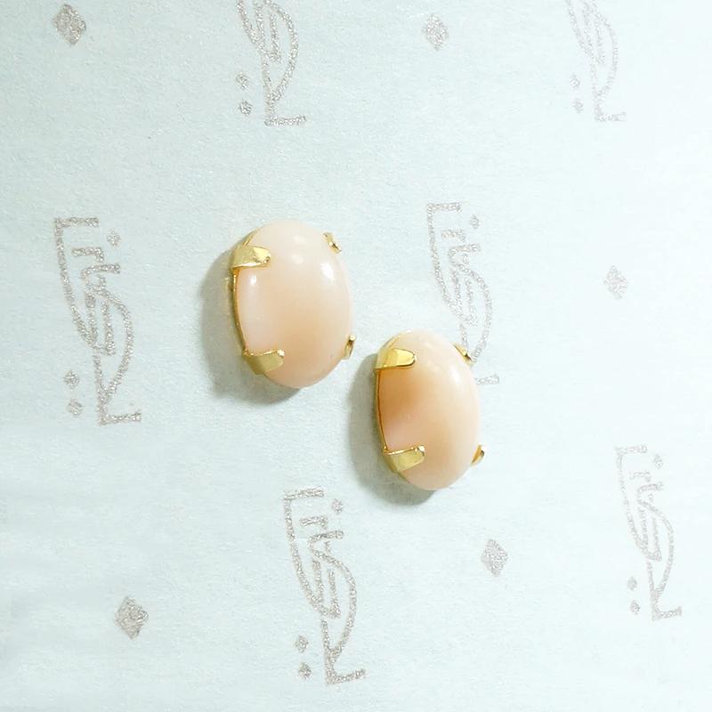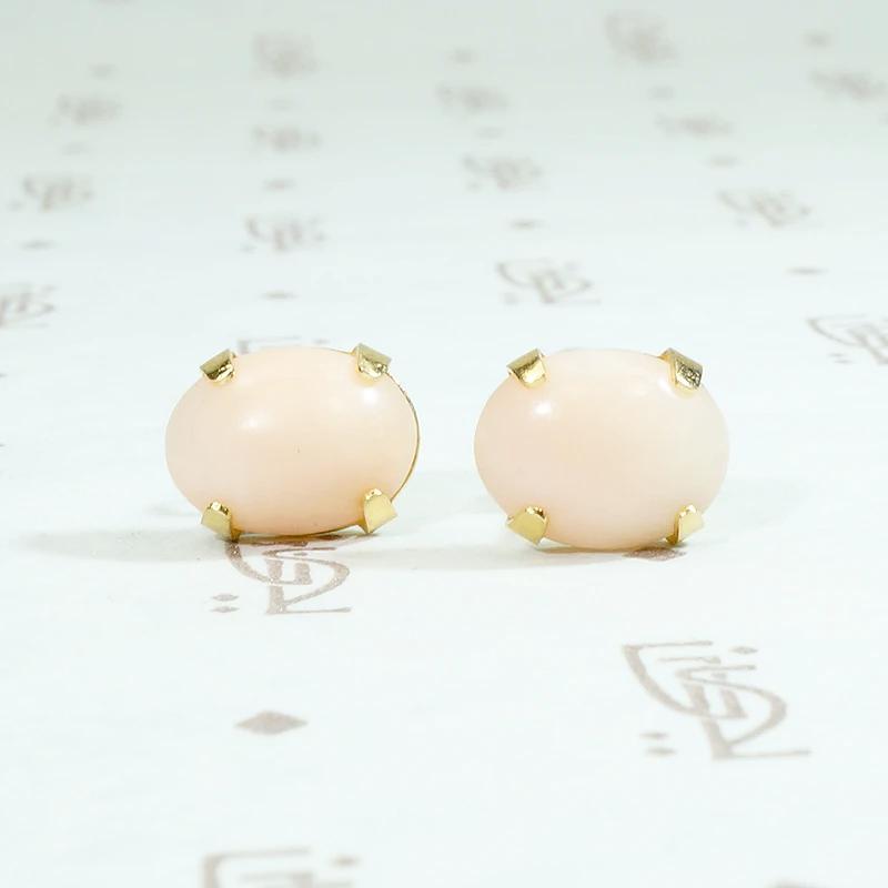 Oval cabochons of the most gently peach-kissed angel skin coral sit in 14k yellow gold stud earrings. The four-prong gold settings display the coral beautifully and compliment its dreamy color to perfection. Comfortable to wear and lovely for any occasion. Circa 1960.
