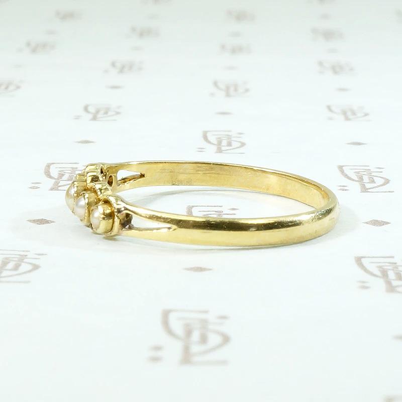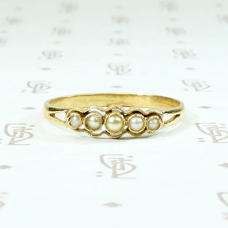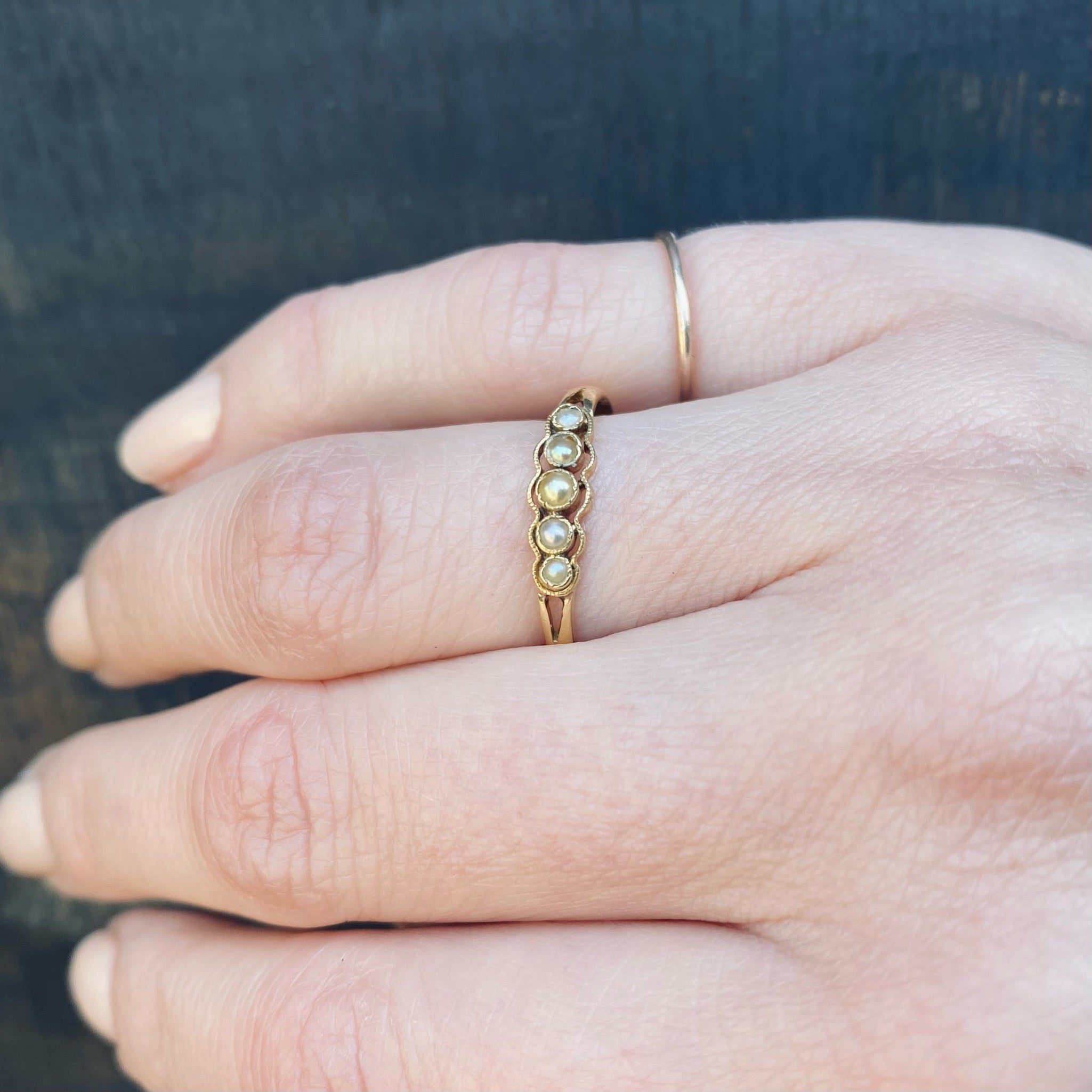 This Victorian beauty displays five creamy natural pearls in a dainty 18k gold band. The small, graduated pearls nestle in milgrained bezels, edged in a light and airy openwork frame of scalloped gold. The pearl-set top sits above split shoulders that taper back into a slim band. A European hallmark is located on the exterior of the shank. This ring is exquisite in its fine delicacy and luxurious colors and textures. Circa 1860.