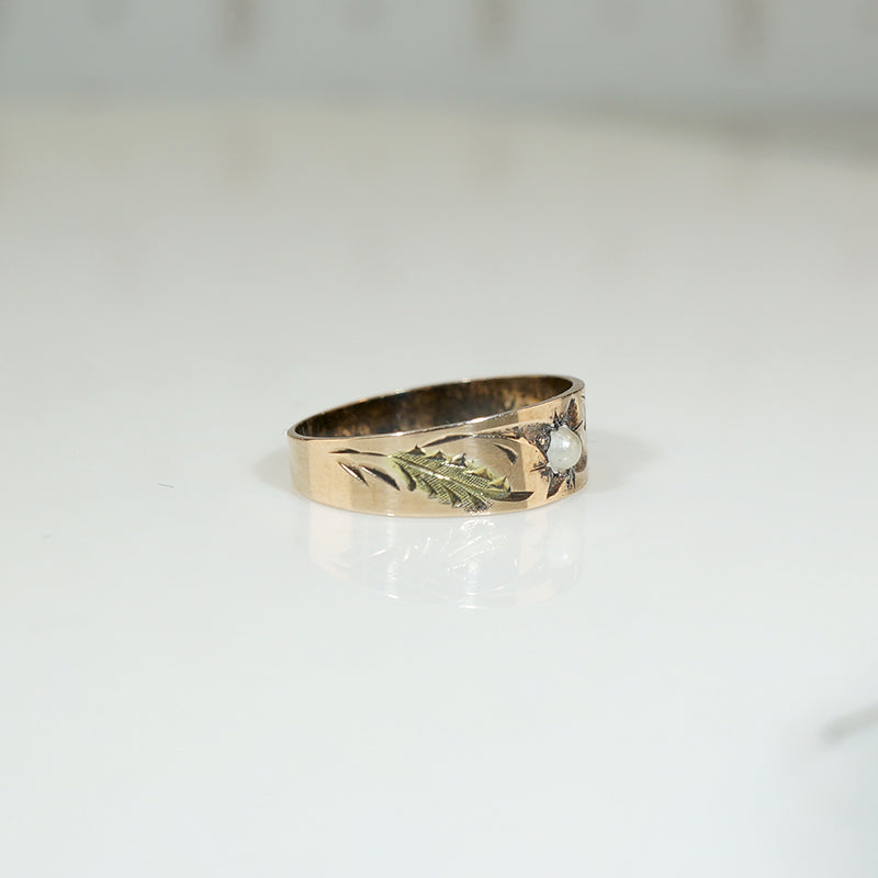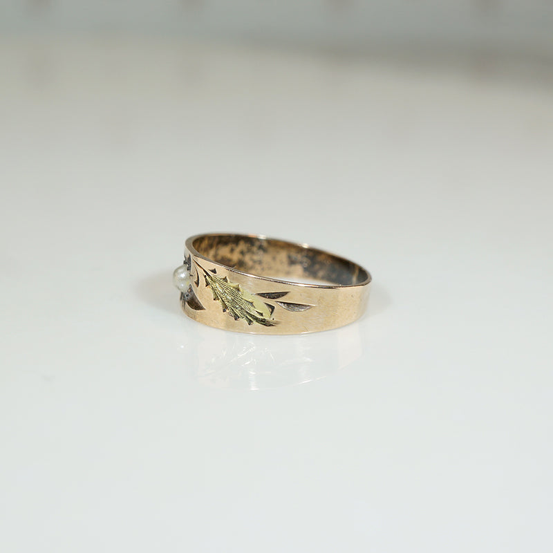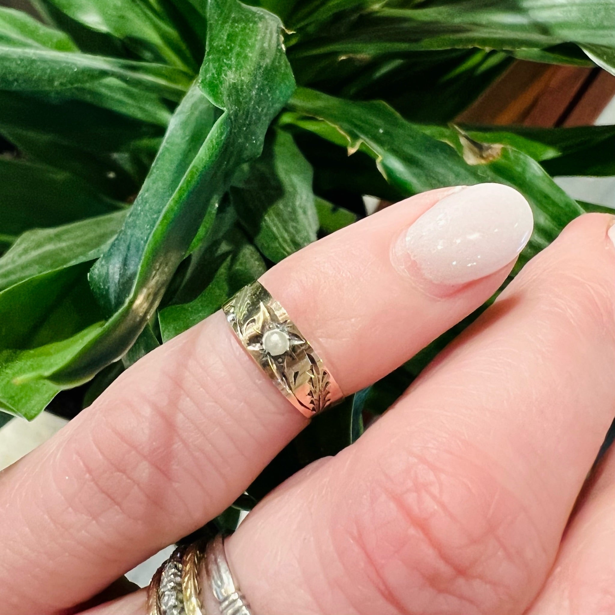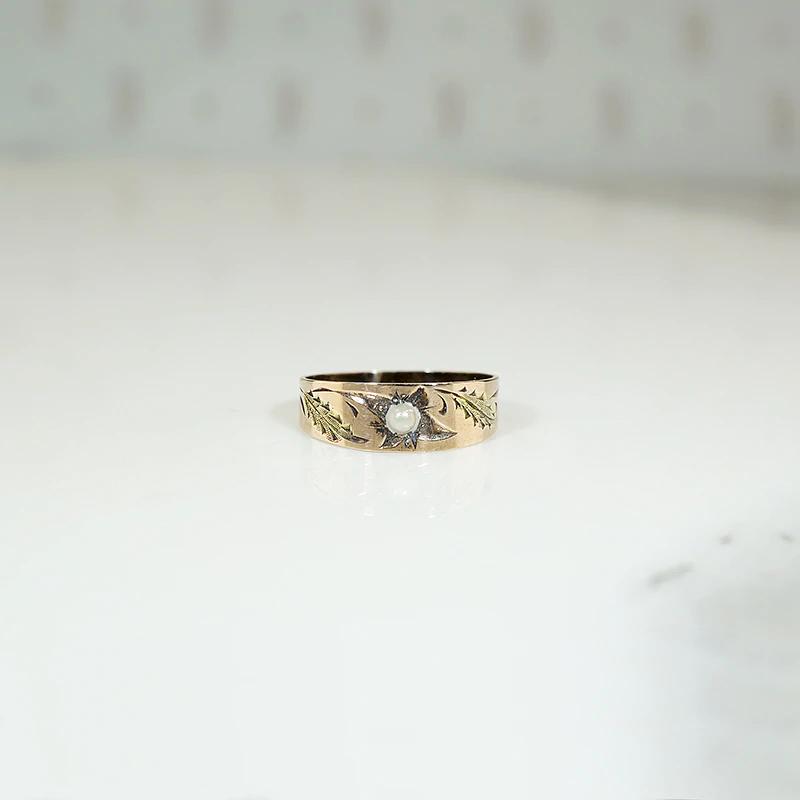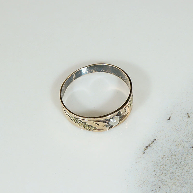 So much wonderful detail packed into such a wee Victorian ring. The 10k yellow gold flat band has a decorative front that tapers into a narrow shank. The ring is set with a bitty natural pearl and is accented with engraved green gold leaves. Lovely lily-like engraving frames the sweet pearl. Tiny rings were quite popular at the turn of that century, they were often presented as Christening gifts. For safety's sake we don't recommend allowing small children to wear these rings, but they make great midi rings or charming pendants when threaded on a chain or ribbon. Circa 1860.