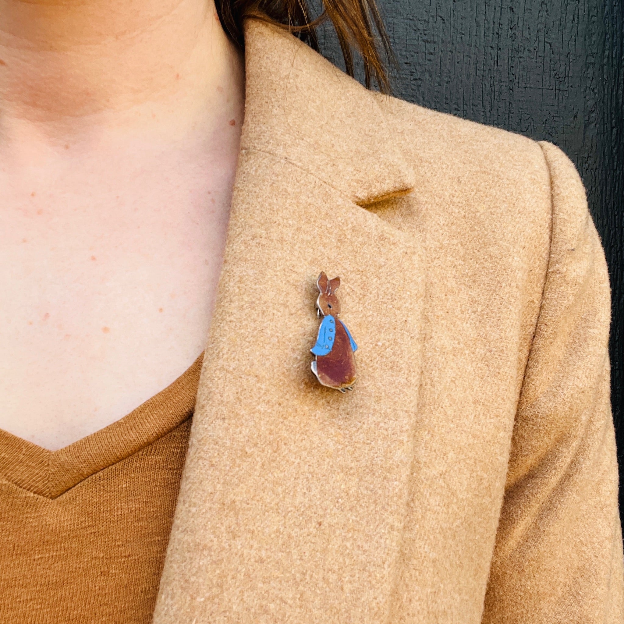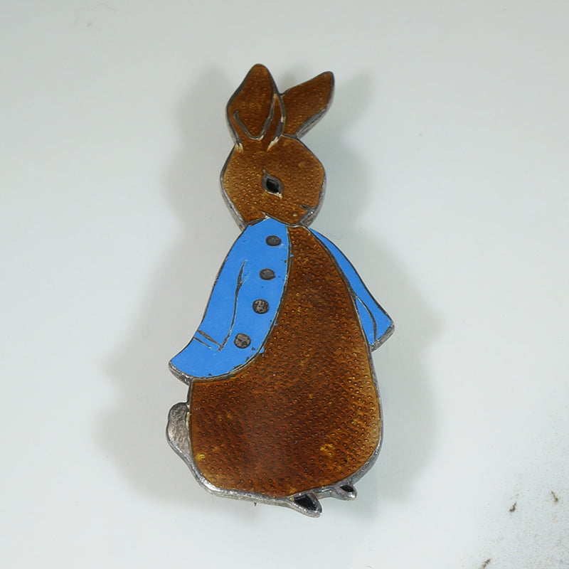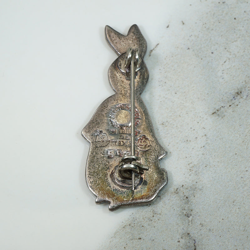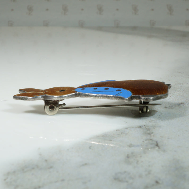 This adorable brooch from Margot de Taxco looks a lot like Beatrix Potter's character Peter Rabbit. Champlevé enamel is applied to sterling silver; he wears a little blue coat over his velvety brown fur. His shy little face is so very sweet. This brooch fastens with a security clasp. The back is stamped "Margot de Taxco," "Made in Mexico Sterling," and twice with the Mexican Eagle 16 sterling mark. It is also marked with the design number 5422. Margot de Taxco's designs were numbered 5100 to 5790, so this is her 322nd design. This piece was made around 1948, at the height of her career.