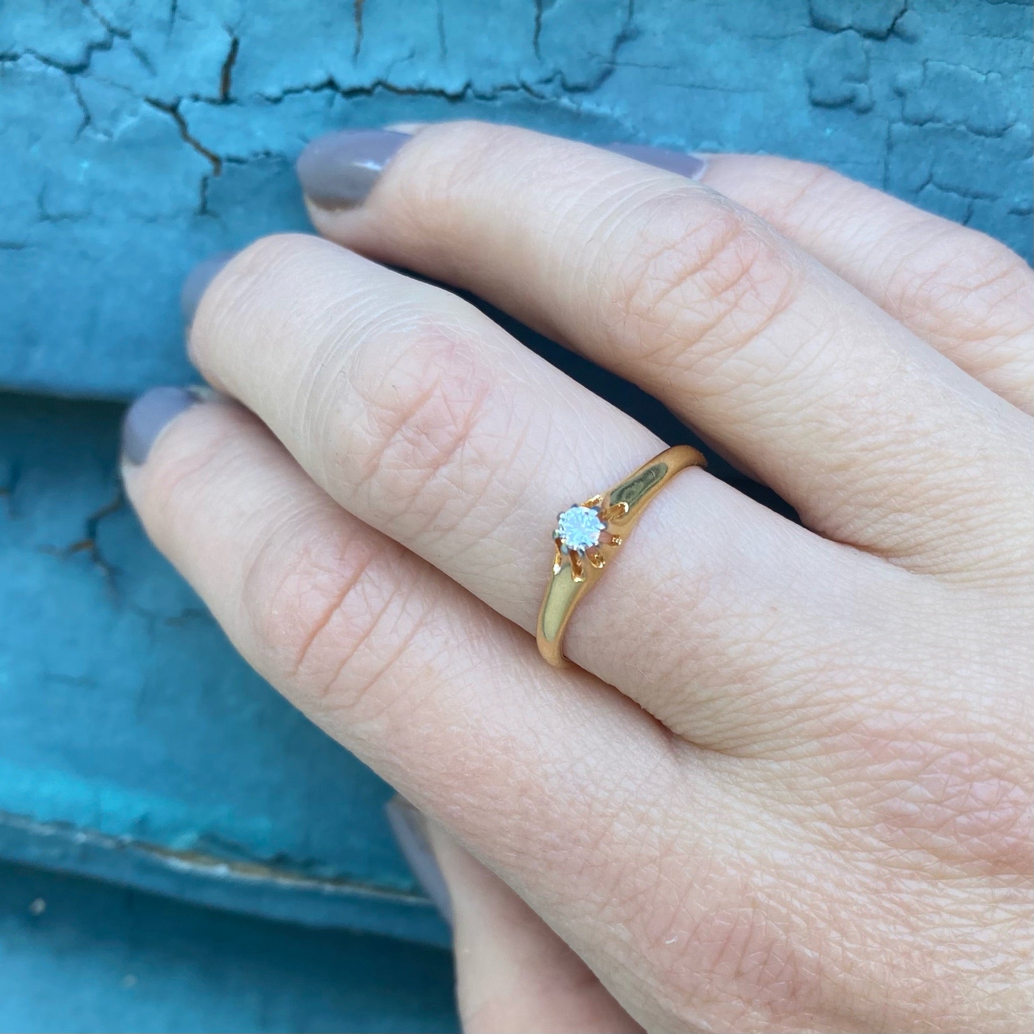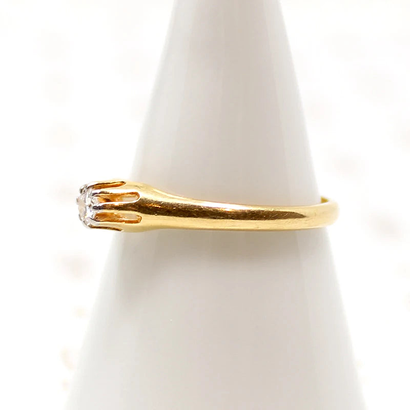 This petite English engagement ring is utterly charming. A pretty round 0.10ct diamond is set in a rich 18ct yellow gold buttercup setting. The prongs are tipped in platinum, a delicate detail that accents the bright diamond. The setting curves gently from the buttercup-shaped top to the tapered band. Circa 1930.