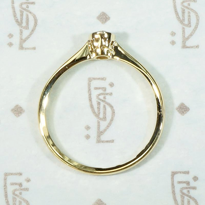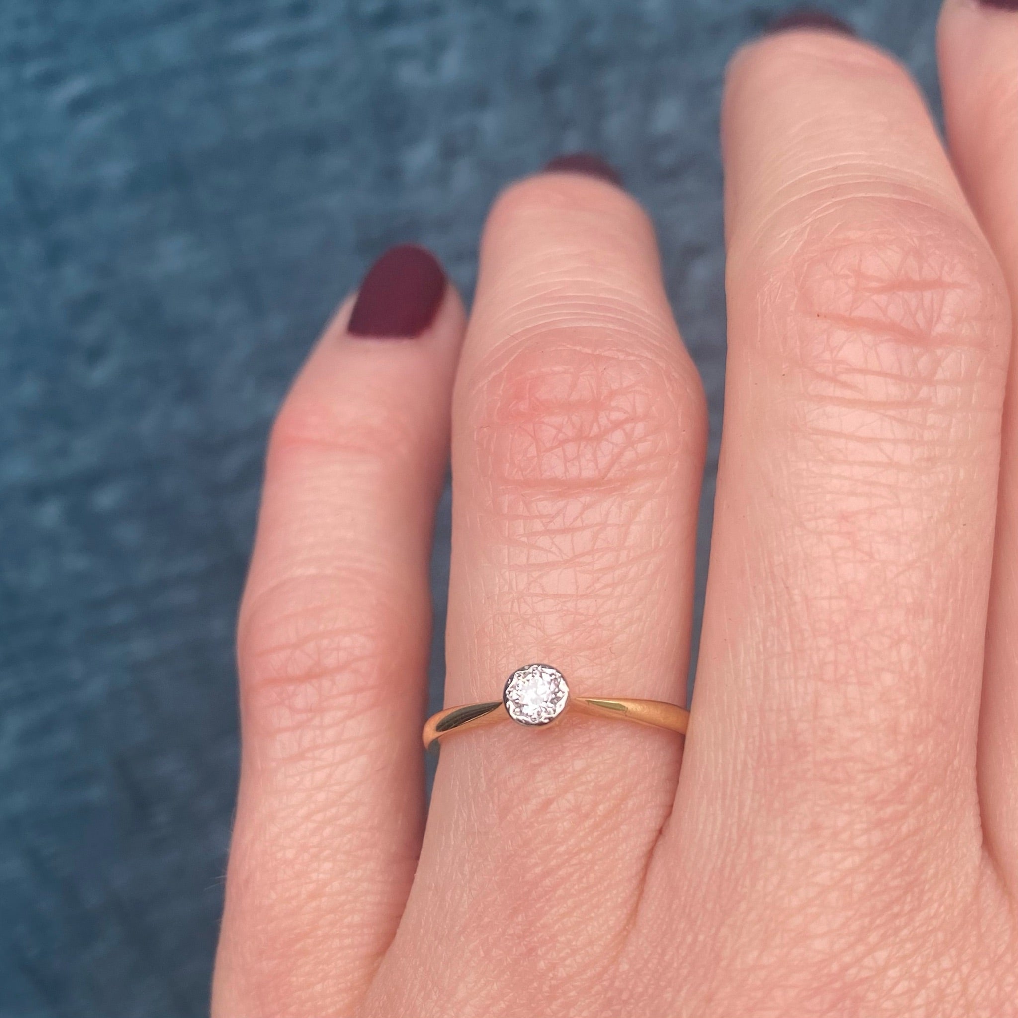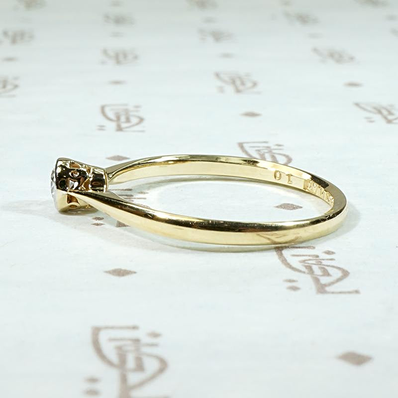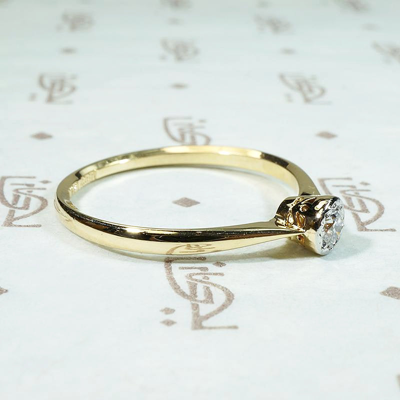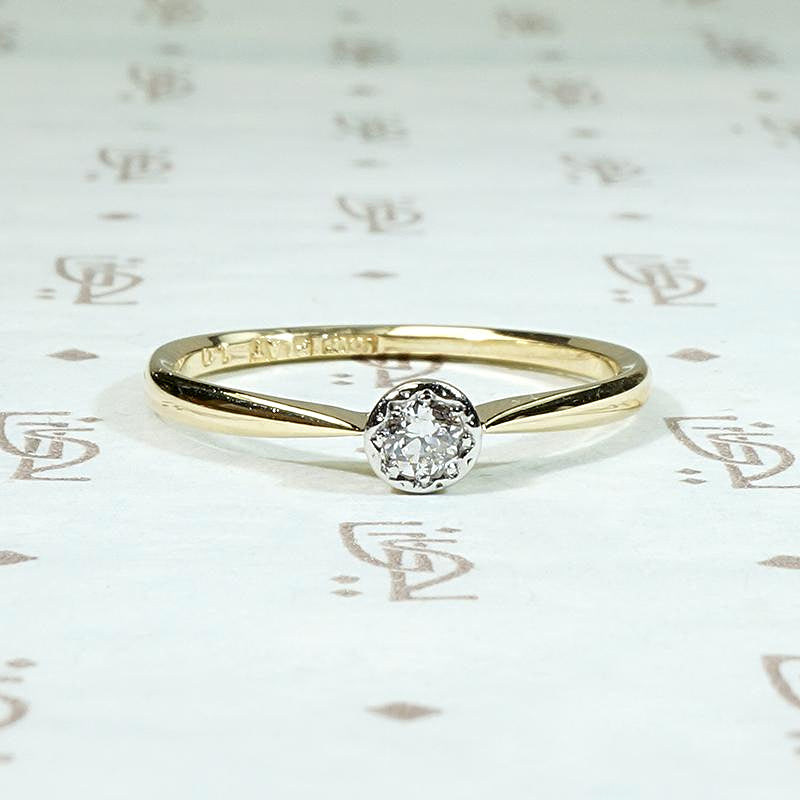 This petite diamond solitaire engagement ring is as sweet and pretty as can be. A 0.15 carat white and sparkly old European cut diamond is displayed in a platinum pie crust bezel. The diamond-set platinum nestles in an 18ct yellow gold head over slim, pinched shoulders and a narrow band. A charming vintage engagement ring, it will look beautiful paired with a wide variety of wedding bands. Circa 1930.