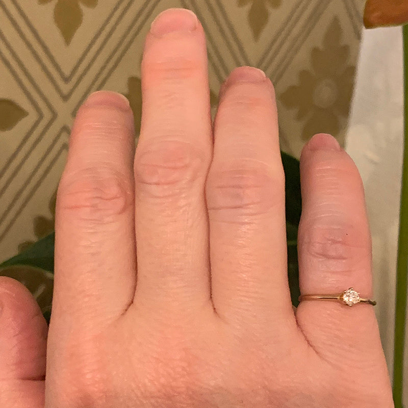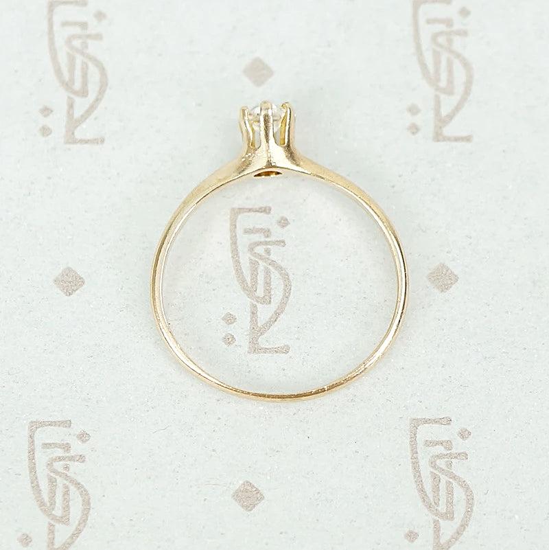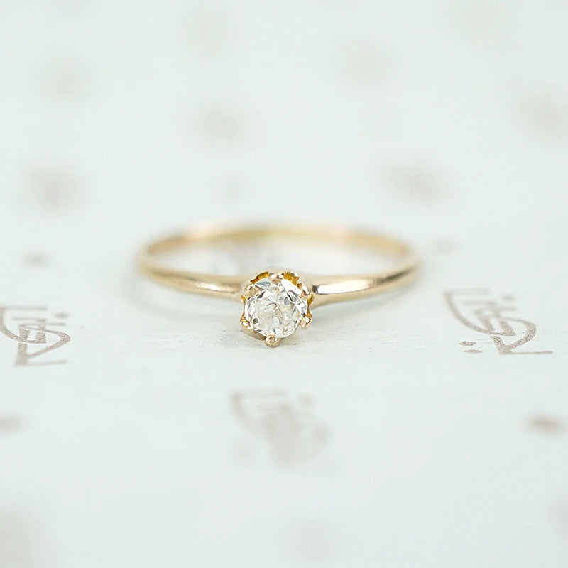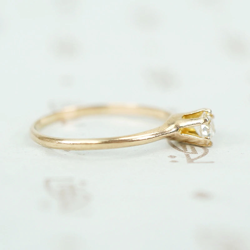 This petite diamond solitaire features a 0.15 carat white and sparkly old european cut diamond prong set in 14k yellow gold. A perfect antique engagement ring, as sweet and pretty as can be. Circa 1900.