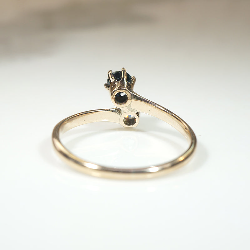 Toi et Moi, French for you and me, so very romantic. This petite double gemstone ring will make your heart skip a beat: a diamond nuzzles a sapphire in a graceful bypass setting. The offset 18k yellow gold band displays the stones, each set in a six-prong head. The .25ct diamond has lots of sparkling charm, and the .38ct sapphire has a deep, moody midnight blue color. The precious stones complement each other perfectly. This would be the sweetest present for the mother of April and September babies. Circa 1900.