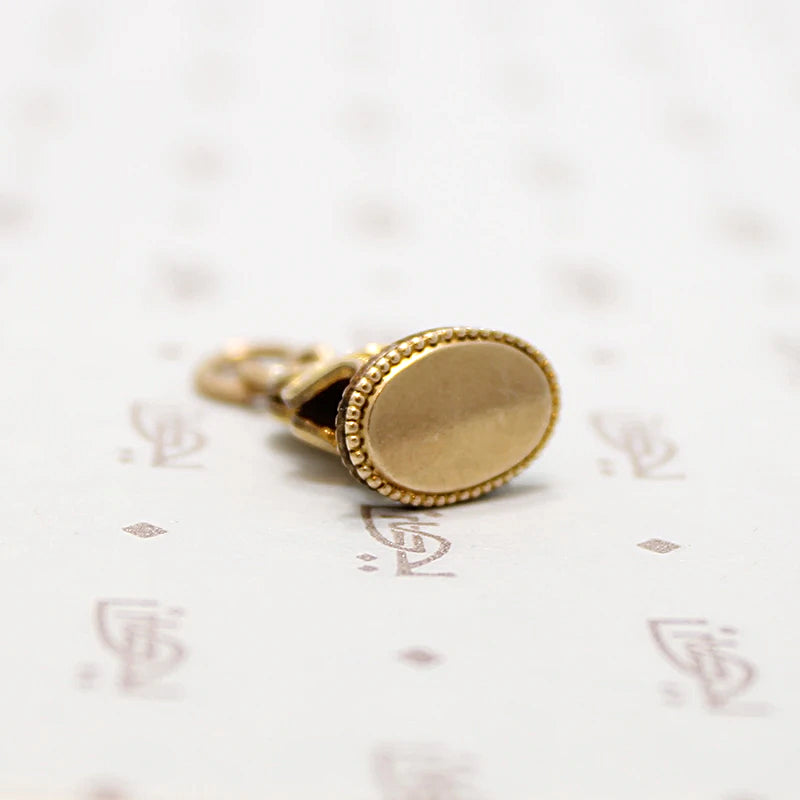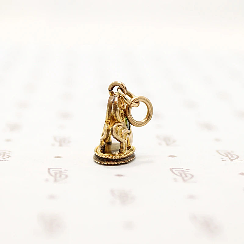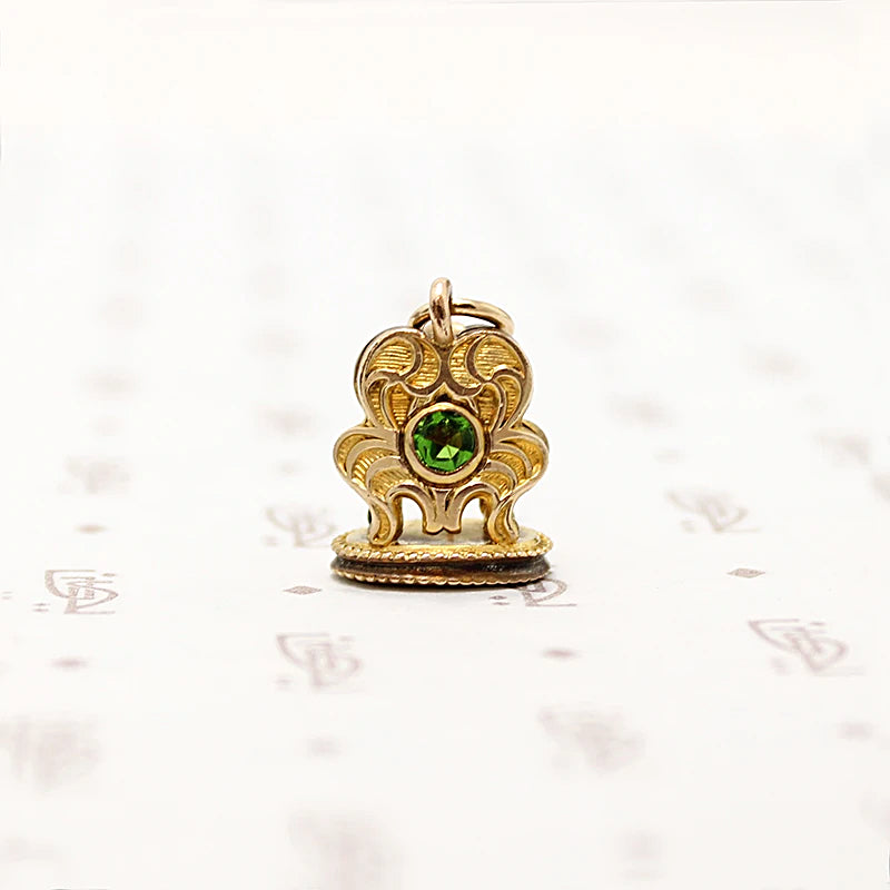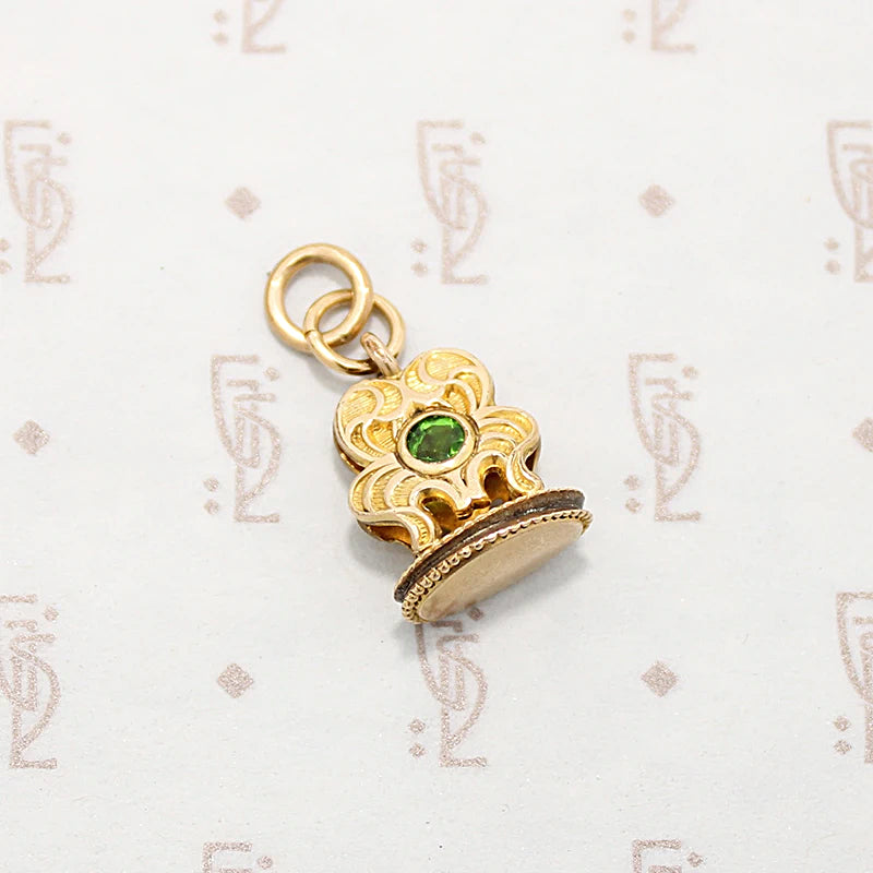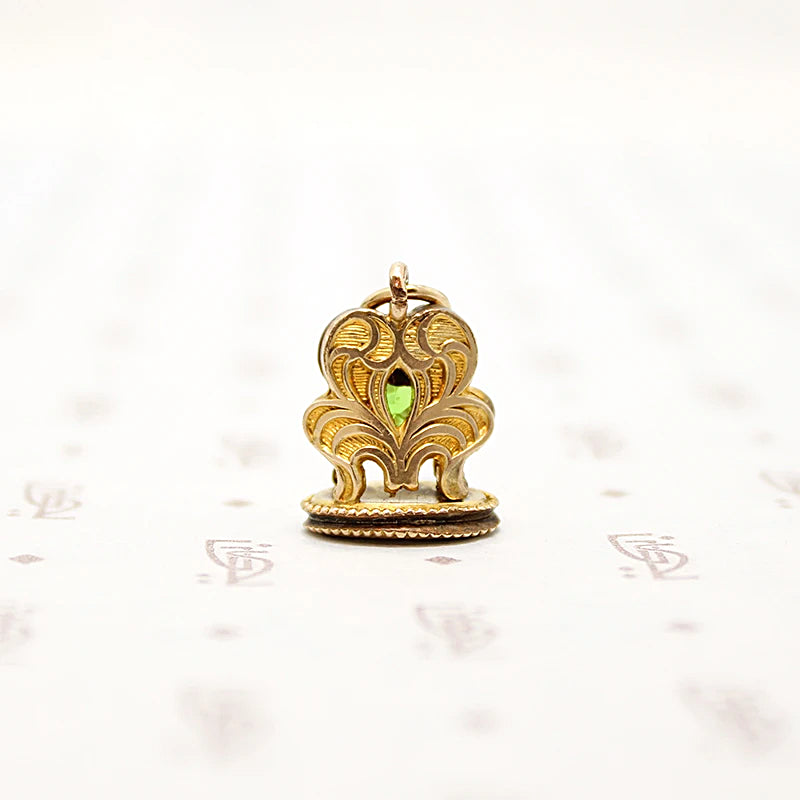 This petite gold filled fob has lovely Art Nouveau design elements, with whiplash lines and a peridot-colored glass gem. That shade of green is so turn of the 20th Century! The base of the fob is beaded around the edge but otherwise unadorned. Wear this pretty little fob as a charm or pendant on one of our Ancient Influences married chains and raise your Chain Game to the next level.