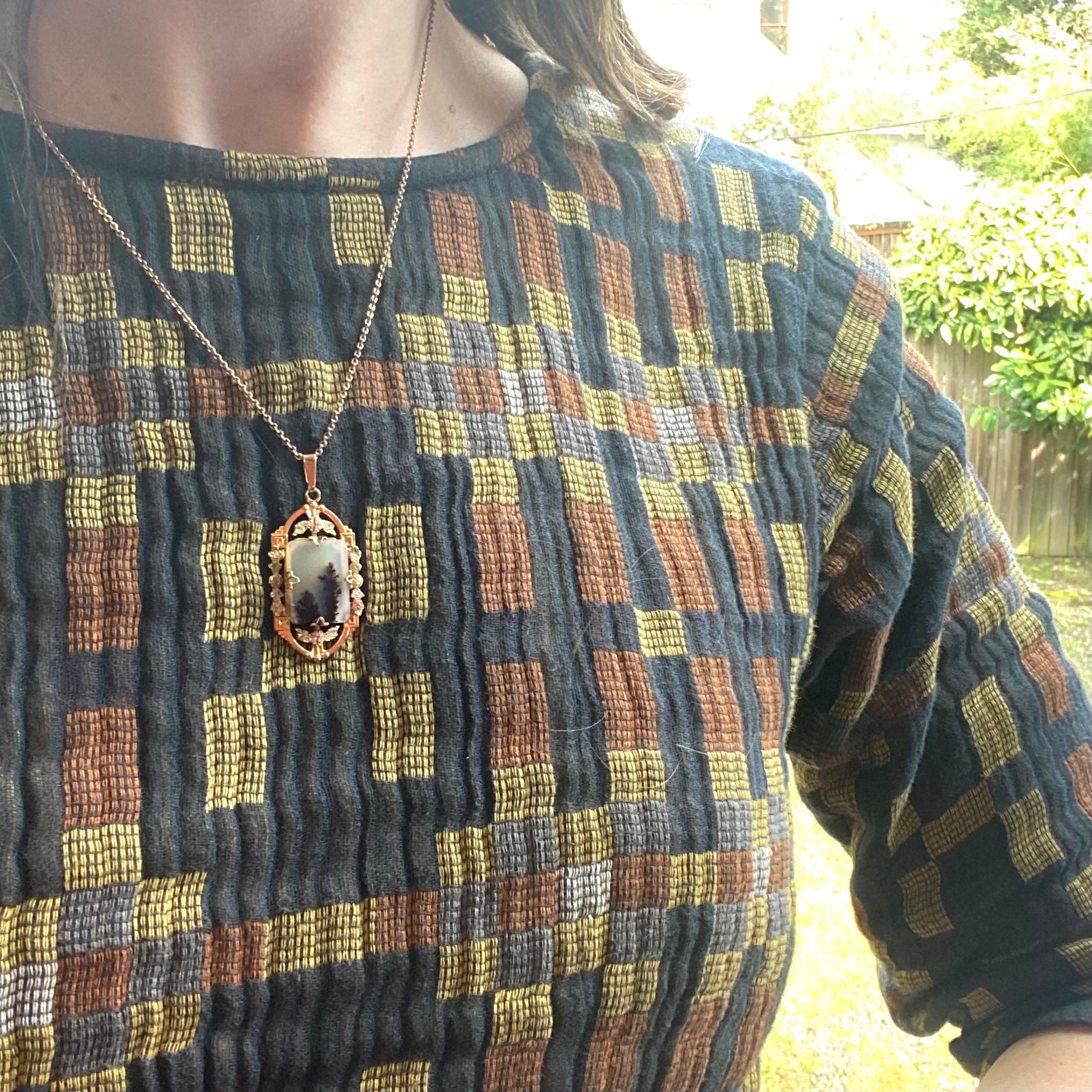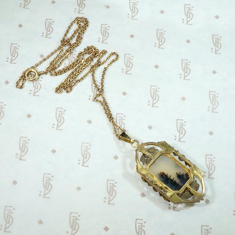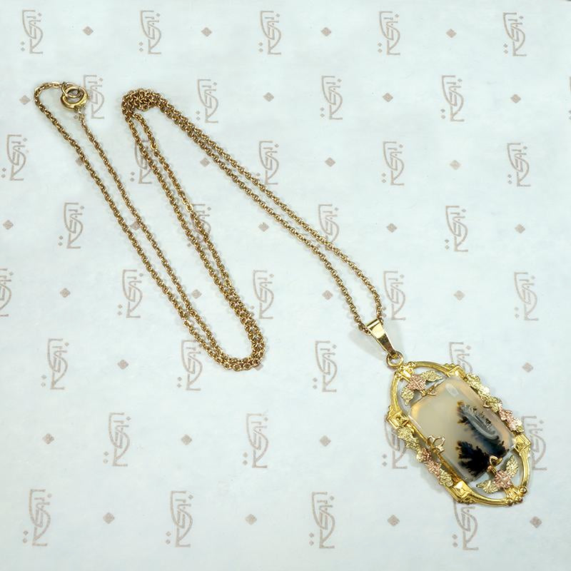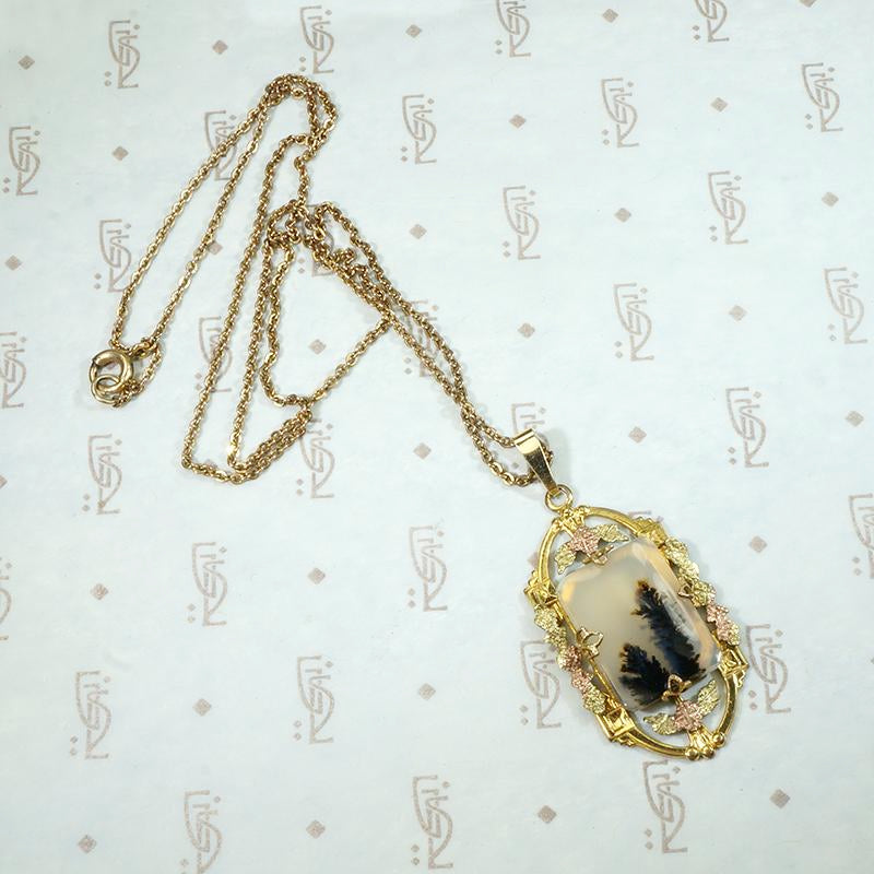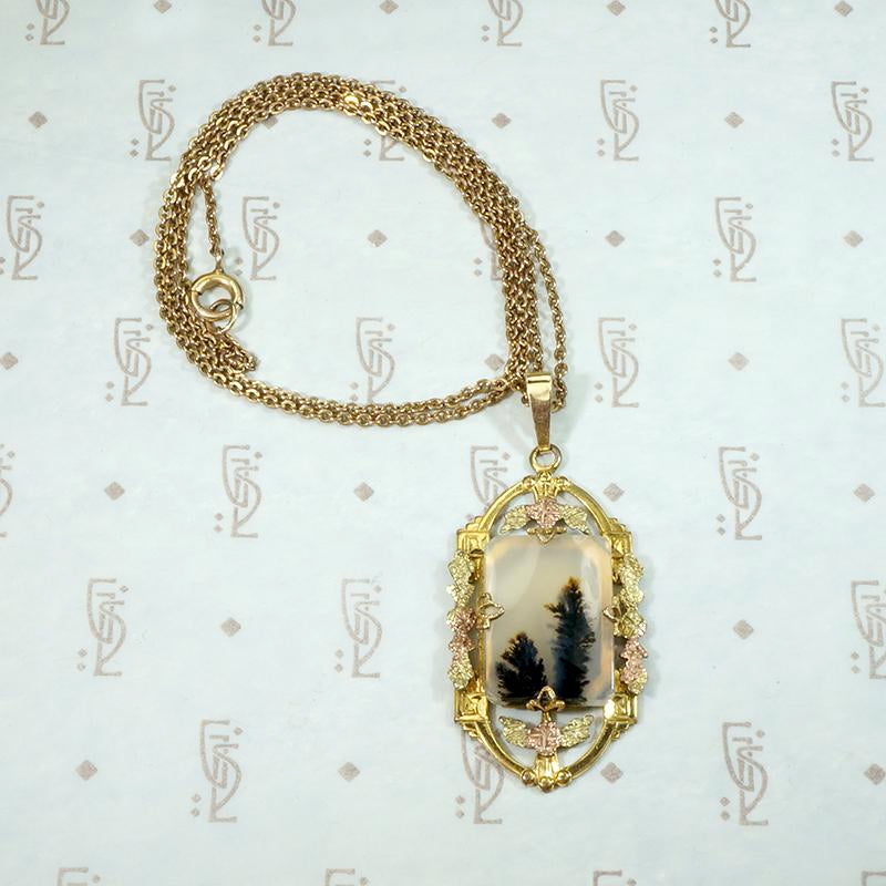 This beautiful vintage necklace features an exquisite picture agate set in an elaborate gold filled frame. A glossy black and cream picture agate that resembles two fir trees in silhouette is held in decorative trefoil tabs. The yellow gold filled frame is decorated with engraved rose and green gold filled leaves and flowers. The pendant depends from a bale and hangs from a vintage gold filled cable chain. This pendant will also look great worn on a ribbon, the generously-sized bale makes it easy to swap the chain for whatever you like. Circa 1920.
