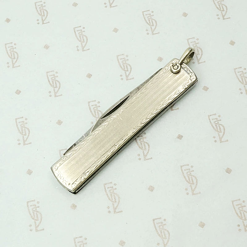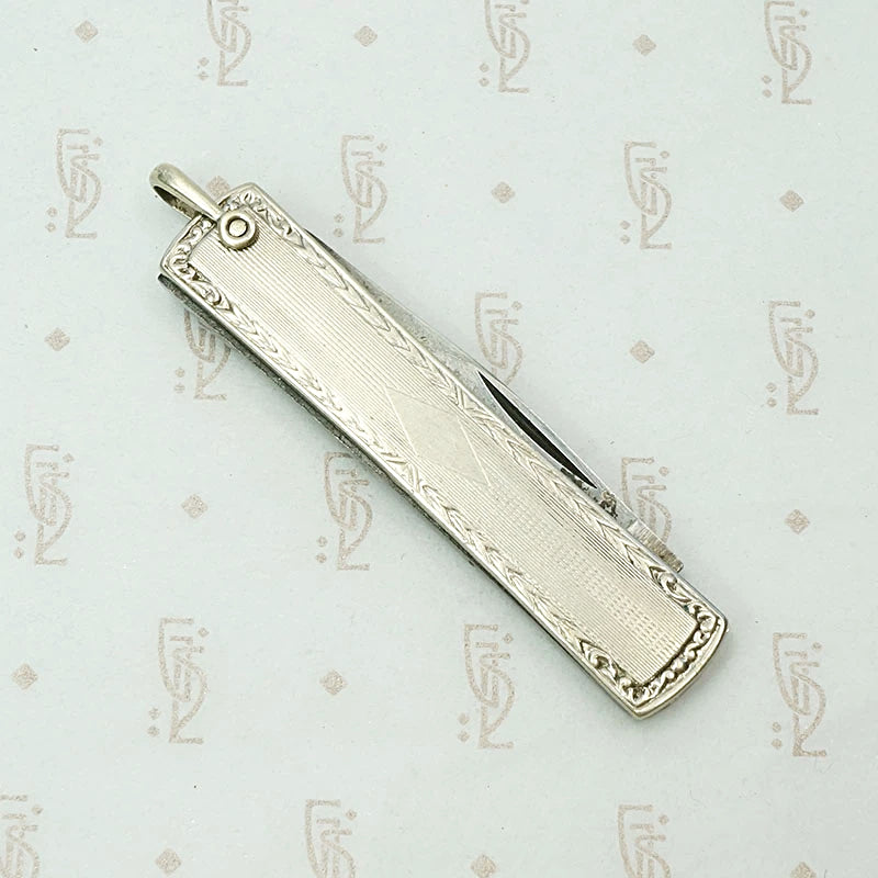 This sterling silver pocket knife is a handsome tool. The knife's covering is engraved with the era's trademark pinstripes. There is a blank diamond shaped panel where you may engrave your initials, should you wish. The covering holds a large blade and a small blade. A swiveling bale completes the piece, allowing you to wear this knife as a pendant if the mood strikes. You never know when you will need a handy blade. Circa 1920.