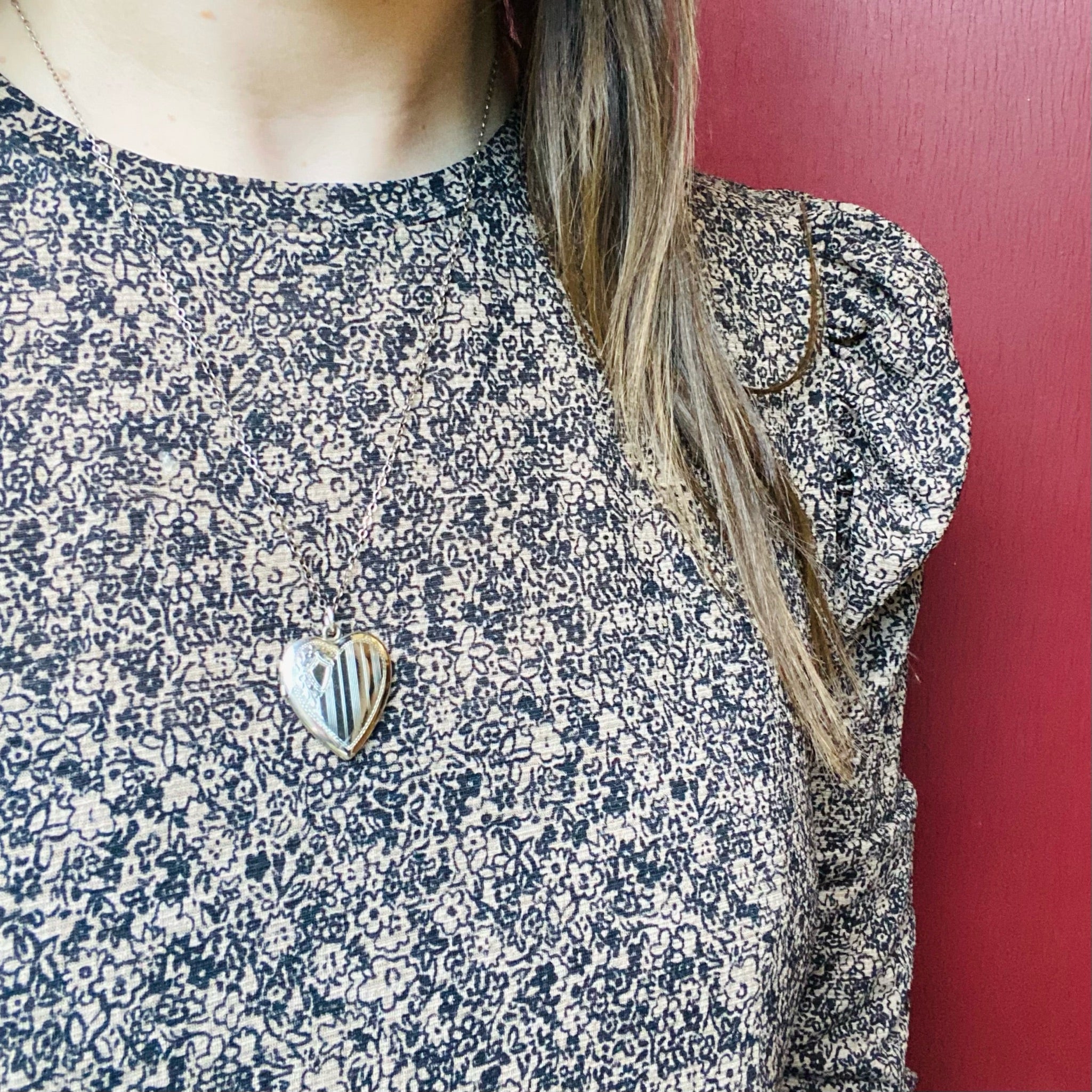 The front of this sterling silver heart locket is engraved with pinstripes and a shield. The shield is perfect for engraving initials or a date. The back is highly polished. The locket snaps tightly shut and has a clean interior with no glass. Circa 1940.