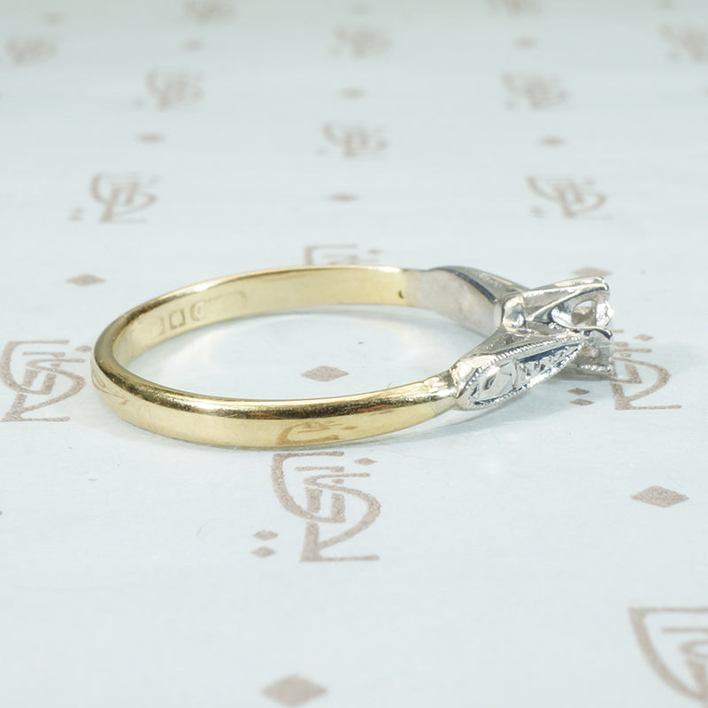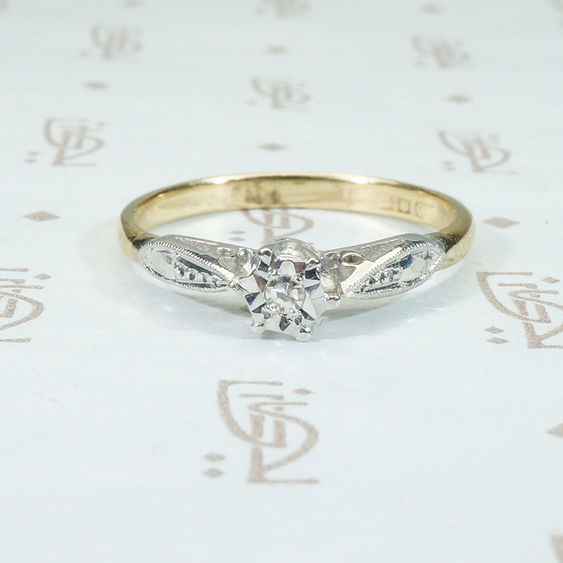 Platinum on 18k yellow gold this vintage engagement ring has a tiny diamond set in the top. The versatility of two tone rings is fabulous, they go with all of your jewelry.